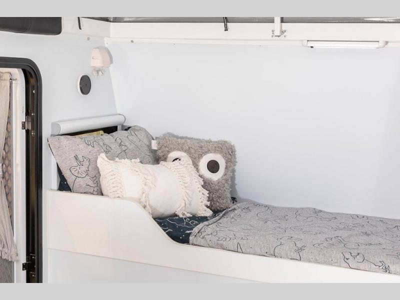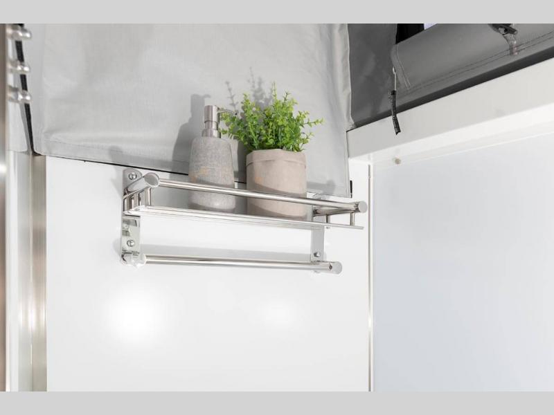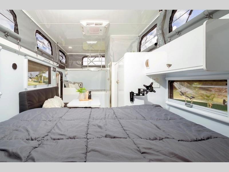For those looking for a simple way to travel on any terrain, check out this model! Don't let the compact design fool you either, this unit is feature-packed with everything you need. Enjoy the exterior slide stainless steel kitchen featuring a three-burner cooktop and sink with hot and cold water. An external refrigerator slide along with storage for all of your gear to be safely tucked away when not in use. The triple-seal hatches assure that things will stay clean during travel. You will also appreciate the exterior electric awning to provide outdoor cover while cooking and relaxing. On the inside, a large sleeping area featuring a custom pillow-top Olympic queen mattress for a great night's rest. You will also find a wet bath for added convenience!