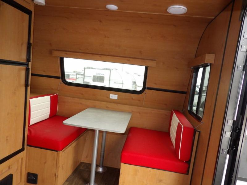 The 2023 Old School Trailers 820FTG is a travel trailer with a dry weight of 3160 lbs, a length of 21 ft 9 in, and can sleep up to 4 people. It features a walk-around queen bed, a front dinette, and a dry bath. The 820FTG also includes an outside shower. It has a 28-gallon fresh water tank, 32-gallon gray water tank, and 32-gallon black water tank. The water heater capacity is 6 gallons.