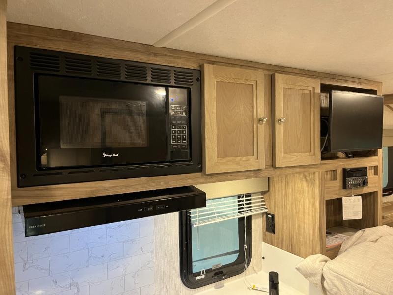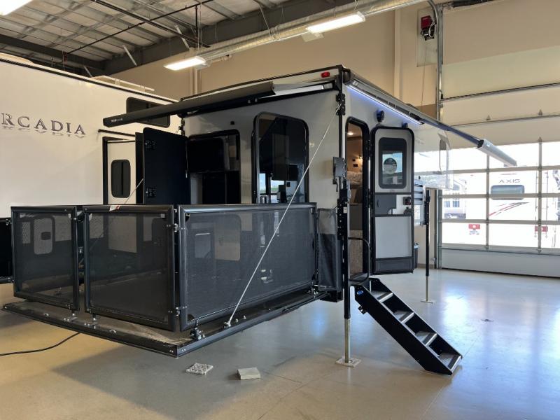 This hard side truck camper is decked out in features you will love! The 8' x 7' fold-down patio includes an outside kitchen so you can spend more time enjoying the fresh air, and the 68" sofa inside provides a place to relax with a good book. The indoor kitchen comes with a microwave oven, a 6 cu. ft. 2-way refrigerator, plus a cooktop to prepare at-home meals. After you've spent your day outdoors, you can clean up in the wet bath, then head to bed on the front queen bed. You'll be pleased to find a wrap-around nightstand, two storage chests, a closet, plus a TV! How convenient!