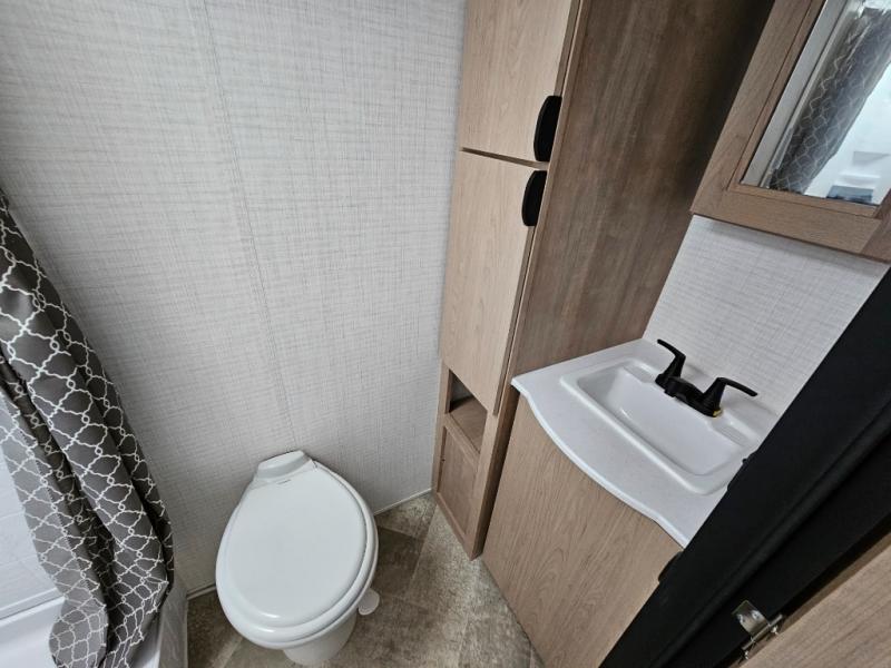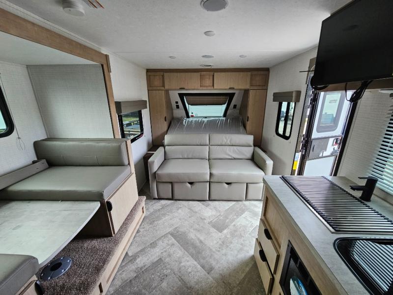 Head to your favorite spot with your favorite person in this travel trailer! The front Murphy bed offers versatility with a sofa to sit on during the day and a 60" x 80" queen bed to sleep on at night, plus there are wardrobes on either side for your clothes. Prepare your best home cooked meals with the two burner cooktop, 10 cu. ft. refrigerator, and even the microwave then enjoy them at the 38" x 70" booth dinette slide which can be transformed into an extra sleeping space. You even have an entertainment center for those days when mother nature rains on your parade. The full rear bathroom has a 32" x 32" radius shower to clean up in after a fun day at the beach and a linen closet to keep your towels close. The exterior has a 14' power awning with LED lights to highlight the good times and front outside storage to bring all of your camping necessities!
