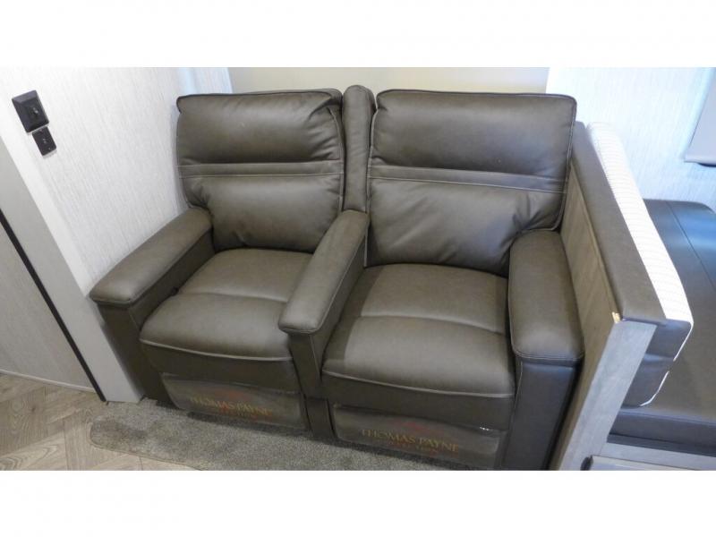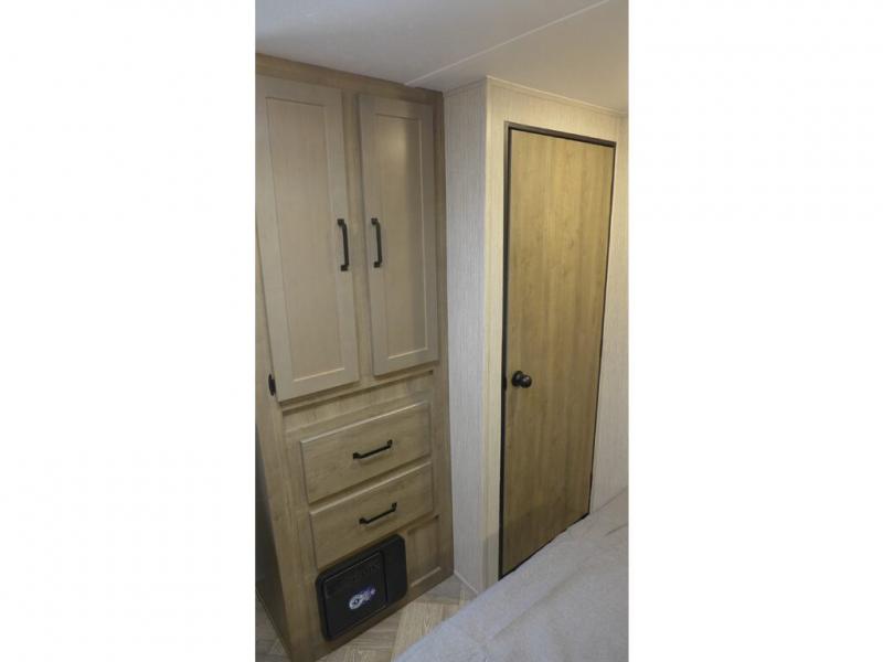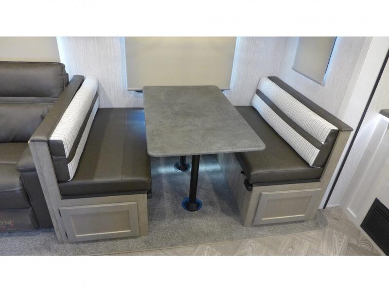 Walk into this travel trailer with one of the dual entry doors for a great camping trip! One entrance enters directly into the rear private bedroom which has a queen bed slide, a walk-in closet that is prepped for an optional washer and dryer, a wardrobe, and even an entrance into the dual entry bathroom. Grab a snack from the walk-in pantry then relax on the sofa while you watch a movie with the entertainment center or play a game at the booth dinette. The front kitchen has everything you will need to prepare your best home cooked meals including lots of countertop space, and you could even add an optional exterior micro kitchen with griddle for dinner outdoors!