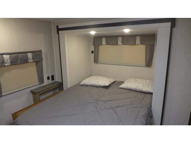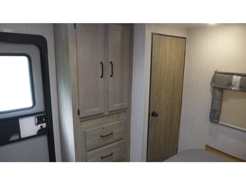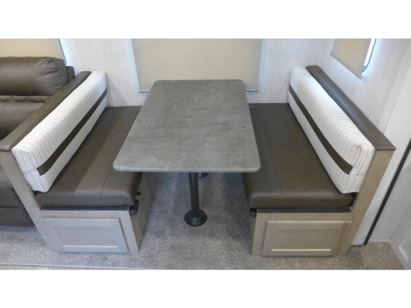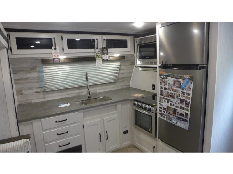 Walk into this travel trailer with one of the dual entry doors for a great camping trip! One entrance enters directly into the rear private bedroom which has a queen bed slide, a walk-in closet that is prepped for an optional washer and dryer, a wardrobe, and even an entrance into the dual entry bathroom. Grab a snack from the walk-in pantry then relax on the sofa while you watch a movie with the entertainment center or play a game at the booth dinette. The front kitchen has everything you will need to prepare your best home cooked meals including lots of countertop space, a three burner cooktop, and a residential refrigerator!