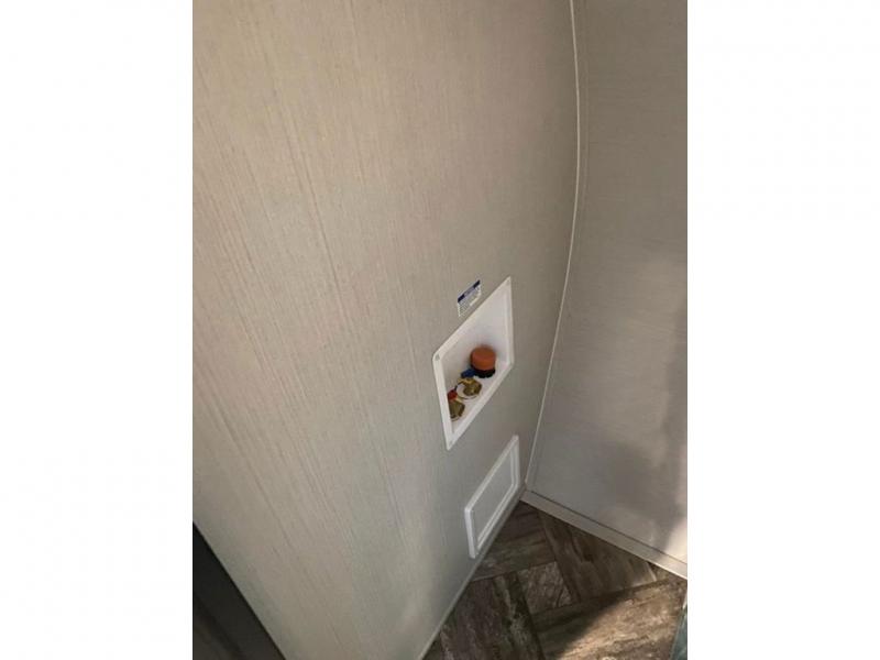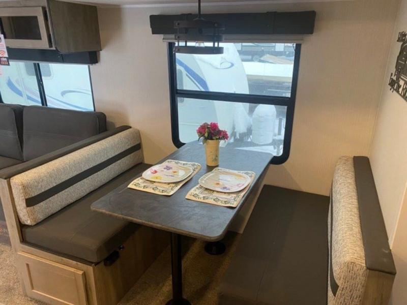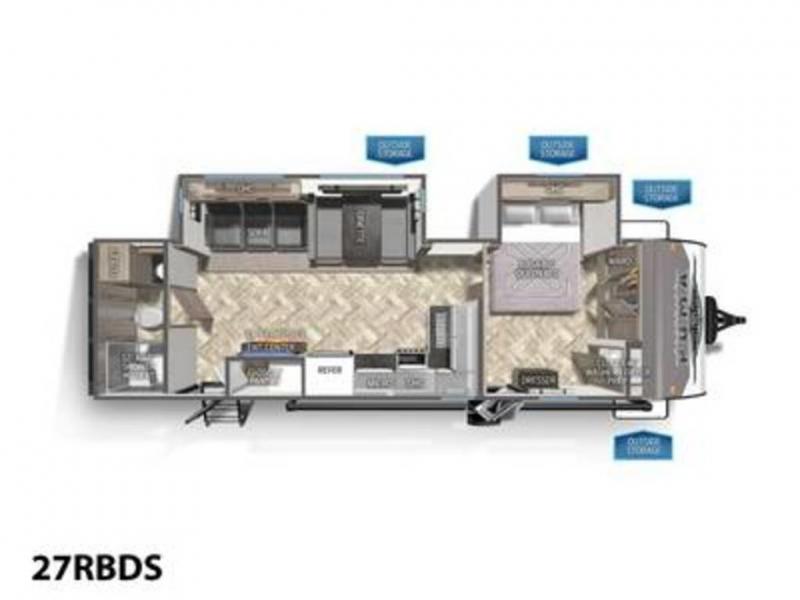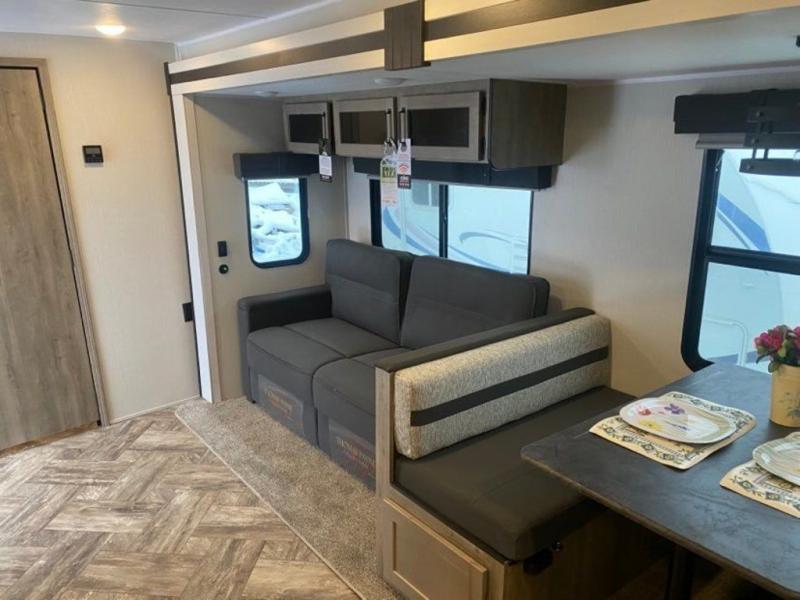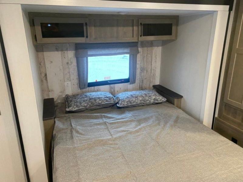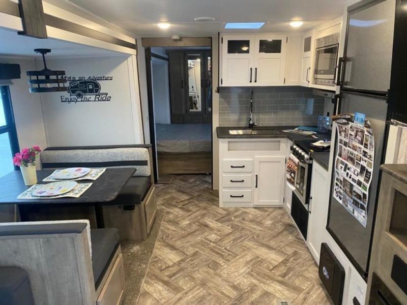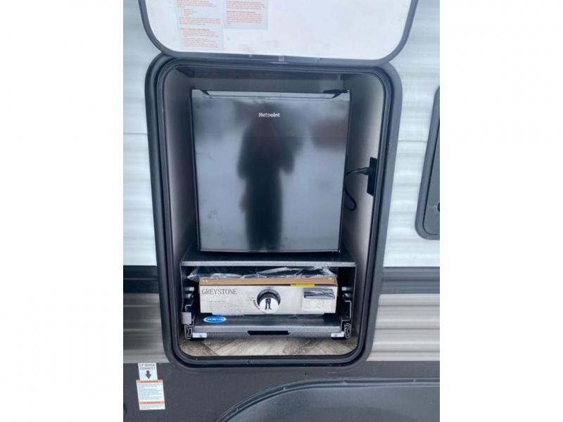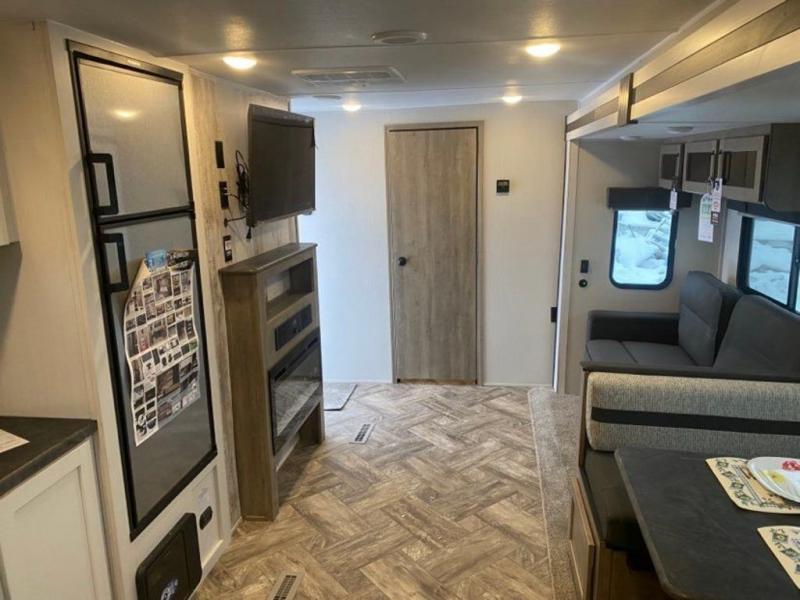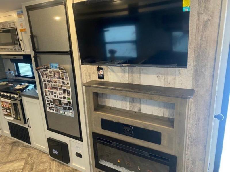 Head to the lake in this double slide out travel trailer that can sleep five each night. You will love having the front private bedroom all to yourselves that includes a queen bed slide out, a front wardrobe, a closet with washer and dryer prep, plus your own exterior entry door. Your guests can sleep on the sofa and booth dinette within the second slide out, and the full rear bath is tucked away for privacy. This model also includes an entryway closet/pantry for food storage and jackets, and you can add the optional fireplace across from the sofa for a more cozy space.