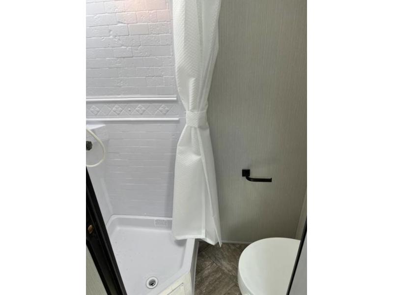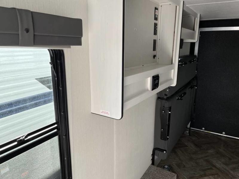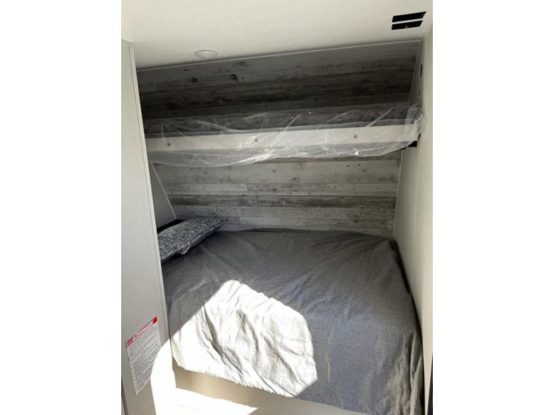 Ramp up the fun in this travel trailer toy hauler! You can easily load your toy(s) in the 14'9" of cargo space with different widths depending how much space you need. After unloading, this area will become your living and kitchen combined space. There is a two-burner cooktop, a residential refrigerator, and counter space for the cook plus you can relax on the rollover sleeper sofa on the opposite side until someone needs this for their sleeping arrangements. The bathroom includes a toilet and shower to clean off the dirt from the ride, and the front offers a queen bed with bunk above.