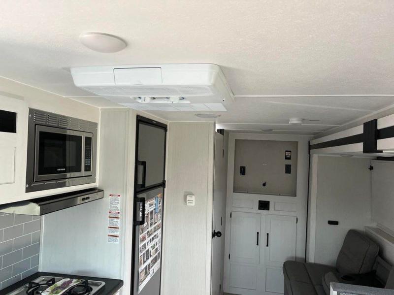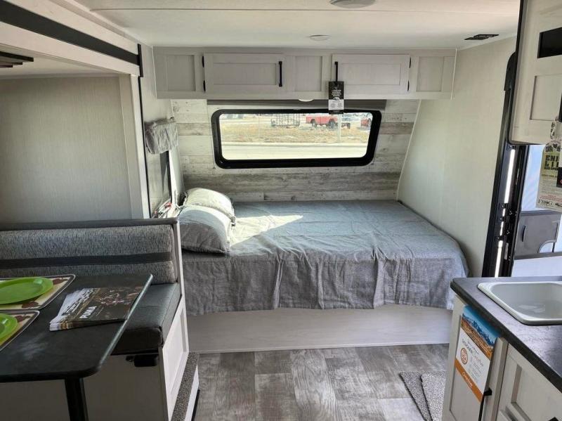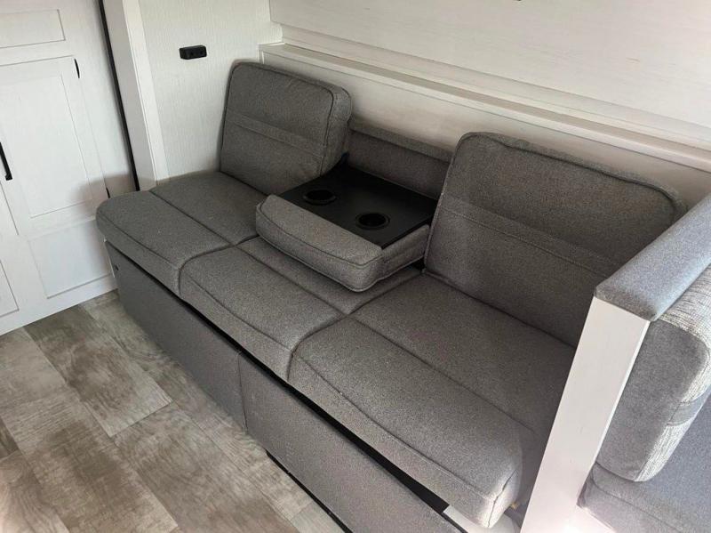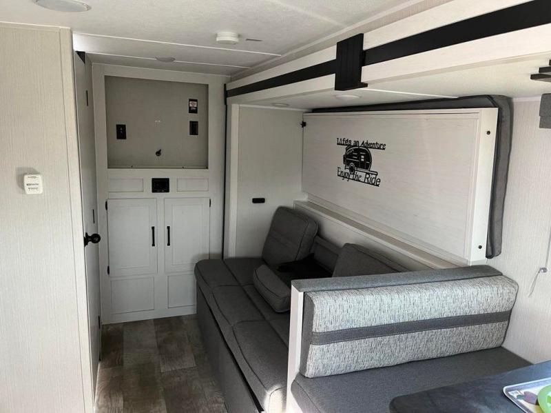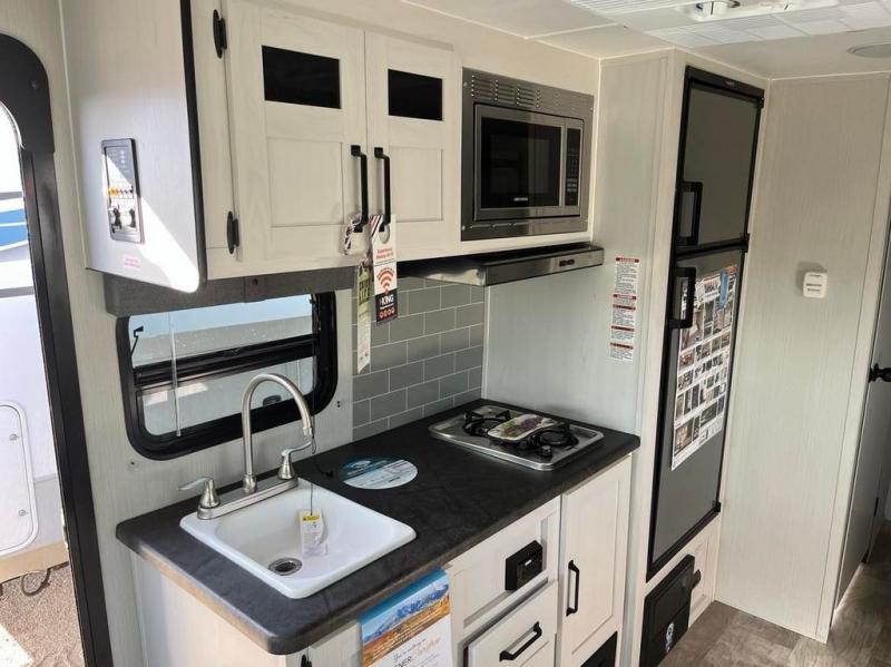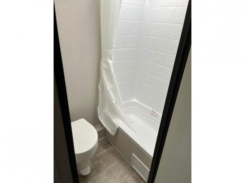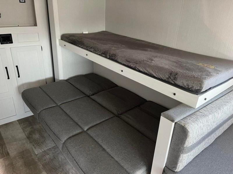 Looking for a family trailer, couples retreat or even an RV that gives you choices to have overnight guests, you have found it! There is a galley kitchen with a residential refrigerator, a two-burner cooktop and a stainless steel microwave for the cook to be able to whip up meals for anyone. And the large slide out provides more interior floor space to move about plus includes a booth dinette and sofa with a flip-down bunk. The shower/tub and toilet room provide privacy, and the RV queen bed up front gives you your own sleeping space at night with a nightstand end table to place your keys and cellphones.