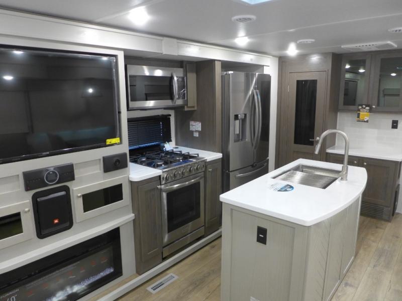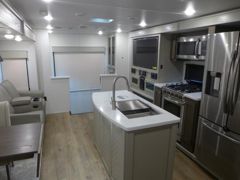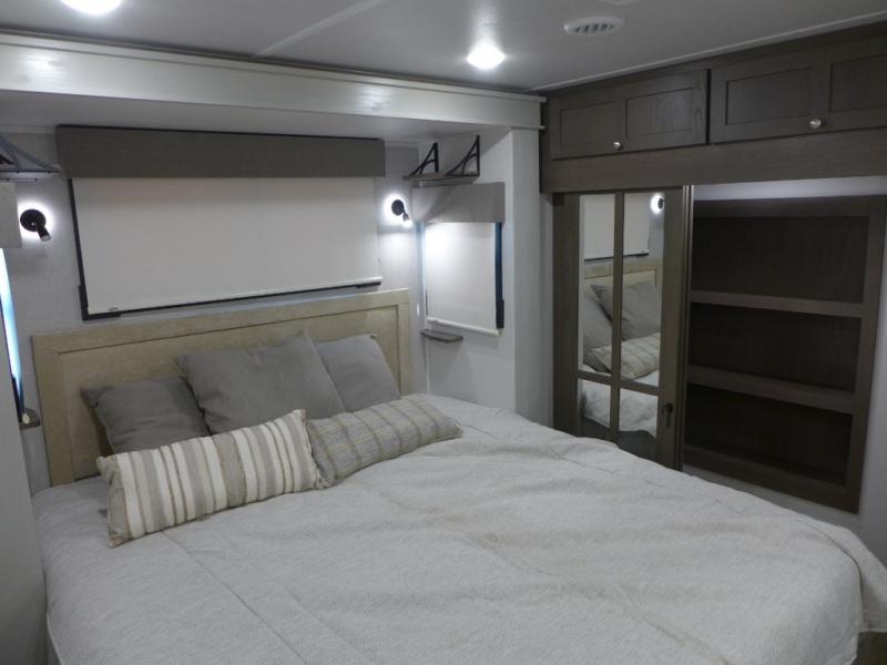 With any River Ranch fifth wheel by Palomino, you will love the practical living, the storage, the tow ability, and the lavish style in each luxury RV! There is a 7' interior height and a 101" wide body for added space, plus frameless windows, worry-free composite floors, and vacuum bonded walls with Azdel for durability. The River Package is a mandatory option you'll love having with features such as, a touch screen control operating system, a MORryde LRE4000 suspension, and three A/C's units with an energy management system. These fifth wheels also include the Ranch Package that comes with a memory foam mattress, stainless steel residential appliance package, MCD day/night roller shades, plus a JBL sound system. There's many more features to love about the River Ranch fifth wheels, like the upgraded true solid surface countertops, the French mirrored sliding closet doors, and the painted fiberglass front cap!