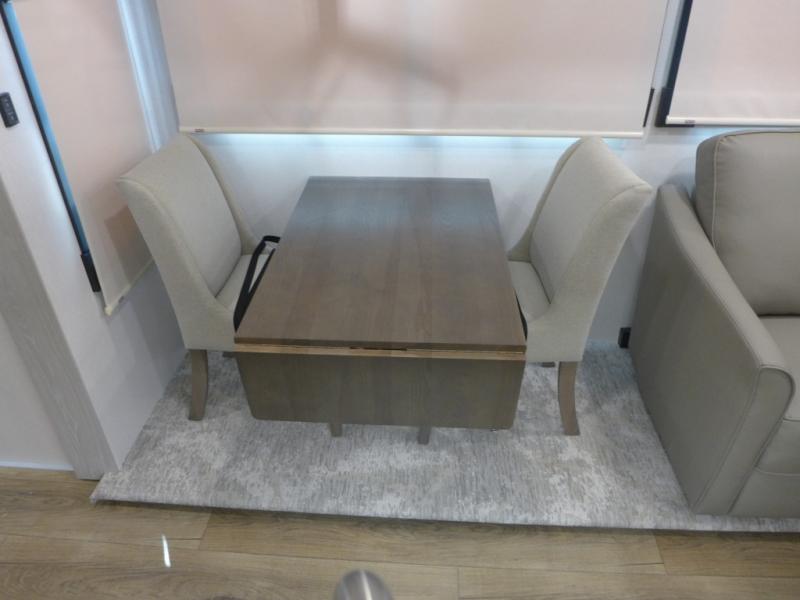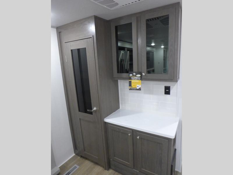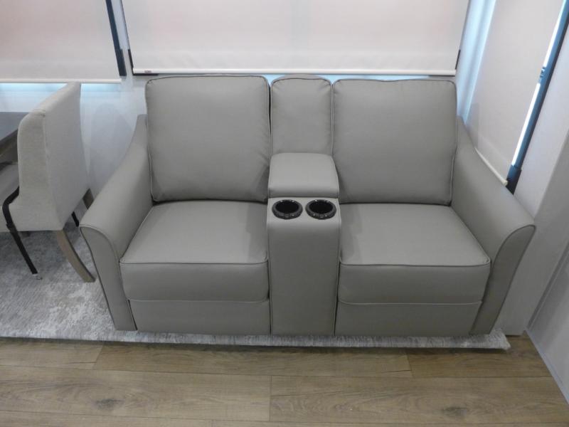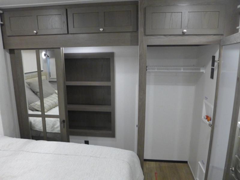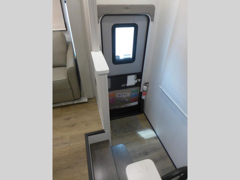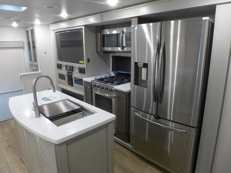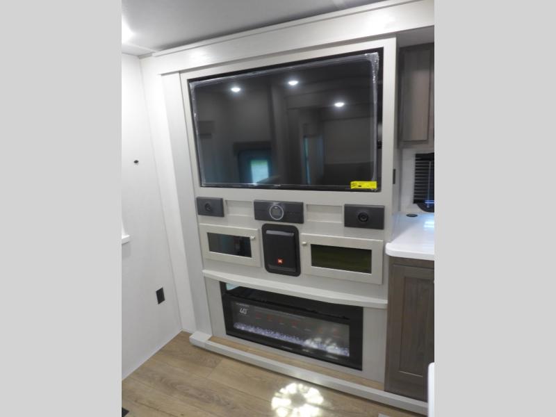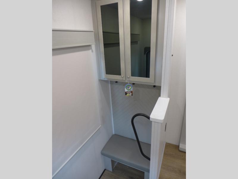 This shortest River Ranch floorplan will be easy to tow and easy to love. There is a unique rear mudroom with coat and shoe storage, a bench seat with flip-up storage, plus overhead cabinets for belongings. When you enter the main living and kitchen area you'll find a free-standing table and chairs, a theater seat across from the entertainment center and fireplace, plus a kitchen island the chef is sure to love. They will also have an Insignia four burner gas cooktop and 30" residential microwave to cook on, and a pantry to store dry goods and snacks. The spacious full bath includes a shower with a seat, and the front private bedroom includes a king bed, a large wardrobe, plus a bedroom fireplace and 32" pop-up TV. Now, that's what I call luxury!