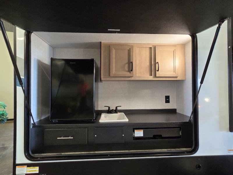 This travel trailer offers so many features that you will love from having a private bunkhouse to be able to offer private space for overnight guests to having three slide outs giving you a spacious interior throughout! The bunkhouse includes two bunks, a sofa sleeper with dual ottomans and an entertainment center. The full bathroom is centrally located for all to access from the main living and kitchen area where you will find a slide out that includes a booth dinette and a sofa sleeper or choose the theater seating option. The cook will love the kitchen amenities such as the microwave, the glass top flush mount range, the 11 cu. ft. refrigerator, and the L-shaped counter for preparing and serving meals. And they have the choice of making meals using the outside kitchen.