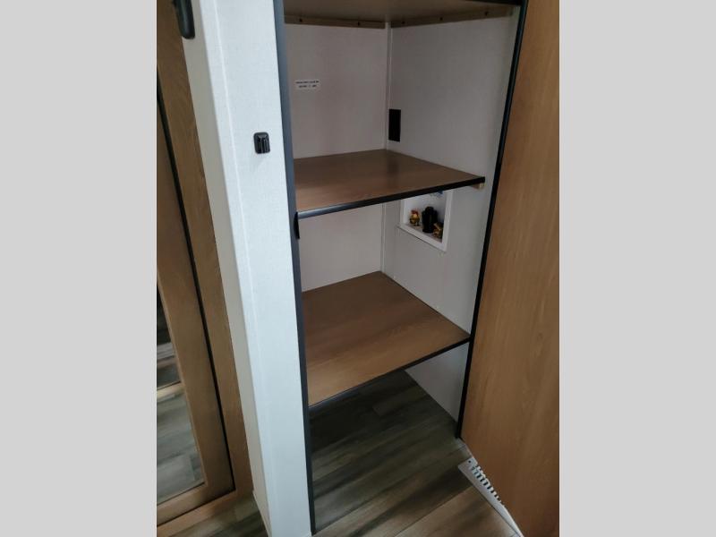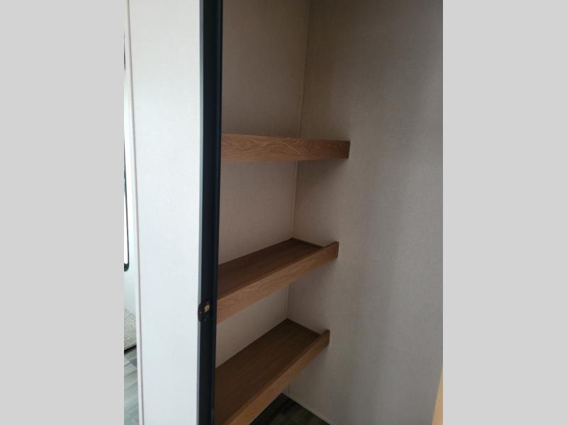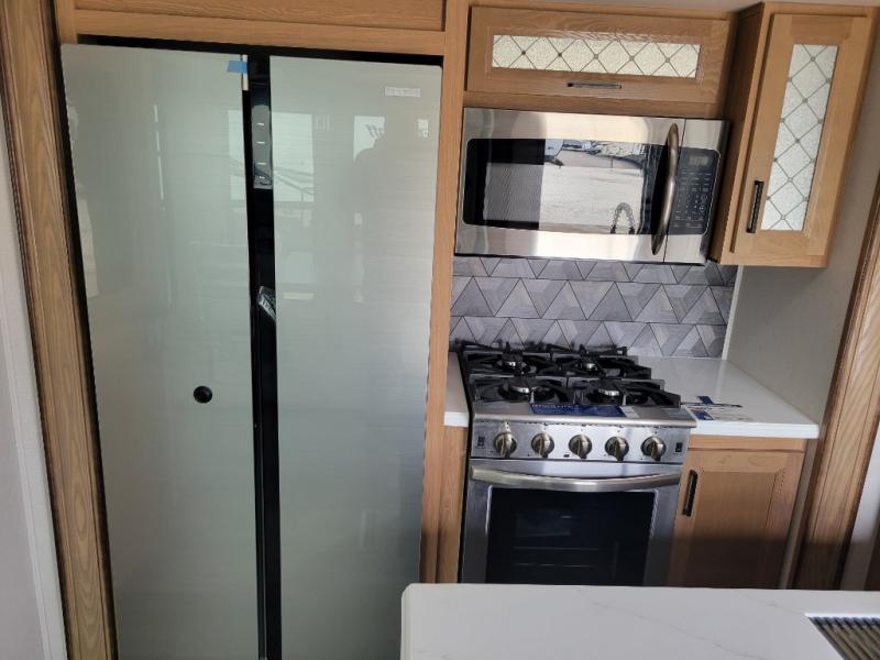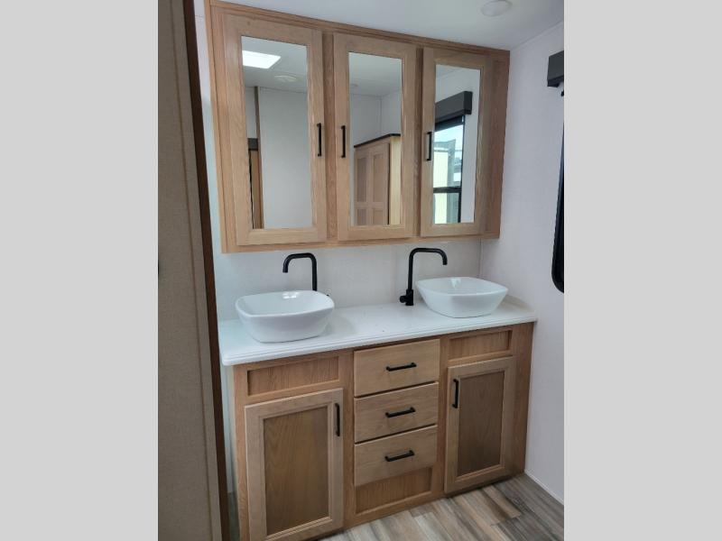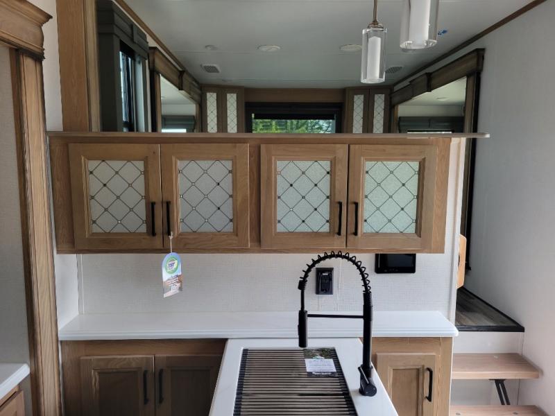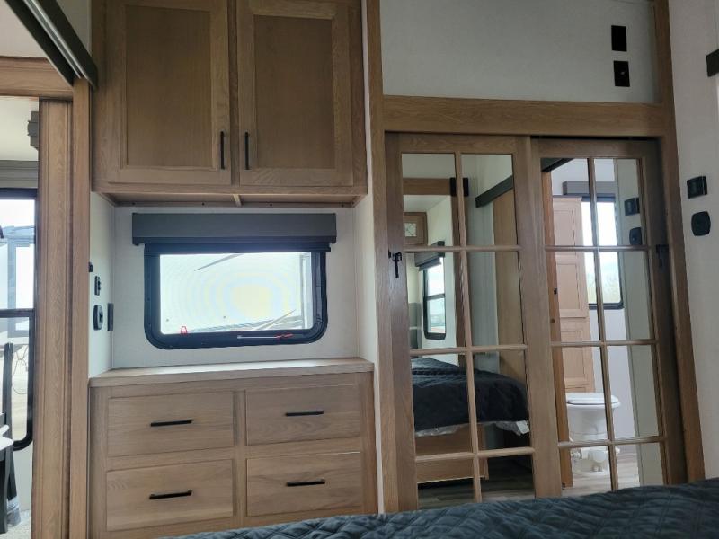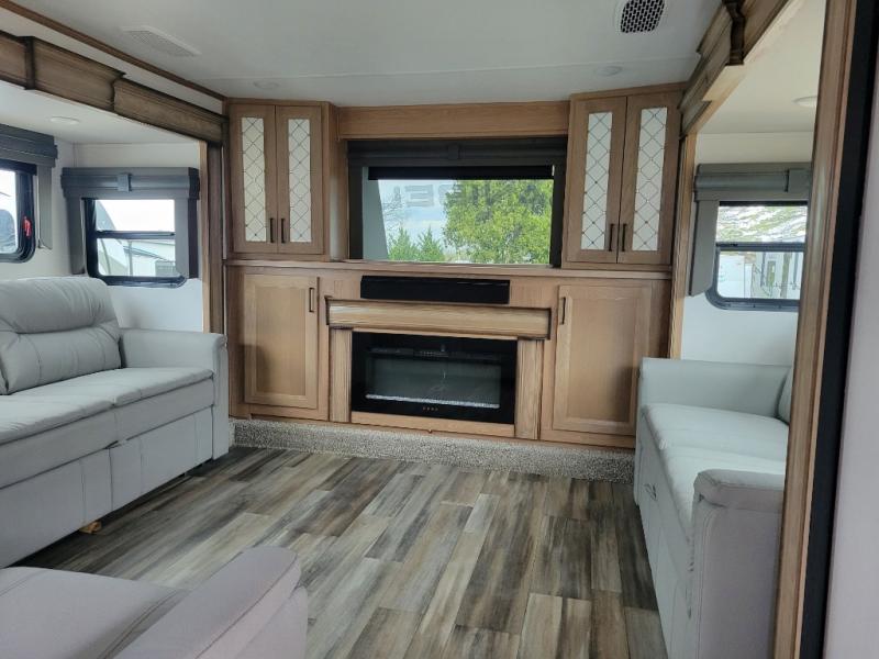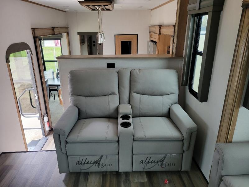 Experience a home away from home with this fifth wheel! The front living area has opposing EZ glide couches and 65" power theater seating across from the front entertainment center with a fireplace and 50" LED pop-up TV to watch your favorite movies. Just grab a snack from the walk-in pantry, pop a bag of popcorn in the microwave, and grab a cold drink from the 15 cu. ft. residential refrigerator then you're all set. The private bedroom has a 72" x 80" king bed slide for more walking around space and a dresser with wardrobes on either side to keep your clothes looking nice, plus it leads directly into the full rear bathroom. Two can get ready at once in the bathroom with the dual sink vanity and there is a linen closet for your towels, plus a second linen closet that is prepped to add an optional washer and dryer so you can extend your trip with clean clothes!