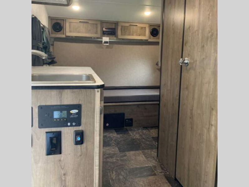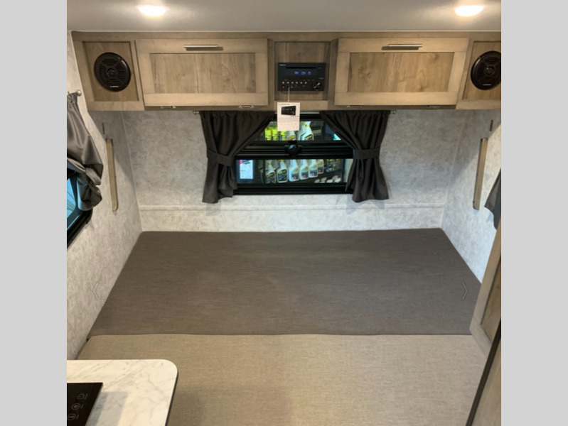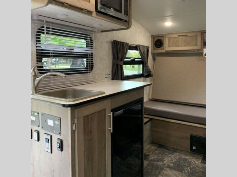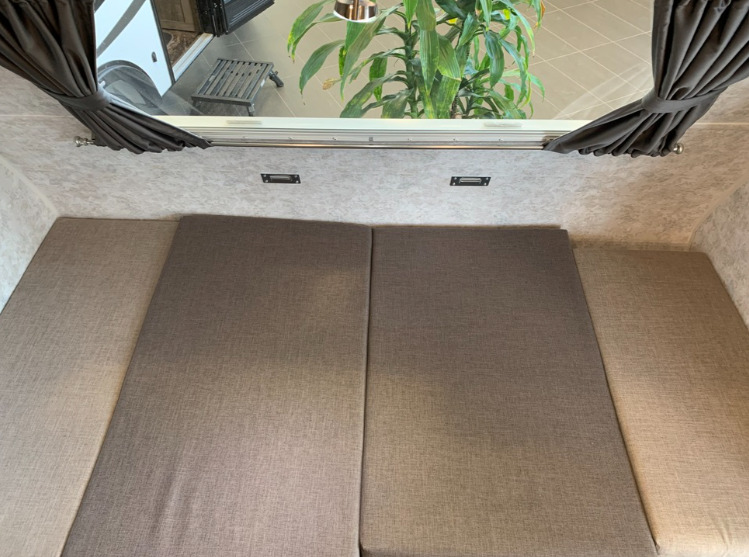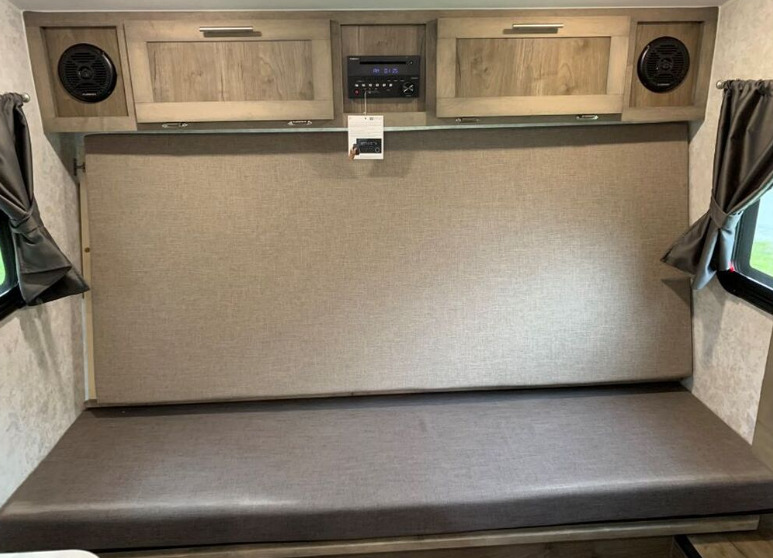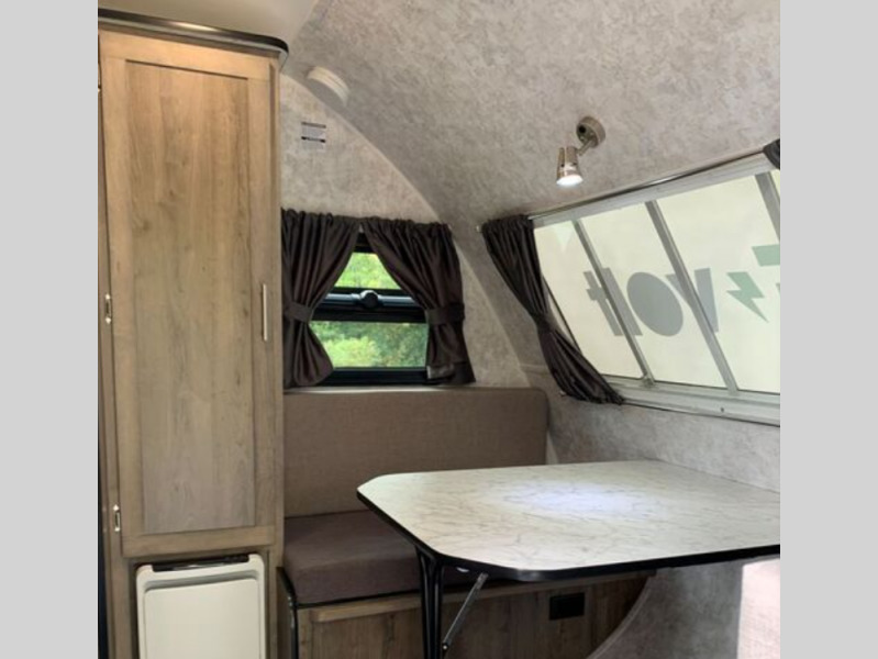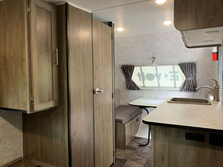 The E-Volt is fully electric and uses renewable energy with its four 100-watt solar panels, its 3,000-watt inverter and its powerful 250-amp lithium battery. The E-Volt converts your 12-volt energy into electrical power so you can use the appliances to make meals while camping. The induction cooktop, the microwave, the 3.2 cu. ft. 110-volt electric refrigerator, the sink, and the fan come standard as well as the integrated electric heater. You will find sleeping space for three with the 72" x 74" sofa bed, and the banquette once set up for night. And most SUVs and vans can tow the E-Volt. You might even like to add a few options such as an air conditioner and a radio for more comforts.