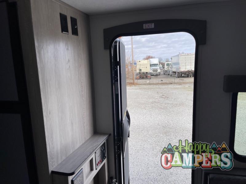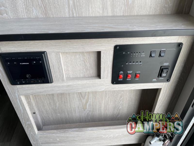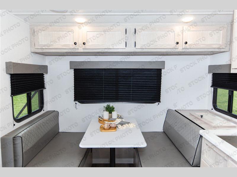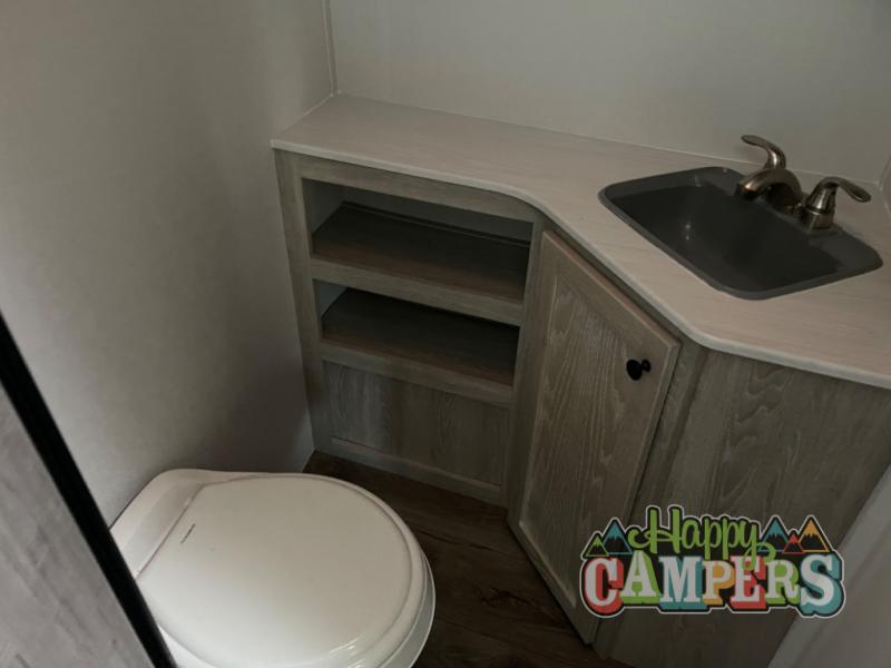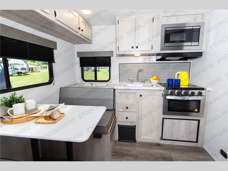 You'll be impressed with the features found in this single-axle travel trailer. The front bedroom includes an RV queen bed for a great night's rest, and there is a bedroom overhead cabinet for your things. The private toilet and sink are right across from the shower so two people can freshen up at once, and there is a rear booth dinette that will be perfect for meal times and additional sleeping space. This model also includes a kitchen to prepare meals each day, and you'll find a 10' patio awning outdoors to park your chairs under.