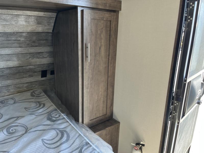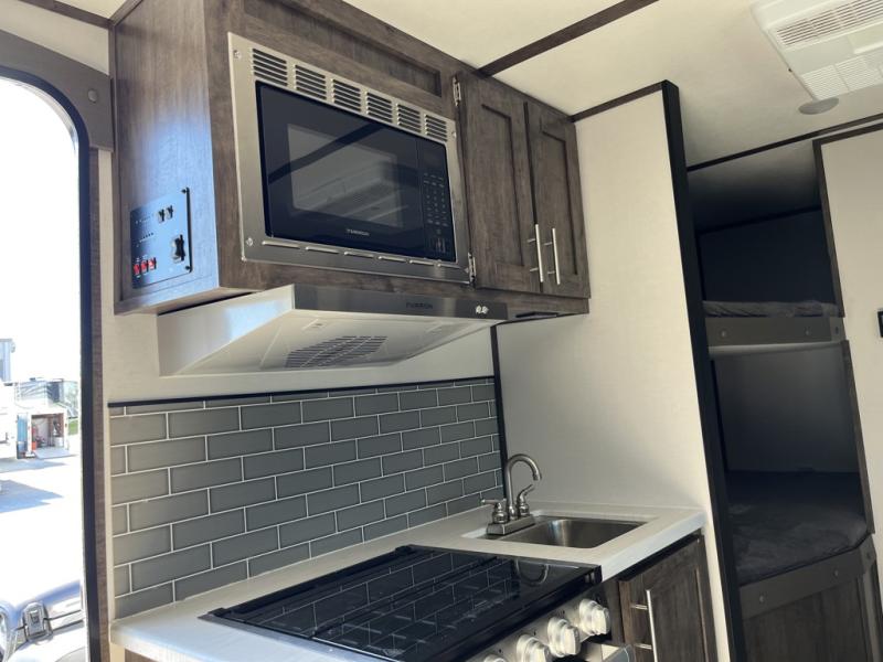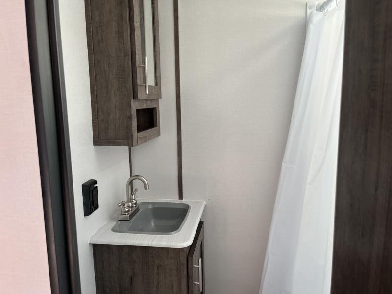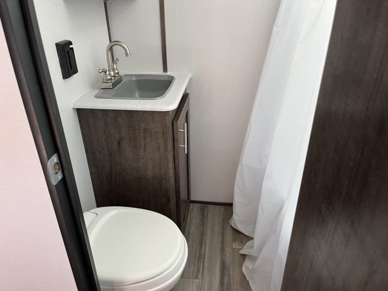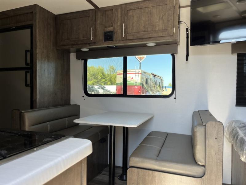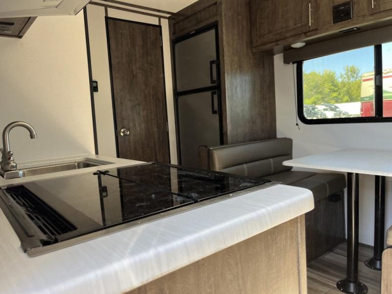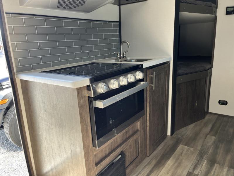 The whole family will love camping in this travel trailer that can sleep five each night thanks to the added bunk beds. You will have the RV queen bed up front to yourselves, plus there is a booth dinette for dining and additional sleeping space. A four burner cooktop will allow you to cook up your best meals, and the full bath is sure to come in handy after a day outdoors hiking or biking.