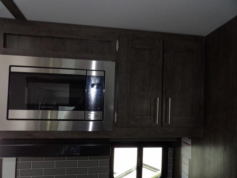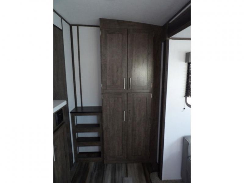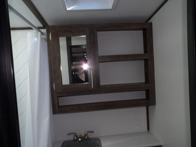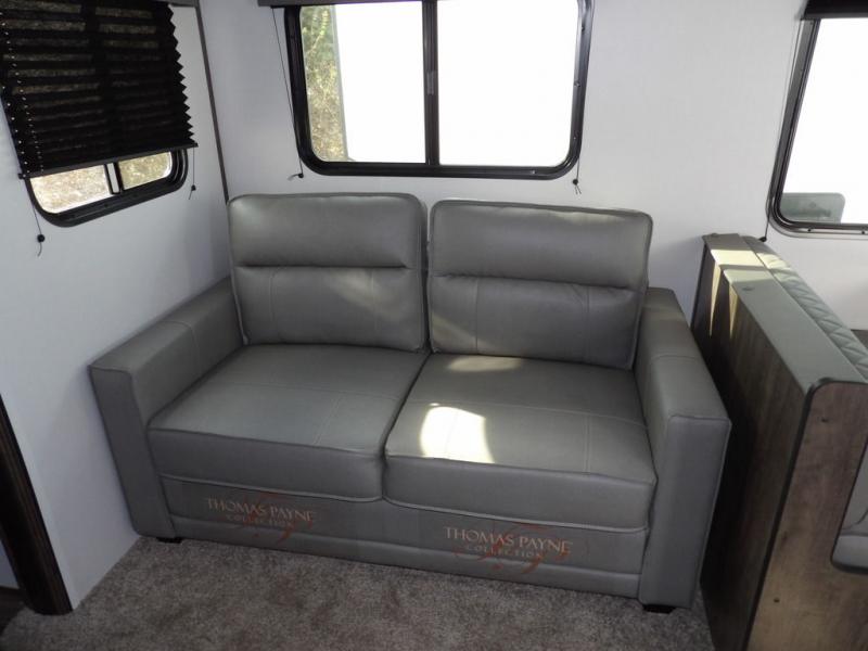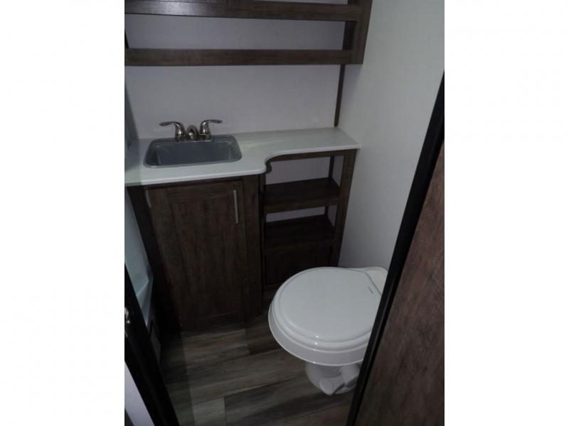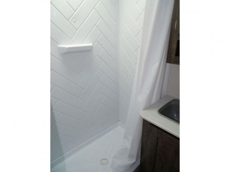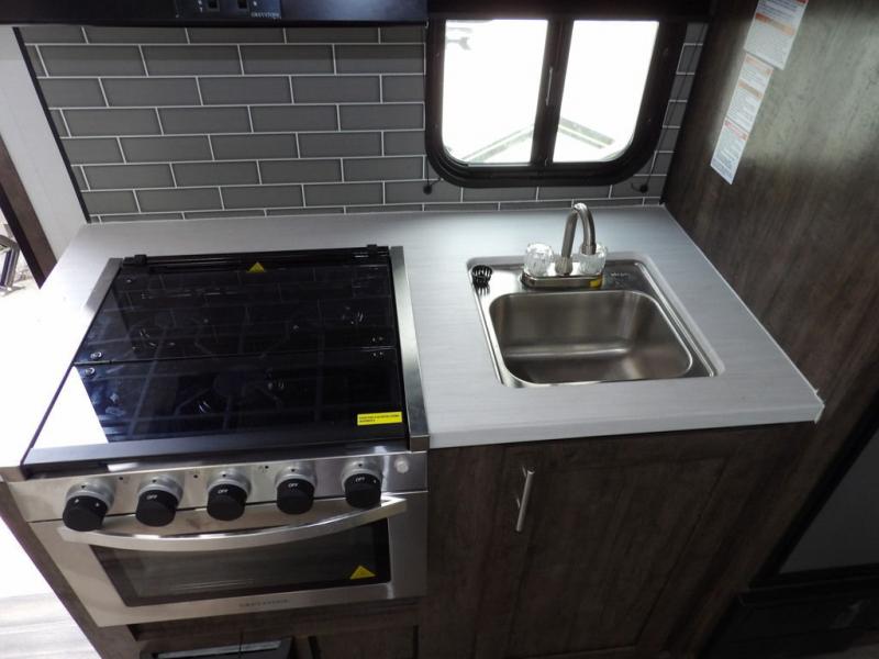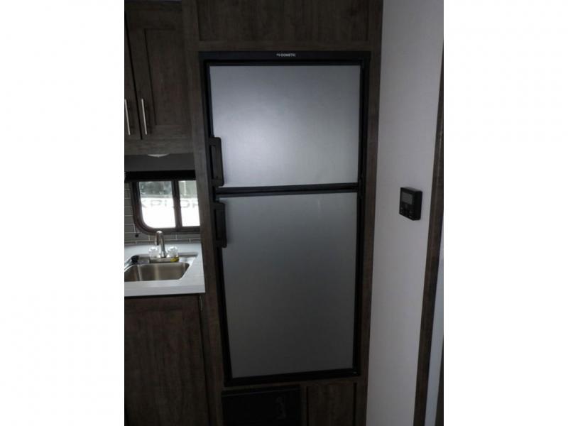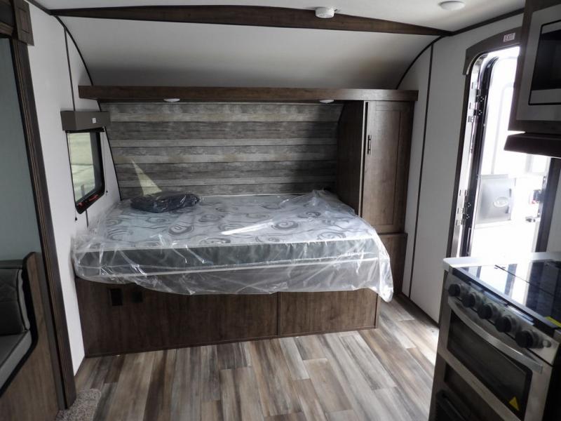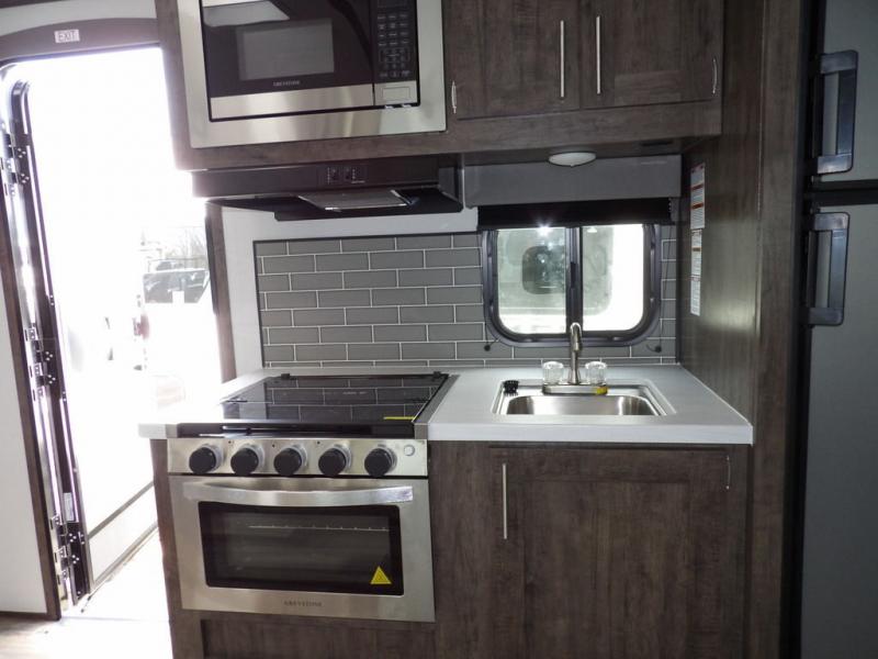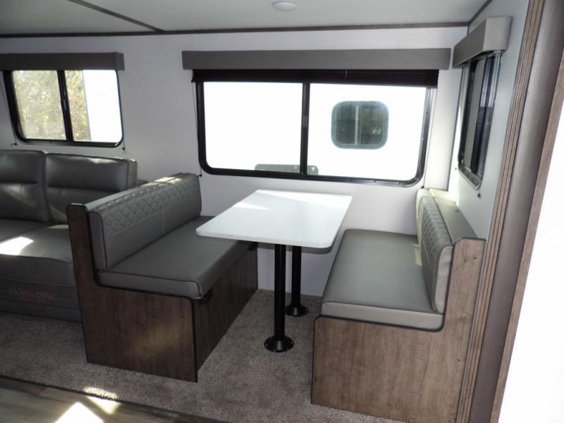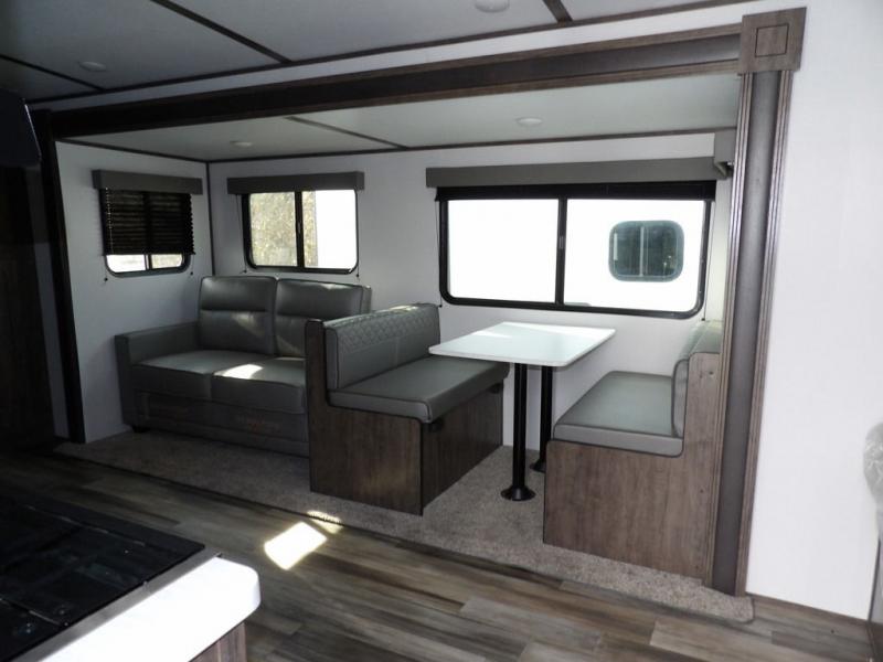 Enjoy added space in this travel trailer thanks to the large slide out. Here you'll find the sofa and booth dinette across from the entertainment center. Home cooked meals can be made in the fully-equipped kitchen, including a four burner cooktop and a refrigerator for leftovers. This model also includes a front RV queen bed for your comfort, and the full bath lets everyone freshen up before bed.