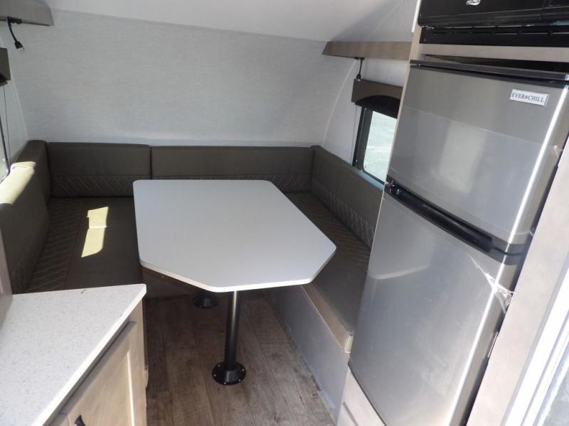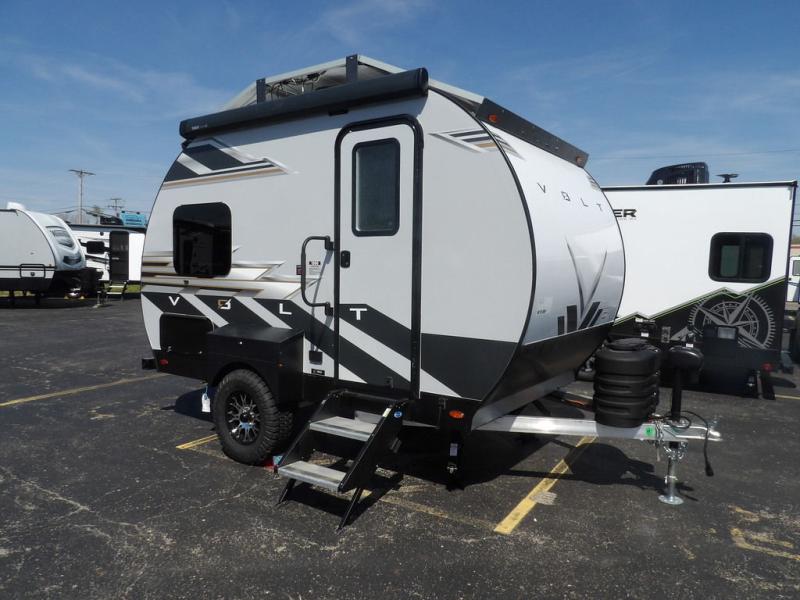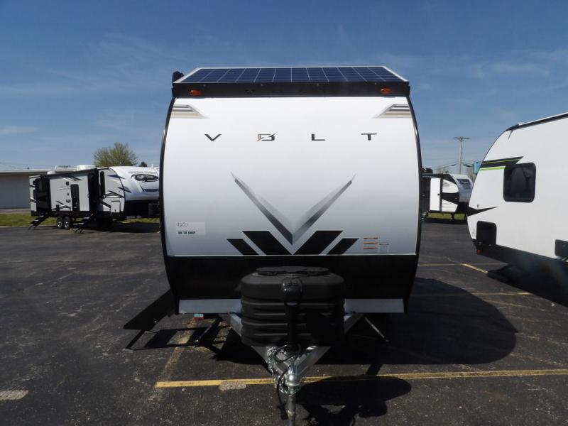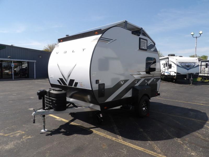 The Volt 1200 is a great choice for a lightweight travel trailer! With full solar power, you can go off-grid and get away from it all. This floorplan includes a U-shaped dinette that can convert to a bed. A full kitchen offers a sink, microwave, three-burner cooktop with oven, and a 12V double door refrigerator. Solid surface countertops and residential cabinets with solid wood stiles and cabinet doors look great and are easy to care for. Step outside and spend time under the electric legless awning, and bring the portable Bluetooth speaker with you.