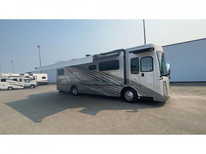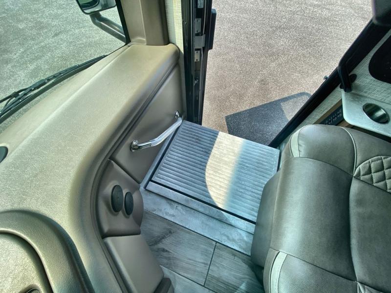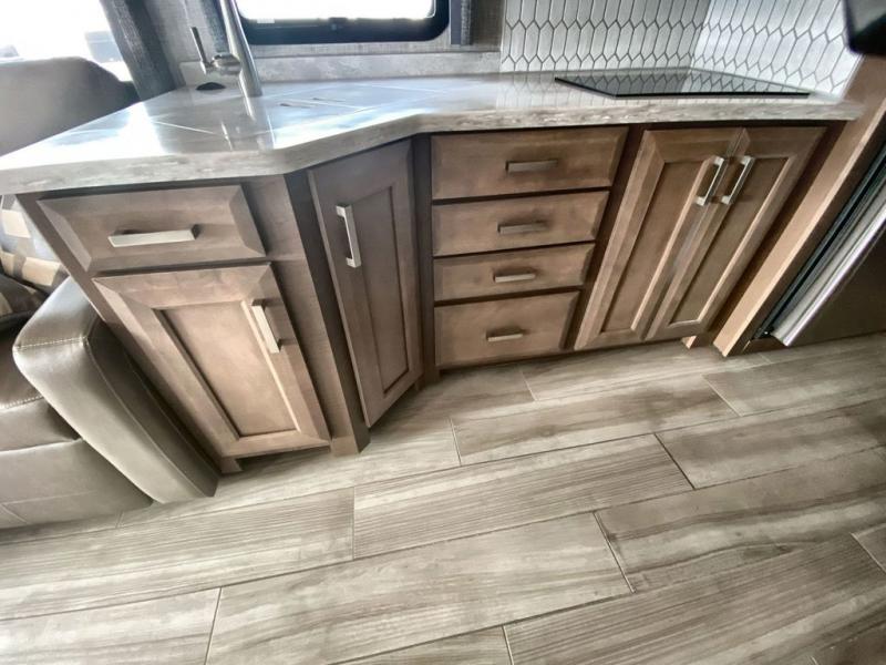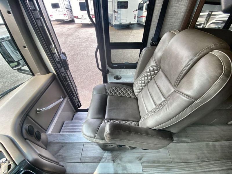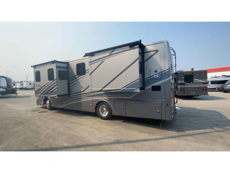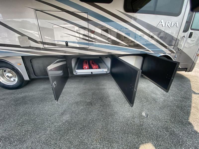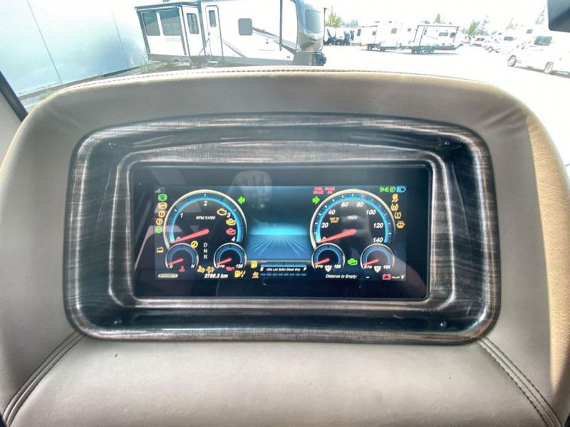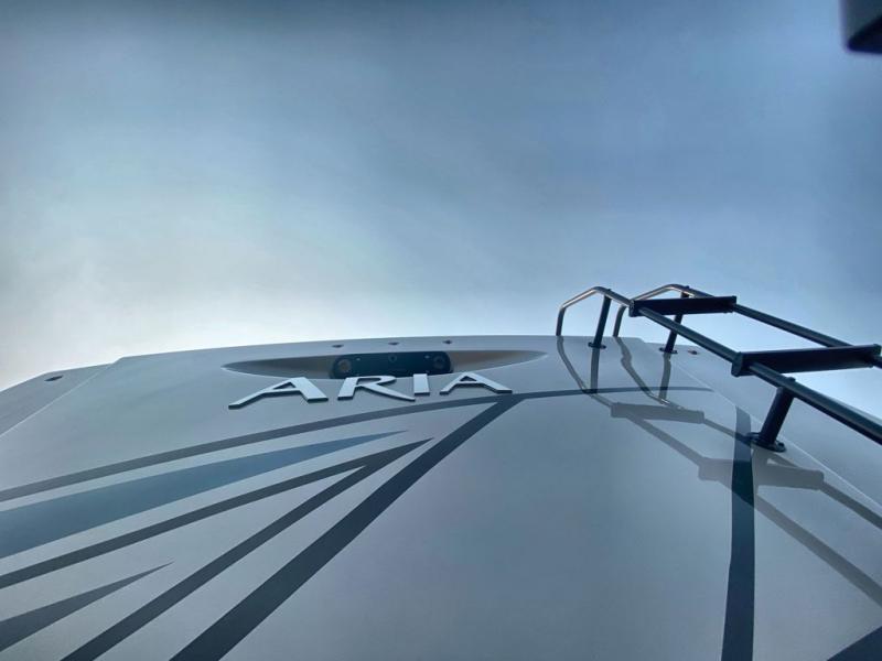 With any Aria Class A diesel motorhome by Thor Motor Coach, experience RV living with all the luxurious amenities you are accustom to, command the roadways with improved handling from the l-beam front axle with a 55-degree wheel cut, and enjoy a smooth ride thanks to the Air-Ride suspension and Sachs shock absorbers. The driver will also appreciate the 10.1" touchscreen dash radio with Bluetooth, navigation, and Sirius/XM prep when navigating the roads, and the comfort of the leatherette reclining/swivel adjustable captain's chairs. The bathroom provides an oversized full height shower with a glass door and a designer backsplash, while the kitchen provides solid surface countertops and a dinette. You'll also enjoy designer tile backsplash, a large double bowl stainless steel sink with a single handle faucet, a pull-down sprayer, plus full kitchen amenities. More standout features include the Studio Collection cabinetry with rake style doors and matte finish, living room pin-up lights, and polished porcelain tile flooring, plus much much more depending on the Aria you take on the road!