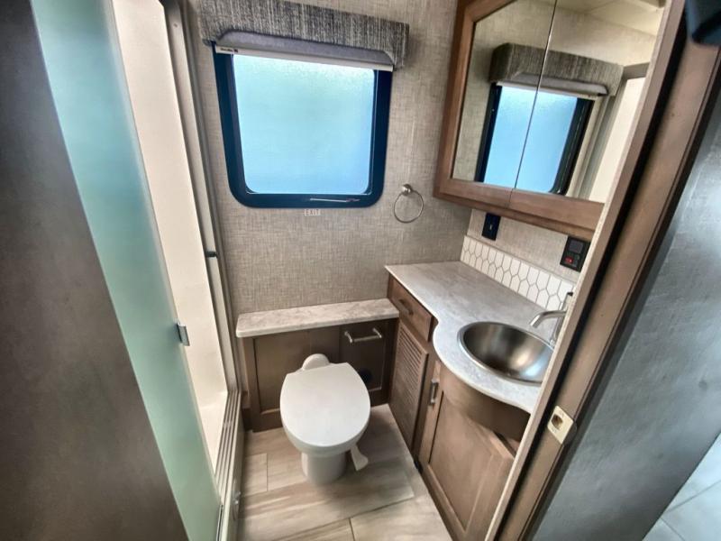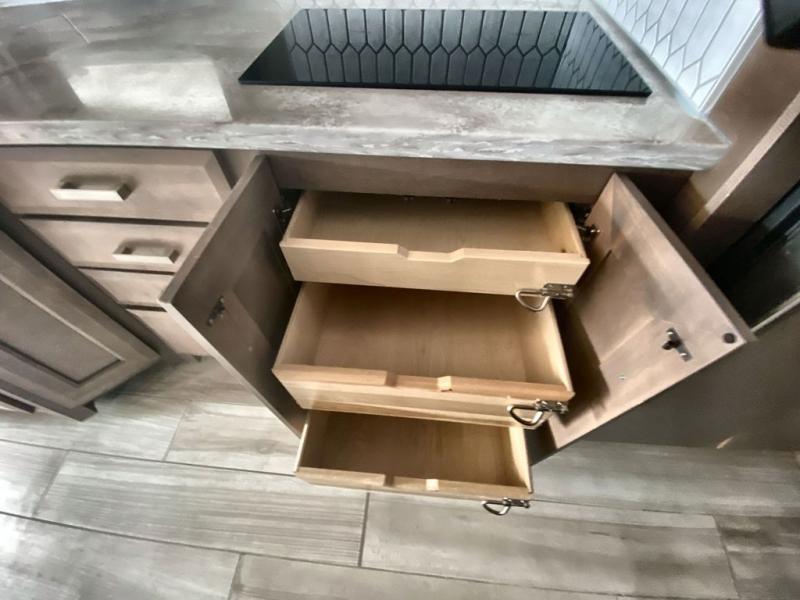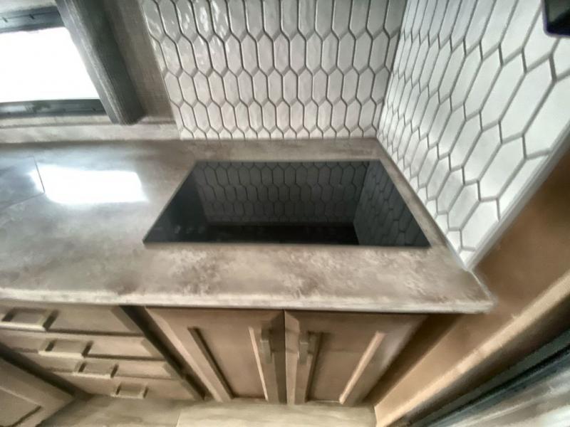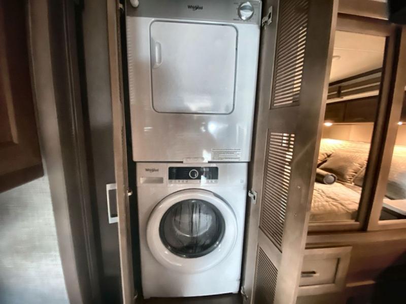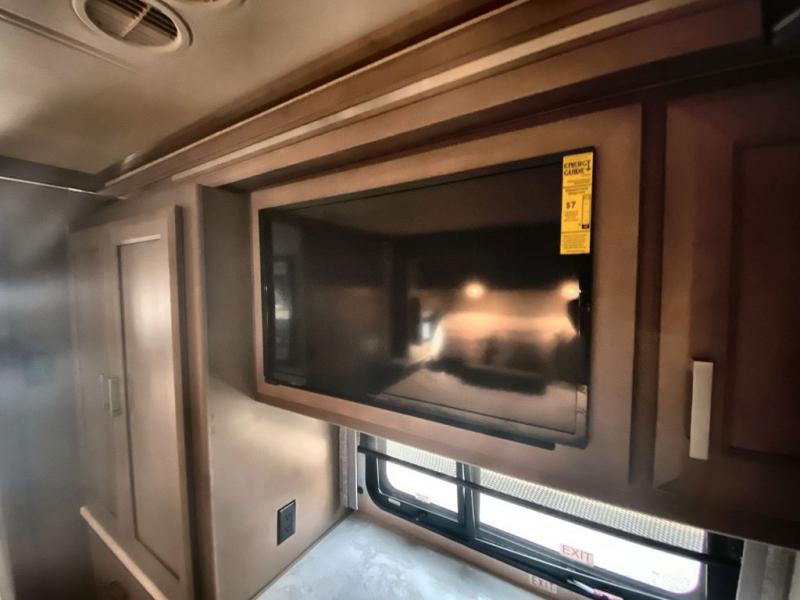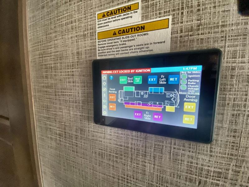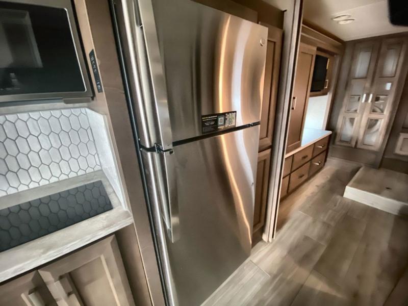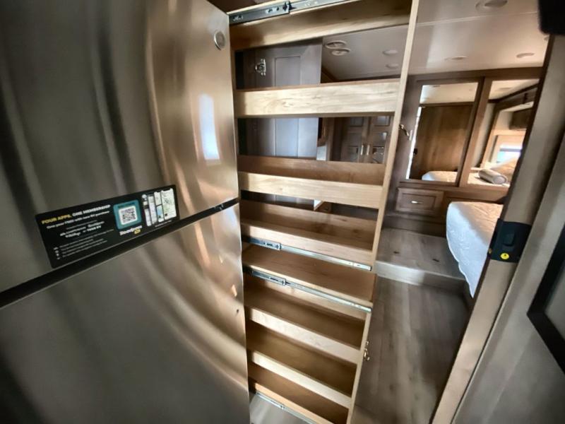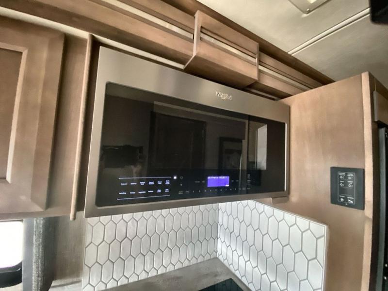 Making your way to the campgrounds is just the beginning of your comfortable journey! Once at your destination, you can continue relaxing inside with beautiful decor, cozy seating, and sleeping space for six so you can invite overnight guests! The galley kitchen has an electric induction cooktop, a convection microwave oven, and a residential refrigerator, plus a pantry for the cook to be able to feed everyone. You can relax on the reclining theater seats, at the Dream dinette, and on the captain's chairs that swivel. The full bathroom has extra counter space for toiletries and such, and the private rear bedroom offers a Tilt-A-View inclining king bed for ultimate comfort, a stackable washer/dryer to keep everything clean, and two wardrobes. You will find a TV in the living area, over the cockpit, in the bedroom, and outside for maximum entertainment. And the drop-down overhead bunk is a great place for kids or grandkids to sleep.