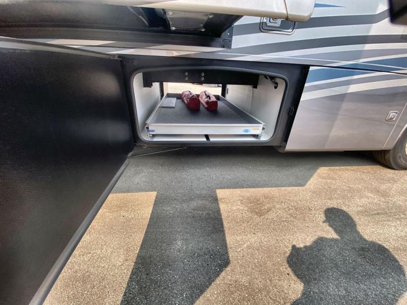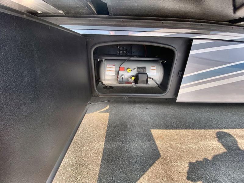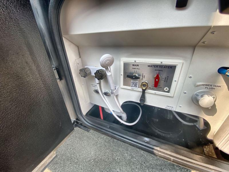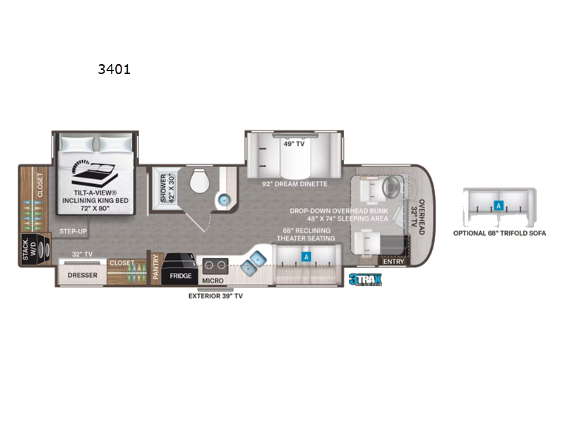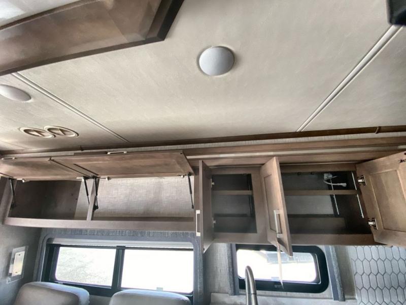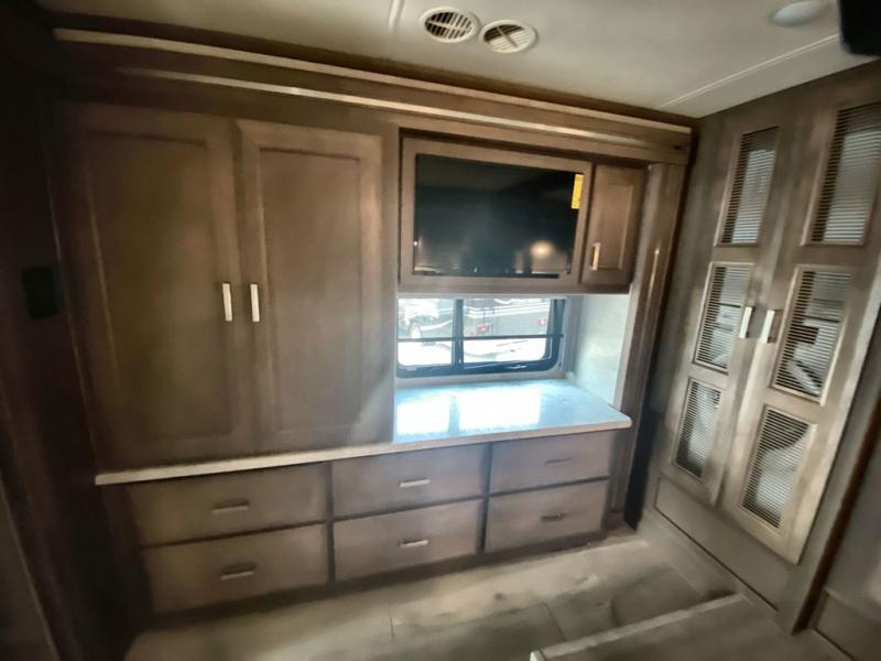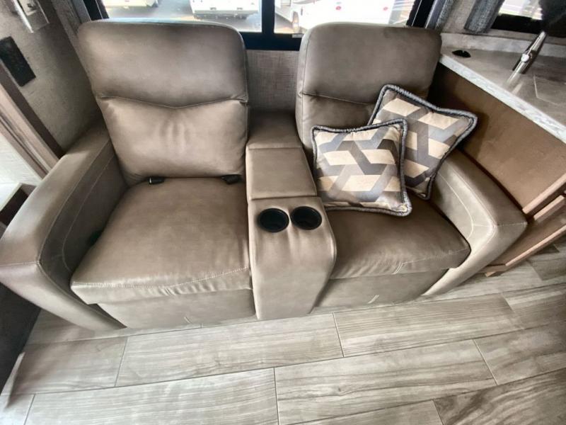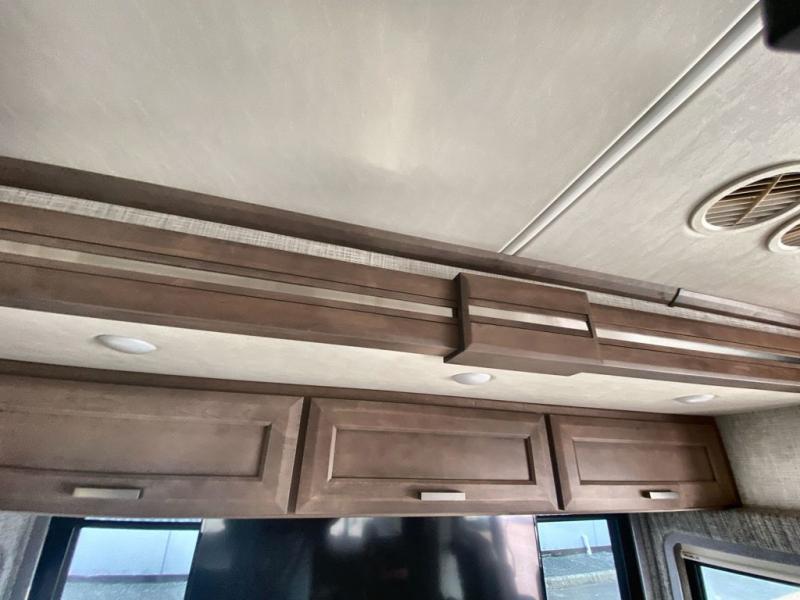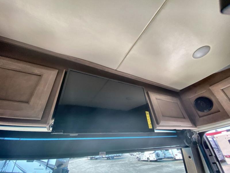 Making your way to the campgrounds is just the beginning of your comfortable journey! Once at your destination, you can continue relaxing inside with beautiful decor, cozy seating, and sleeping space for six so you can invite overnight guests! The galley kitchen has an electric induction cooktop, a convection microwave oven, and a residential refrigerator, plus a pantry for the cook to be able to feed everyone. You can relax on the reclining theater seats, at the Dream dinette, and on the captain's chairs that swivel. The full bathroom has extra counter space for toiletries and such, and the private rear bedroom offers a Tilt-A-View inclining king bed for ultimate comfort, a stackable washer/dryer to keep everything clean, and two wardrobes. You will find a TV in the living area, over the cockpit, in the bedroom, and outside for maximum entertainment. And the drop-down overhead bunk is a great place for kids or grandkids to sleep.