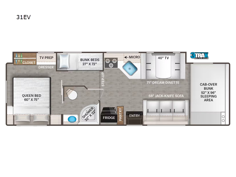 Bring the whole family with you in this motorhome! The grandkids can sleep on the set of 27" x 72" bunk beds, and you can sleep on the 60" x 75" queen bed in the rear private bedroom which also has a closet and dresser for your clothes and TV prep for entertainment. Plus, you can access the dual entry bathroom directly from the bedroom or the hallway next to the bunk beds. Relax in true comfort on the 68" jackknife sofa while you watch a movie on the 40" TV or play a few card games at the 71" Dream Dinette. There is also a 52" x 96" bunk over cab for even more sleeping space!