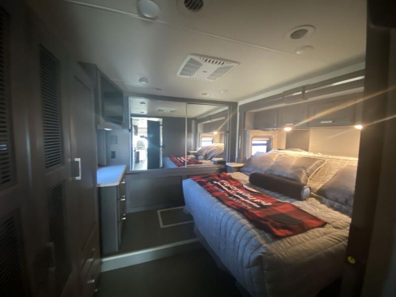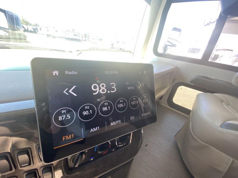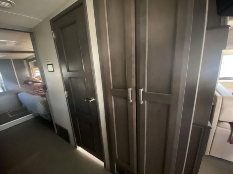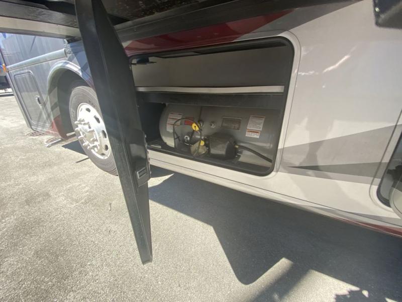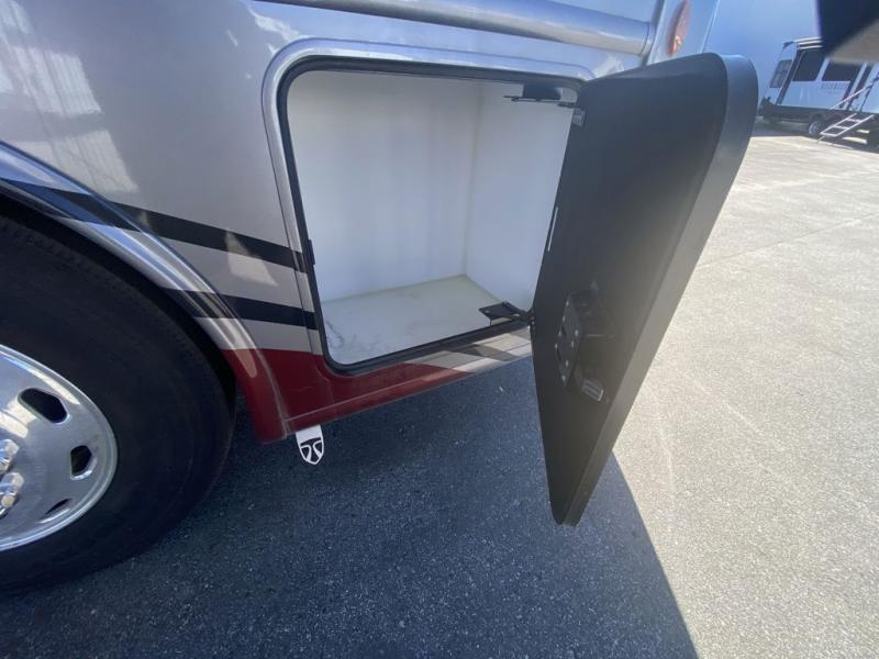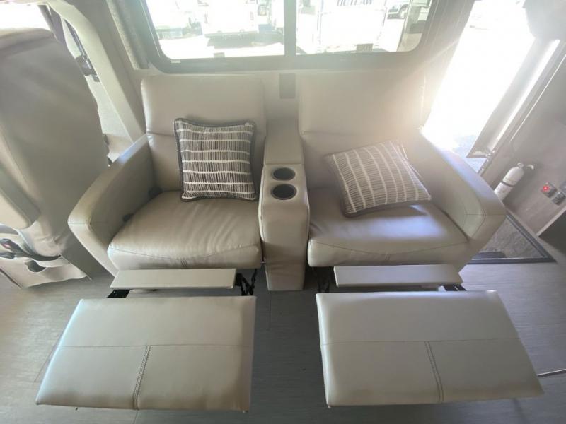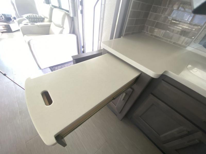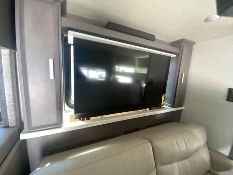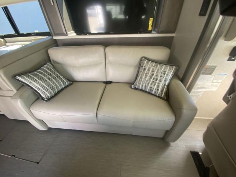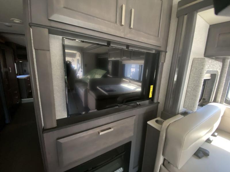 You can't beat the luxury you'll find in this motorhome that can sleep seven each night. You'll love waking up each day on your Tilt-A-View inclining king bed, and there is a full-length closet to store all your clothes. The stacked washer and dryer will allow you to start a load of laundry before you head to the kitchen for breakfast. Whether you're making eggs on the electric induction cooktop, or making oatmeal in the convection microwave, you're sure to find everything you need in this Palazzo kitchen. The main living area will be a spot everyone will love to gather in, especially with a Dream Dinette, a trifold sofa, plus inclining theater seats. There is an overhead bunk the little ones will love, and the 40" LED HDTV and fireplace will make this whole area feel more like home!
