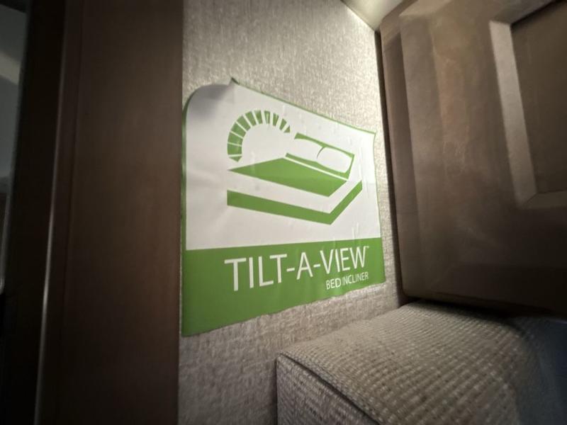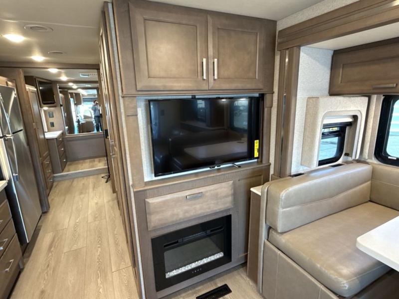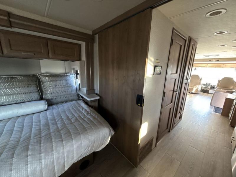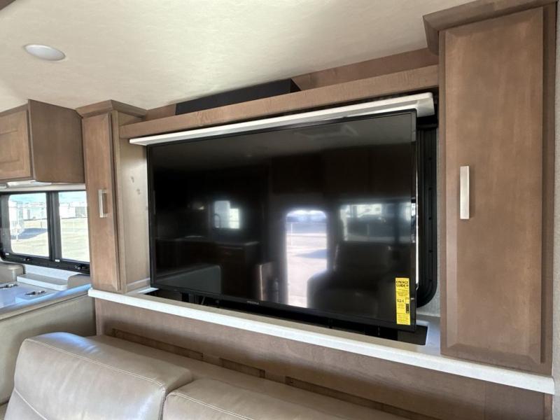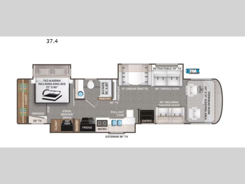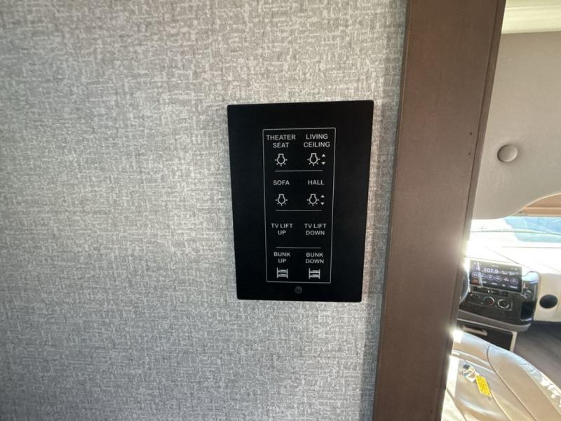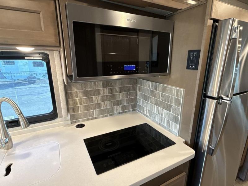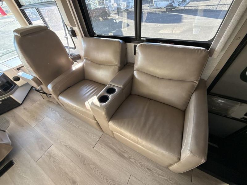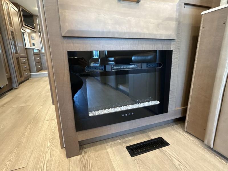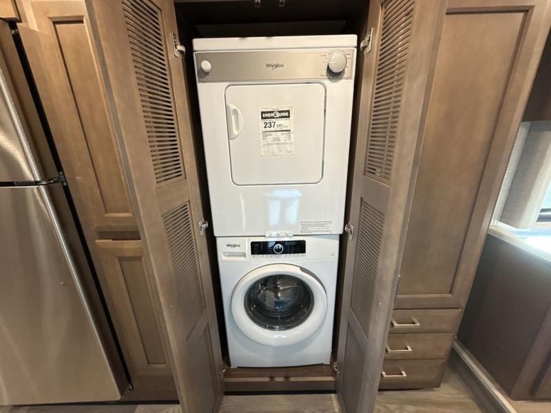 You can't beat the luxury you'll find in this motorhome that can sleep seven each night. You'll love waking up each day on your Tilt-A-View inclining king bed, and there is a full-length closet to store all your clothes. The stacked washer and dryer will allow you to start a load of laundry before you head to the kitchen for breakfast. Whether you're making eggs on the electric induction cooktop, or making oatmeal in the convection microwave, you're sure to find everything you need in this Palazzo kitchen. The main living area will be a spot everyone will love to gather in, especially with a Dream Dinette, a trifold sofa, plus inclining theater seats. There is an overhead bunk the little ones will love, and the 40" LED HDTV and fireplace will make this whole area feel more like home!