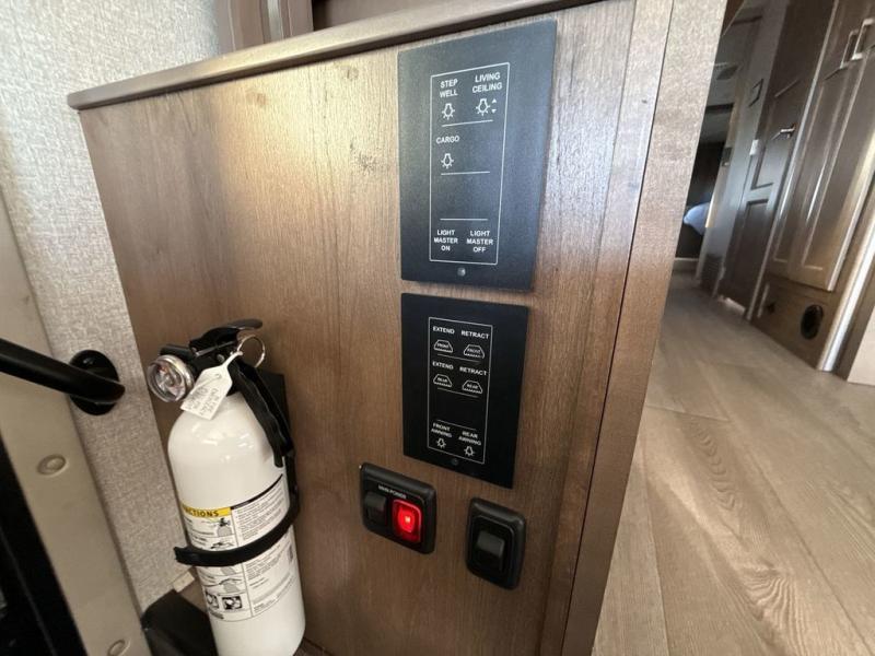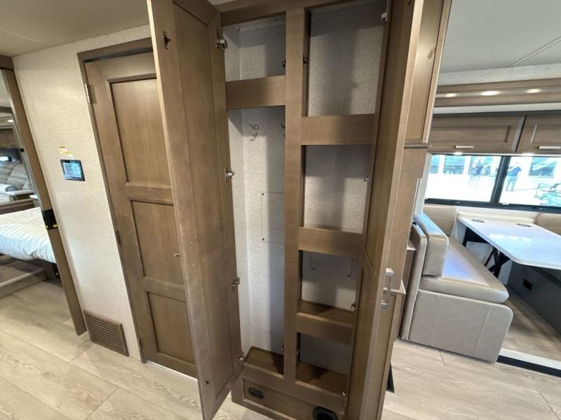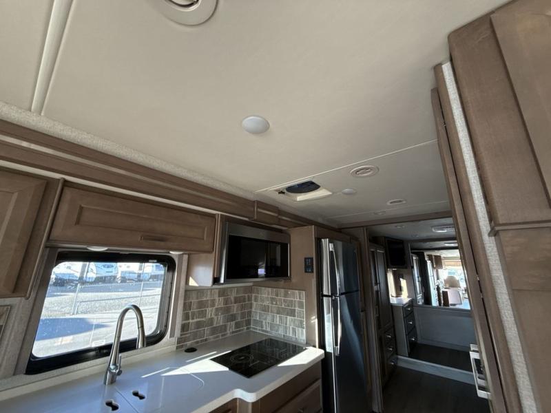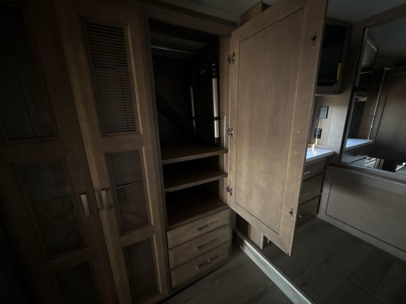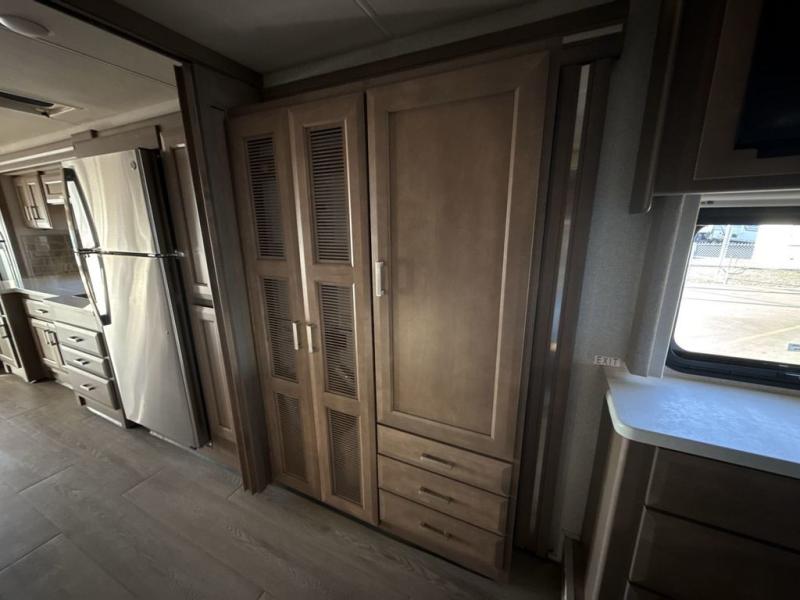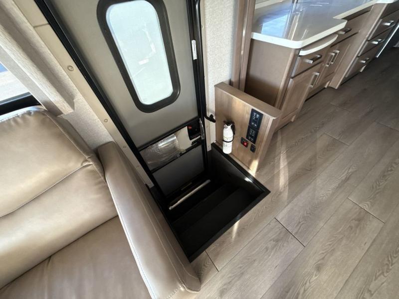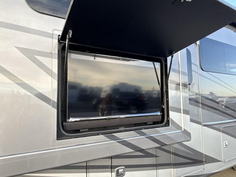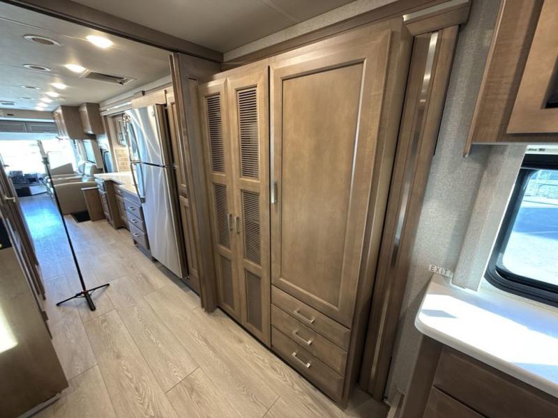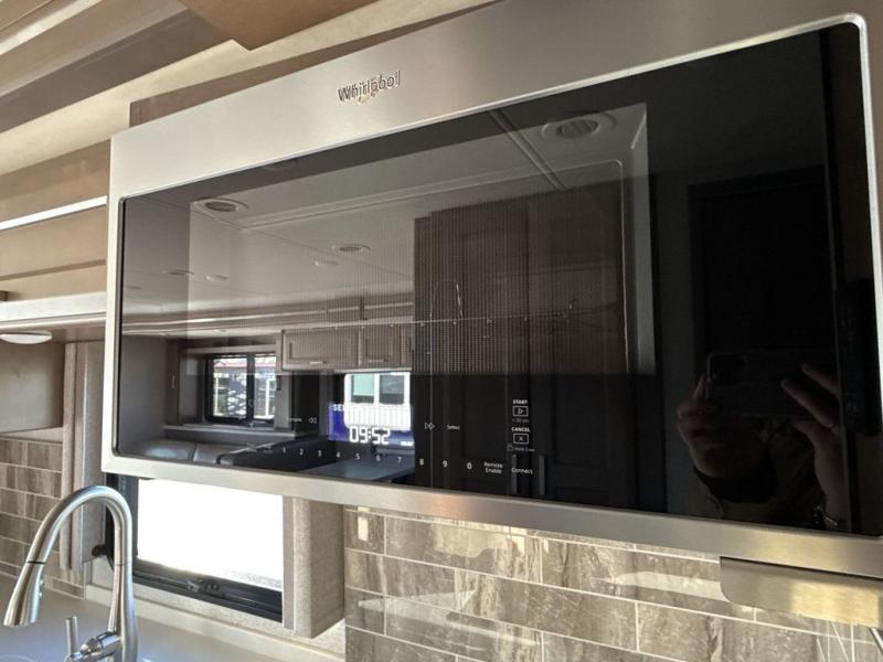 You can't beat the luxury you'll find in this motorhome that can sleep seven each night. You'll love waking up each day on your Tilt-A-View inclining king bed, and there is a full-length closet to store all your clothes. The stacked washer and dryer will allow you to start a load of laundry before you head to the kitchen for breakfast. Whether you're making eggs on the electric induction cooktop, or making oatmeal in the convection microwave, you're sure to find everything you need in this Palazzo kitchen. The main living area will be a spot everyone will love to gather in, especially with a Dream Dinette, a trifold sofa, plus inclining theater seats. There is an overhead bunk the little ones will love, and the 40" LED HDTV and fireplace will make this whole area feel more like home!
