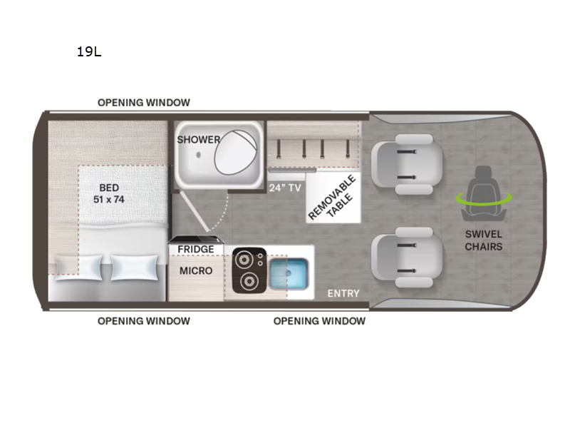 When you love to explore without sacrificing luxuries such as having your own 51" x 74" bed at night, this camper van will be perfect for two! The captain's chairs swivel offer more seating space to utilize the removable table in front of the side seat, and to watch the 24" TV once at your destination. The kitchen amenities include a single door, electric refrigerator, a dual burner gas cooktop and a microwave oven, plus a solid surface countertop and stainless steel single bowl sink allowing you to make meals while away. You can eat inside or outside using the fold-out exterior table. And if you are not staying the night, the seatbelts on the side seat offers space for passengers. There are many more standard features and a few options to choose from, start exploring today!