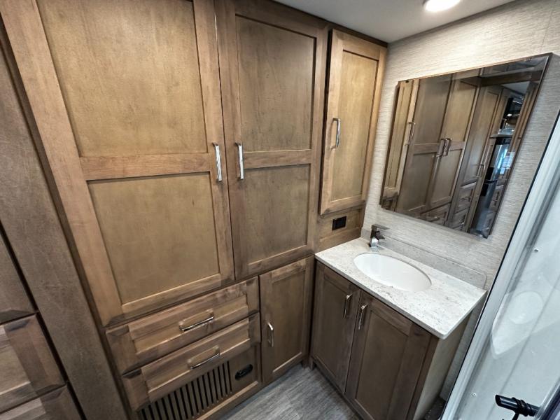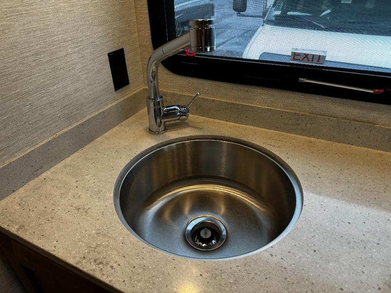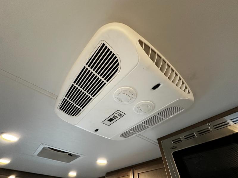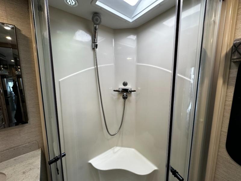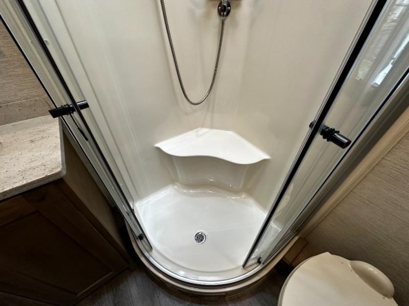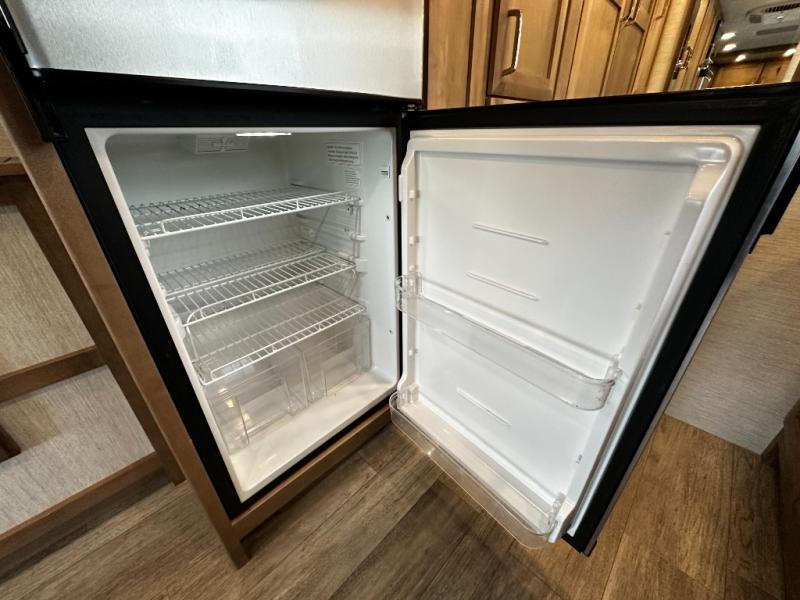 Comfort is found throughout in this spacious coach. There is a comfortable queen-sized Murphy bed to sleep on at night and a sofa to relax on during the day. You can prepare breakfast on the induction cooktop or use the stainless steel convection microwave, and leftovers can go in the 7 cu. ft. refrigerator. This model includes a full bath with a solid surface lavatory top, a roof vent fan, and a radius shower, and you'll find plenty of storage space between the two storage closets and the wardrobe! When you're ready to head to the next campground, you will enjoy the adjustable captain's seats and colored multi-function touch screen AM/FM stereo with SYNC 3, Bluetooth, navigation, and dual USB ports for the ultimate driving experience!