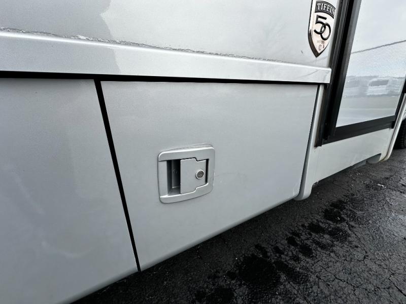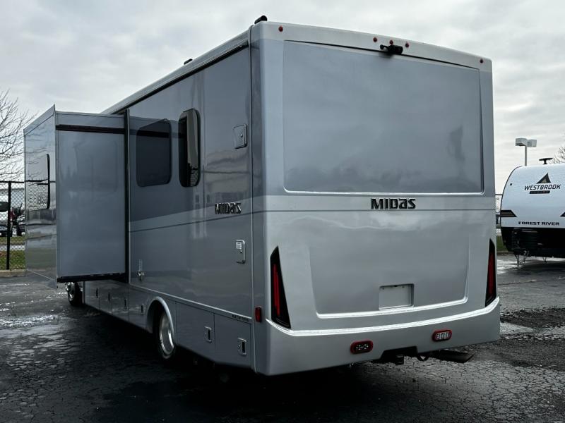 The Tiffin Motorhomes Midas Class C gas motorhome is your golden ticket to greater adventures! The exterior has a Girard® powered patio awning with LED lights that you can use while you're outside lounging. The exterior has also been outfitted with rear mud guards and flush-style tinted windows with tip-out feature, and the outside shower is going to be useful when it's a scorching afternoon in July and you want to cool down or wash off hiking gear. The lockable handles on compartment doors will keep your things secure, and the cargo bay features motion sensor lights for convenience. There's prep for satellite as well as a park cable hook-up so you have choices for entertainment. Inside, you'll find handcrafted cabinetry, a solid surface galley countertop, soft-closing drawer slides, privacy shades, and many more comforts.