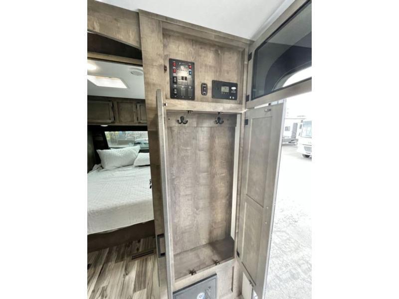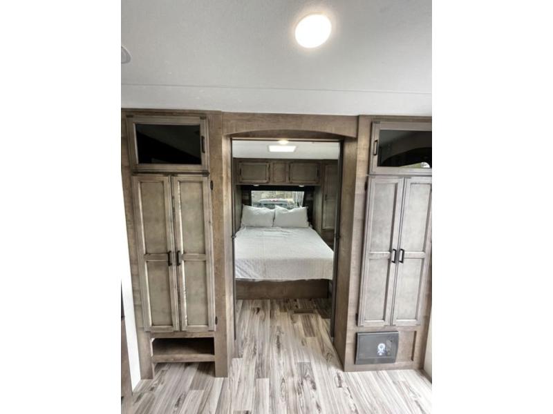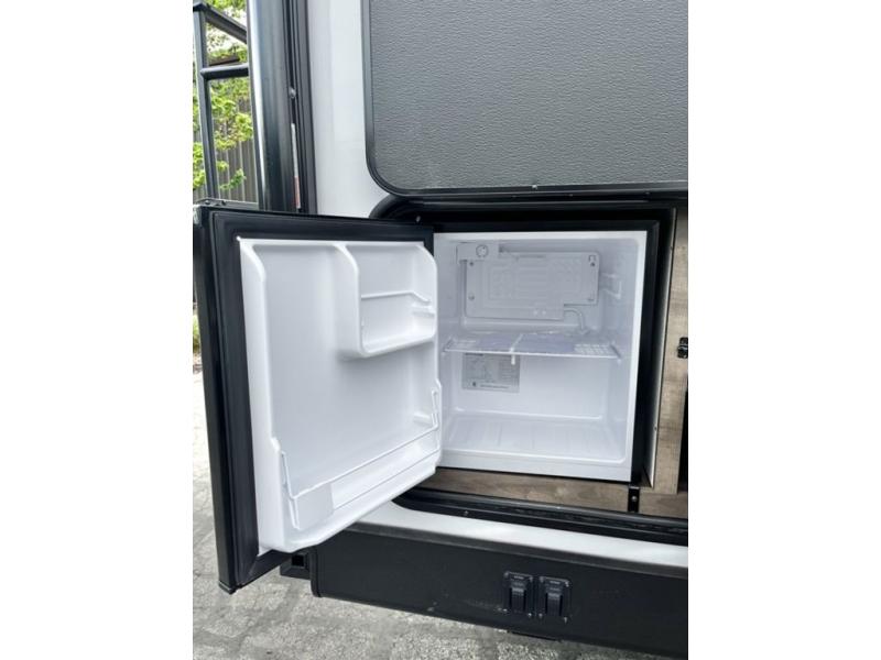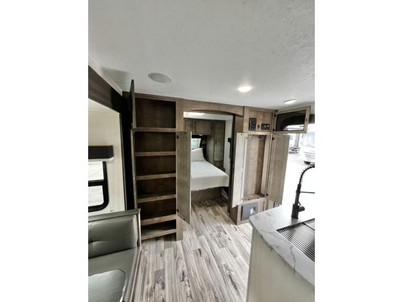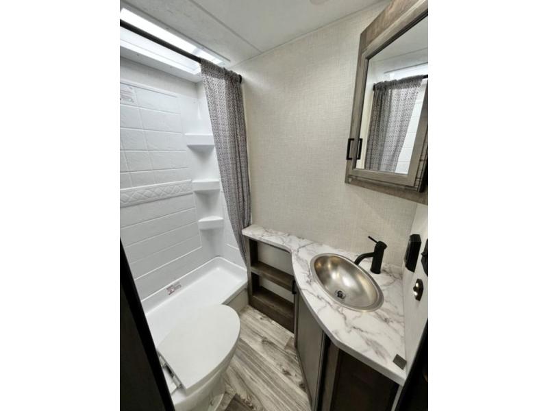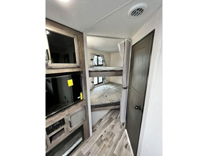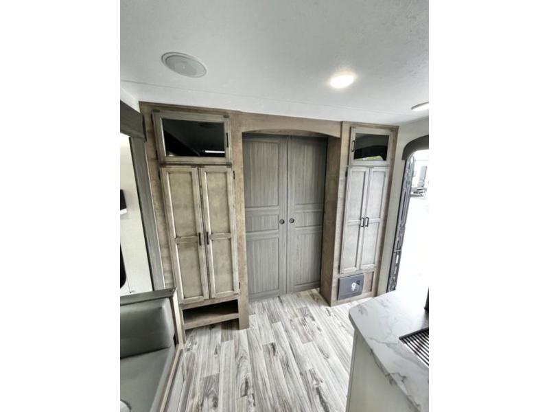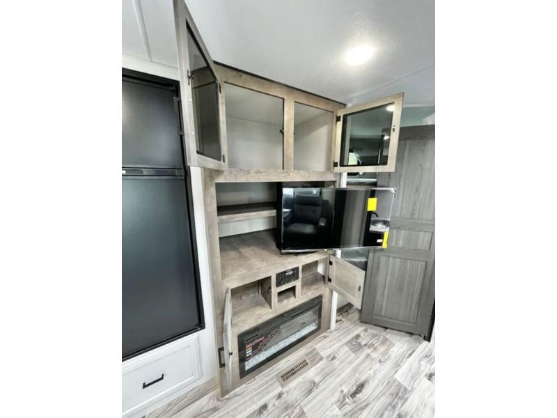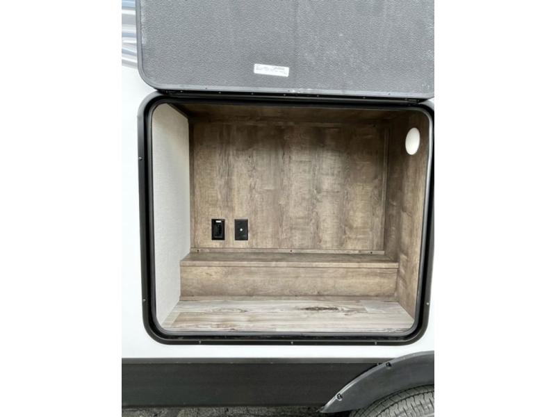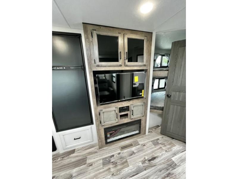 There is plenty of storage inside and out of this travel trailer including a trunk door and a pass-through storage area with slam latch baggage doors! The kids can sleep on the set of 51" x 75" double-size bunk beds and you can sleep on the Sleep Tight queen bed inside the front private bedroom with sliding doors for privacy. You will find entertainment inside with a 40" TV on a swing arm at the entertainment center which also has a StorMore hidden pantry, plus there is an outside TV prep area to watch the big game while you grill burgers on the griddle at the campfire café. Everyone will stay squeaky clean with the 24" x 40" shower in the rear corner bathroom!