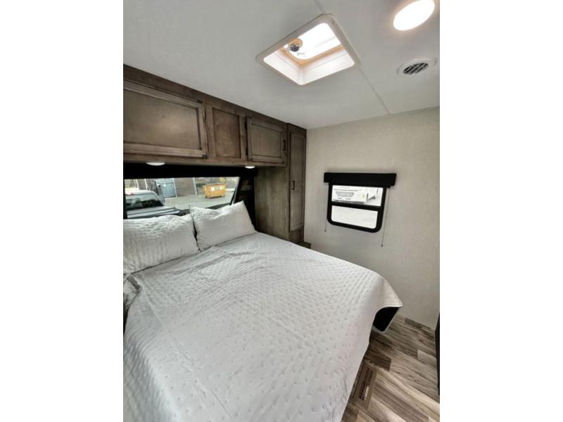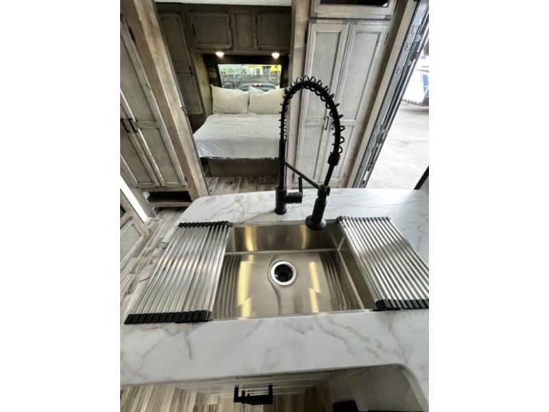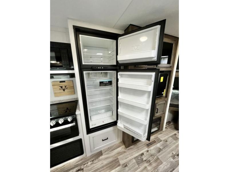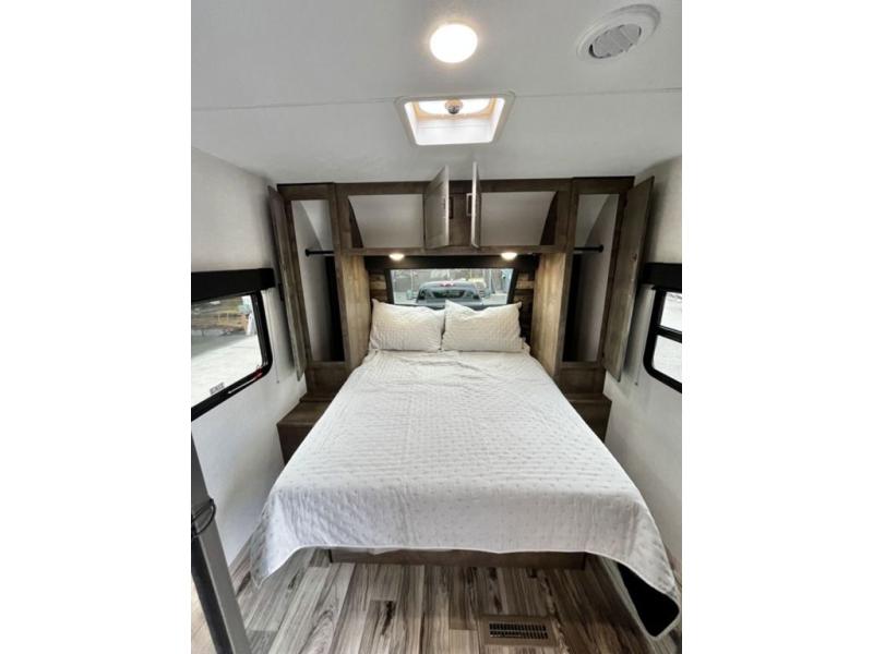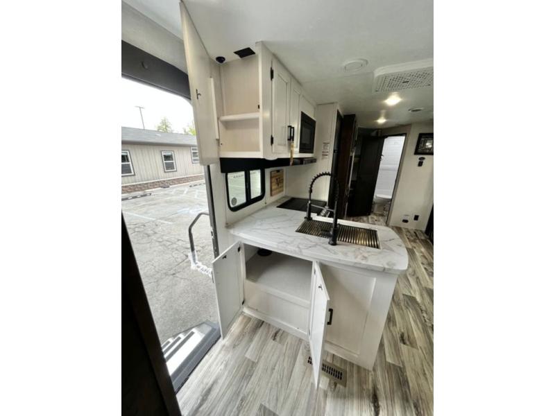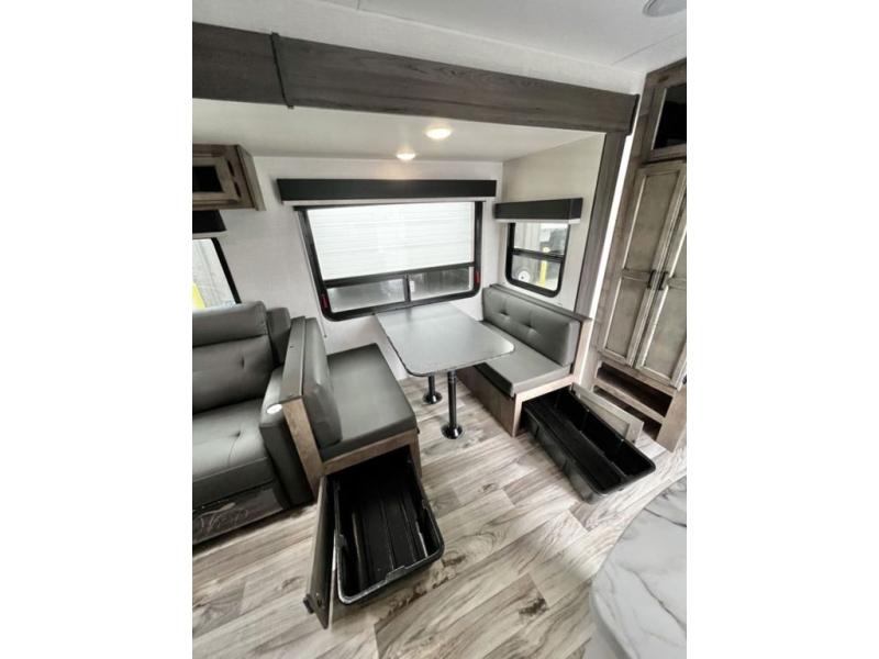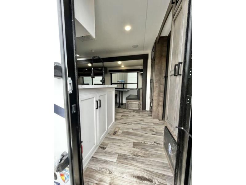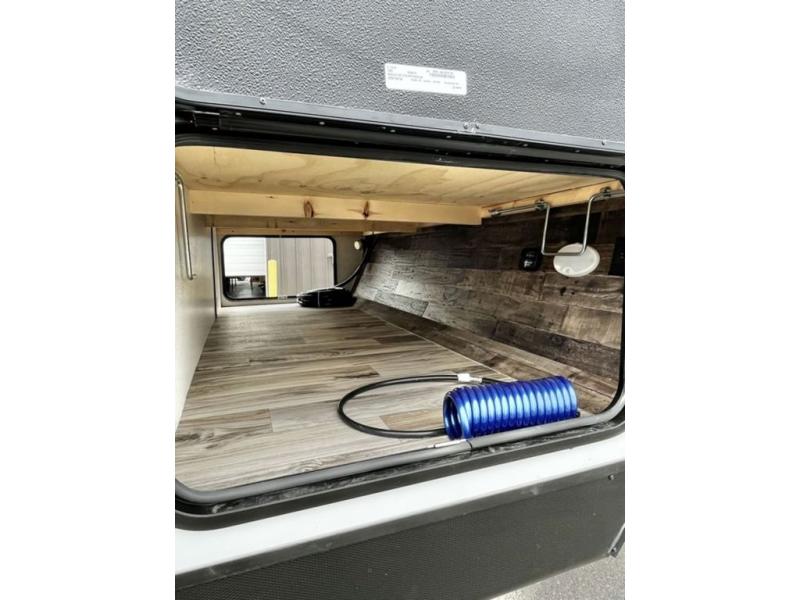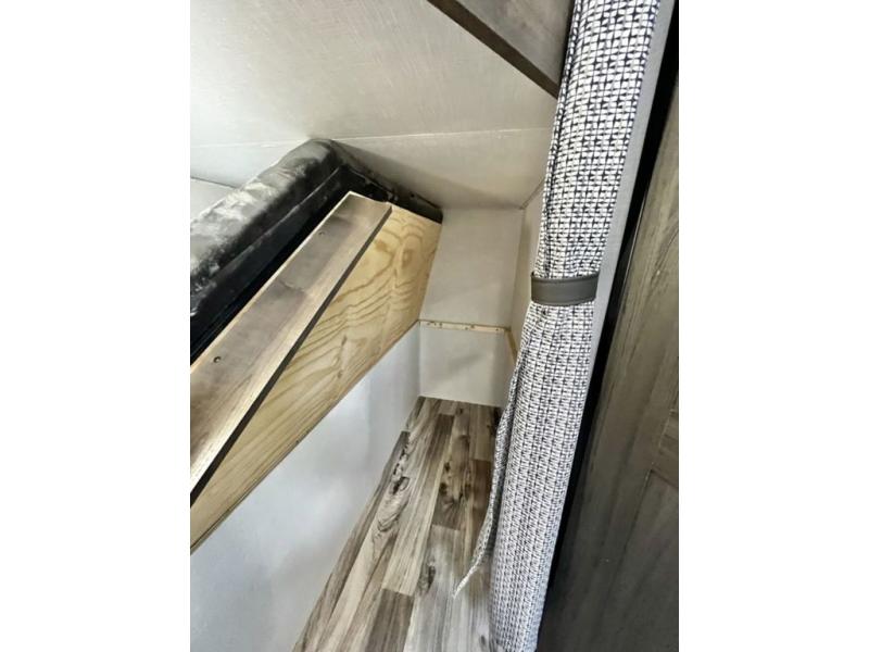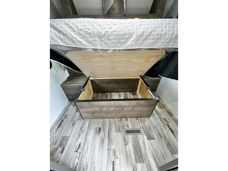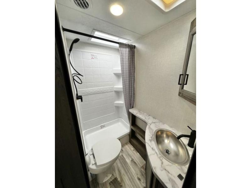 There is plenty of storage inside and out of this travel trailer including a trunk door and a pass-through storage area with slam latch baggage doors! The kids can sleep on the set of 51" x 75" double-size bunk beds and you can sleep on the Sleep Tight queen bed inside the front private bedroom with sliding doors for privacy. You will find entertainment inside with a 40" TV on a swing arm at the entertainment center which also has a StorMore hidden pantry, plus there is an outside TV prep area to watch the big game while you grill burgers on the griddle at the campfire café. Everyone will stay squeaky clean with the 24" x 40" shower in the rear corner bathroom!