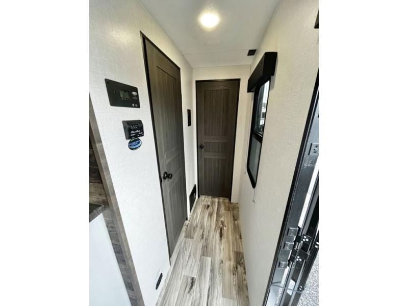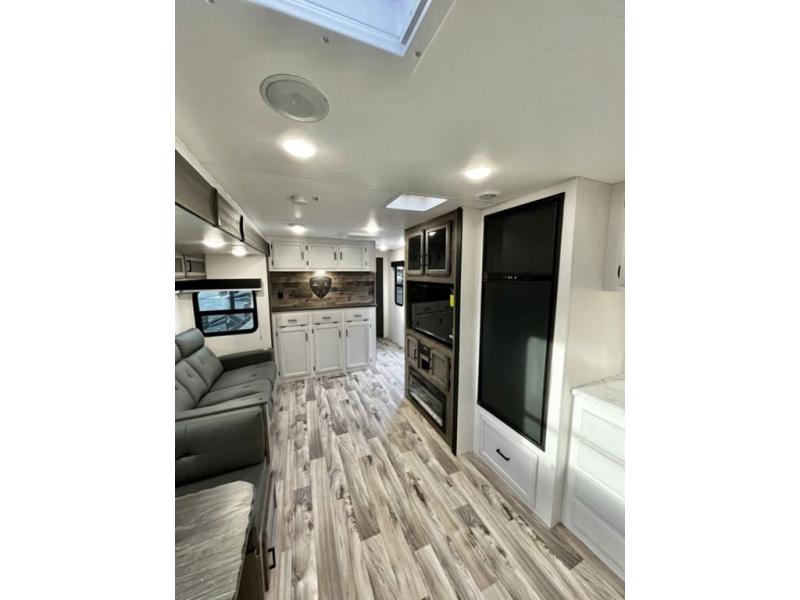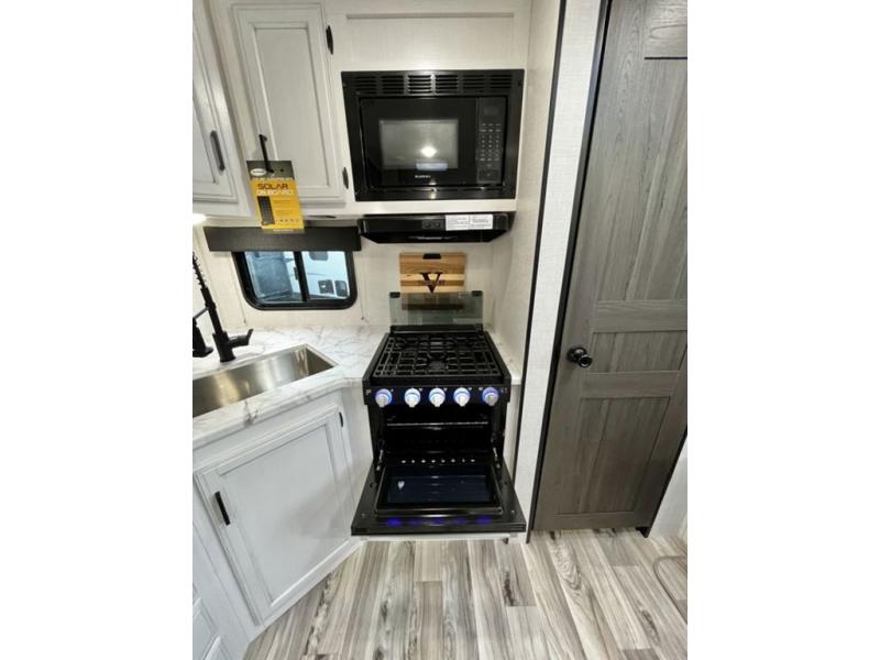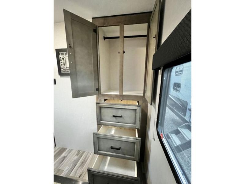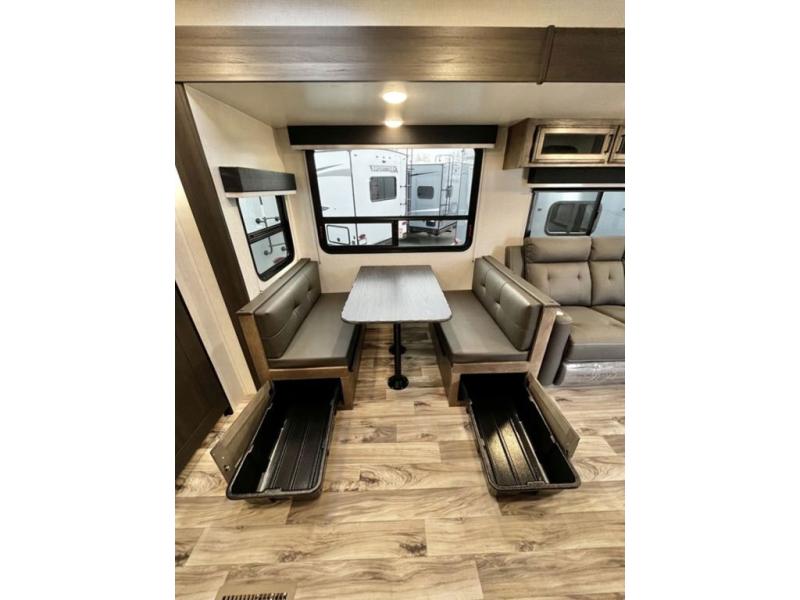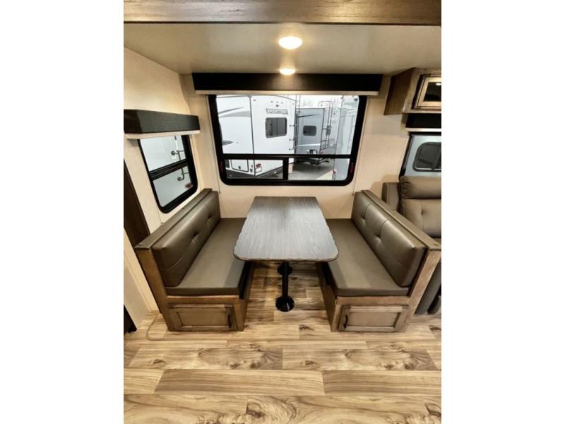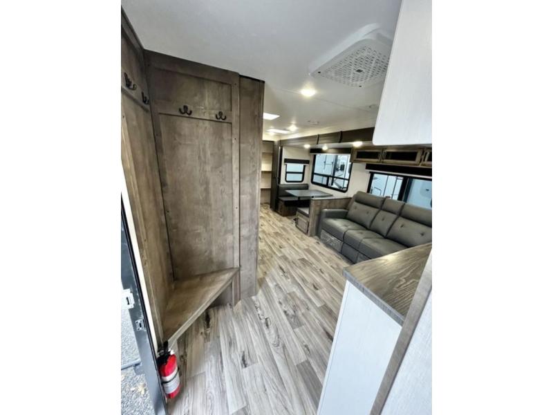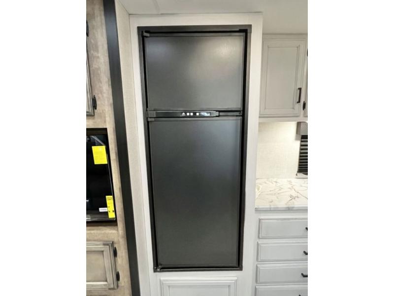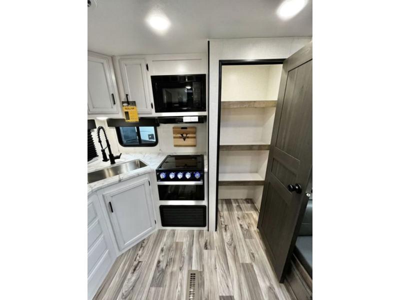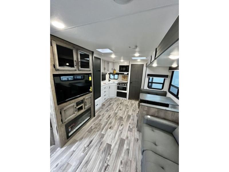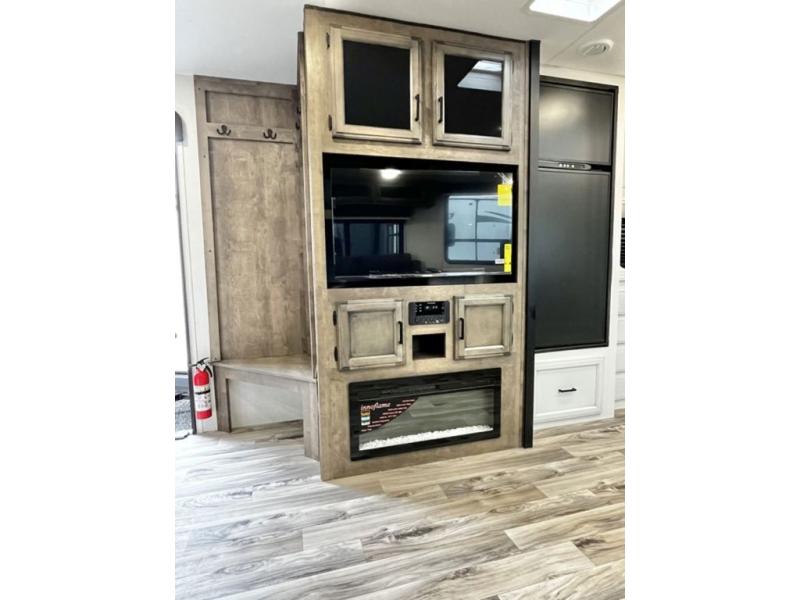 A rear kitchen makes it easy to prepare meals in this travel trailer! The kitchen has a three burner cooktop with a Furrion oven, a 10 cu. ft. double door refrigerator to keep your perishables fresh, overhead cabinets keep cooking essentials nearby, and a walk-in pantry big enough for all of your snacks and canned goods, plus a hutch for your dishes. You could even prepare meals outside with the campfire café which has a sink, a refrigerator, and a griddle. The bench seat gives you a spot to sit while you put on your shoes and the coat hooks above makes it easy to grab and go. Enjoy your meals and card games at the 42" booth dinette and relax on the 70" sofa across from the entertainment center with a 40" TV on a swing arm and a 5,000 BTU frameless fireplace. The front private bedroom has a Sleep Tight queen bed to lay your head on at night and a closet with drawers to keep your clothes looking their best!
