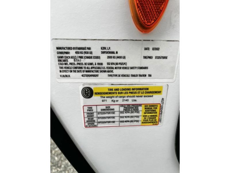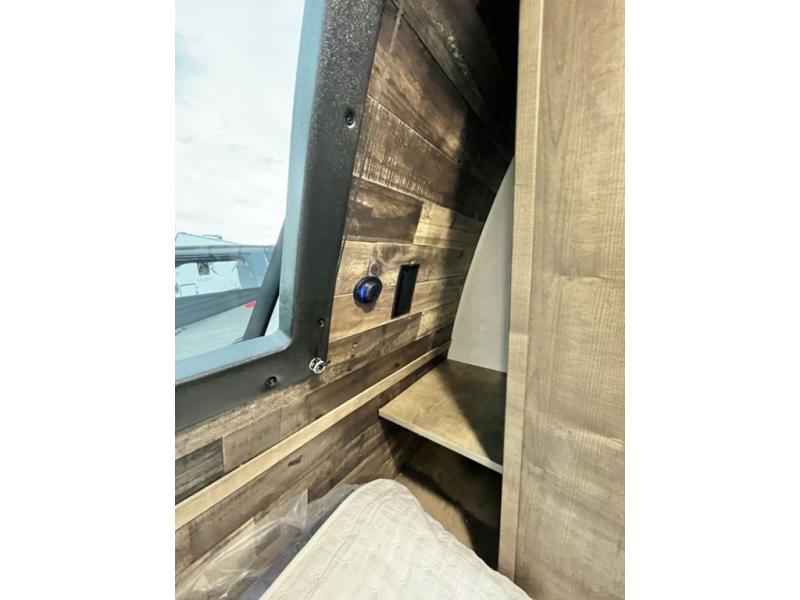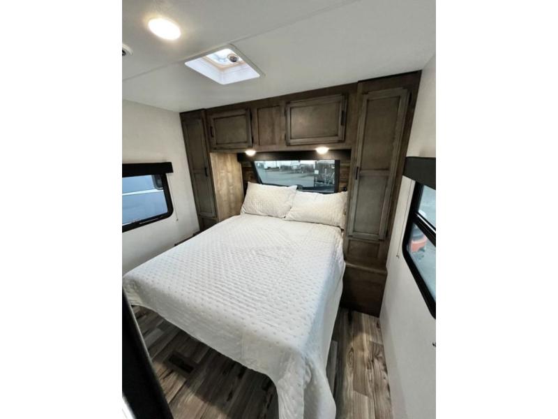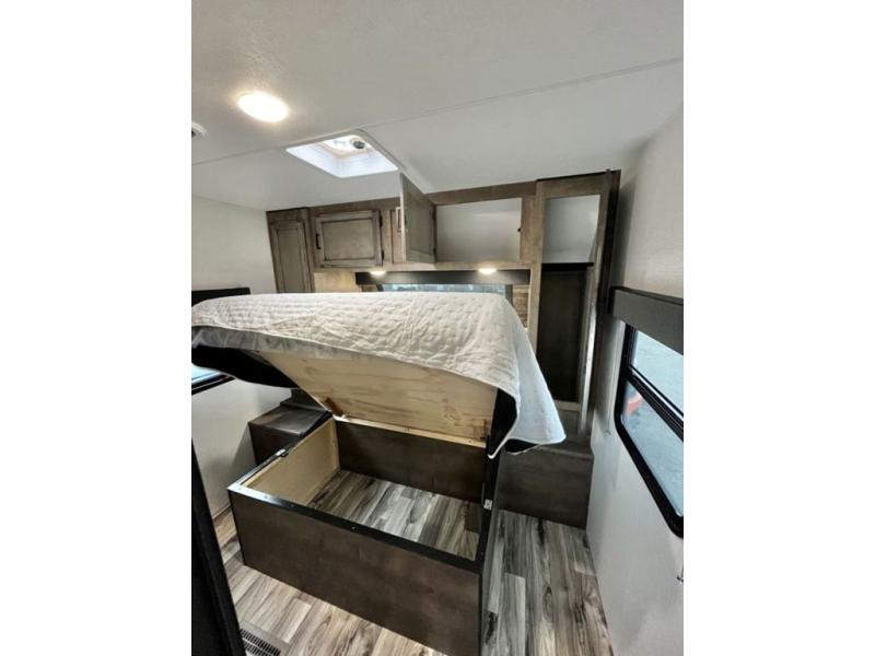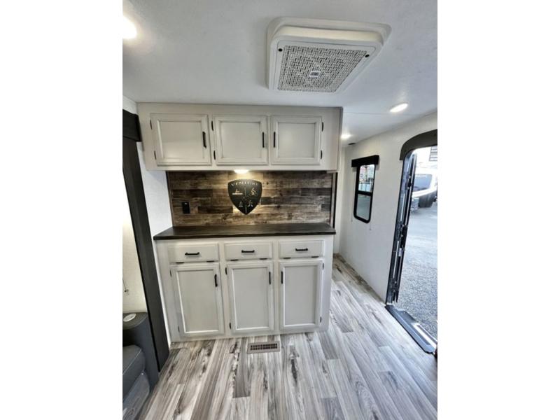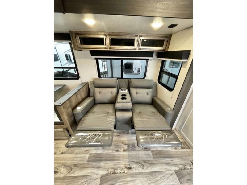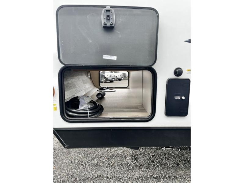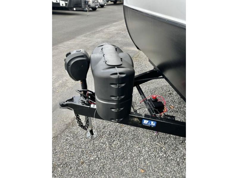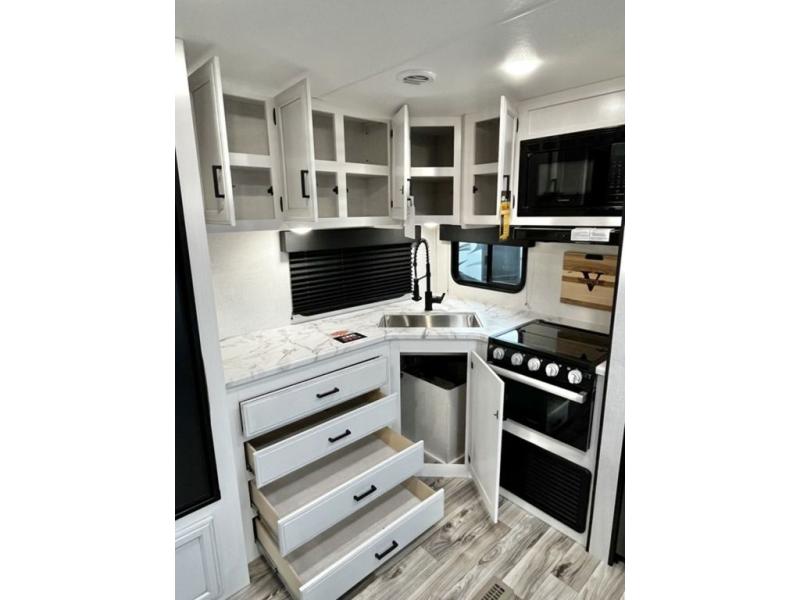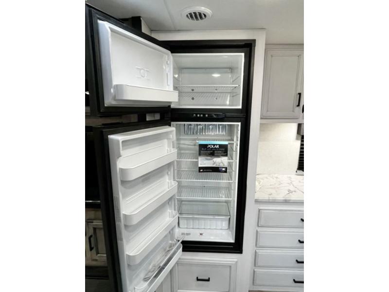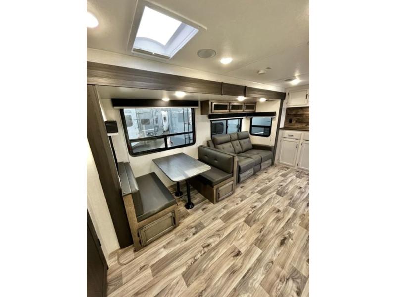 A rear kitchen makes it easy to prepare meals in this travel trailer! The kitchen has a three burner cooktop with a Furrion oven, a 10 cu. ft. double door refrigerator to keep your perishables fresh, overhead cabinets keep cooking essentials nearby, and a walk-in pantry big enough for all of your snacks and canned goods, plus a hutch for your dishes. You could even prepare meals outside with the campfire café which has a sink, a refrigerator, and a griddle. The bench seat gives you a spot to sit while you put on your shoes and the coat hooks above makes it easy to grab and go. Enjoy your meals and card games at the 42" booth dinette and relax on the 70" sofa across from the entertainment center with a 40" TV on a swing arm and a 5,000 BTU frameless fireplace. The front private bedroom has a Sleep Tight queen bed to lay your head on at night and a closet with drawers to keep your clothes looking their best!