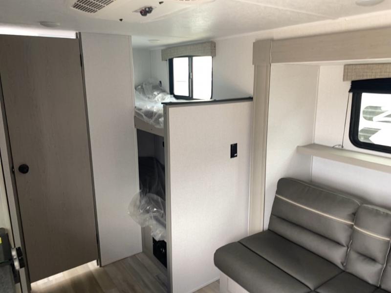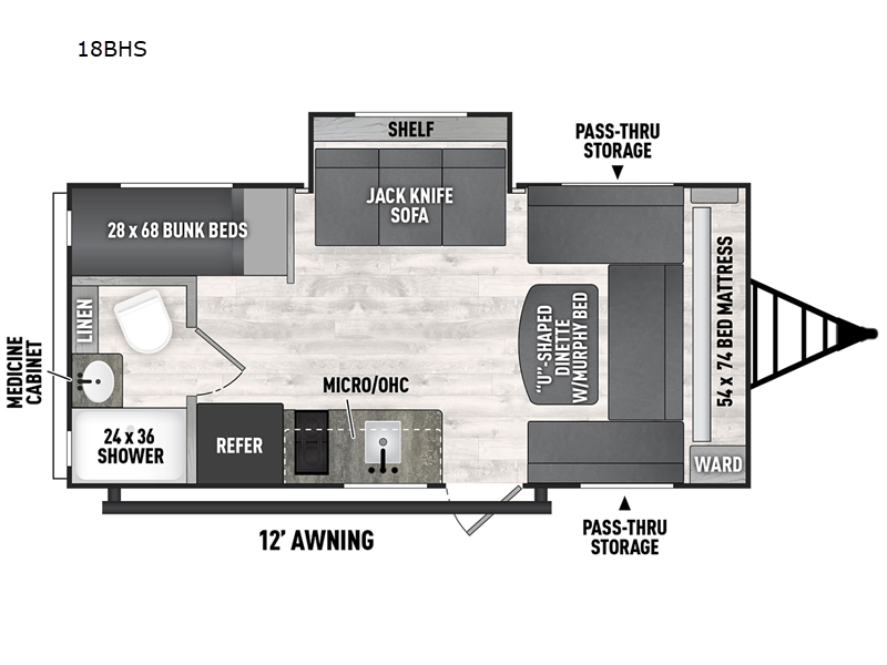 You will love all of the versatility provided with this travel trailer! The front U-shaped dinette is not only great for enjoying meals at, but also for transforming into a 54" x 74" Murphy bed for a good night's rest. There are other sleeping spaces as well with the set of 28" x 68" bunk beds and jackknife sofa slide. Everyone can rinse the sand out of their hair with the 24" x 36" shower in the rear corner bathroom, and fill their bellies with a delicious meal prepared on the two burner cooktop. The exterior pass-through storage area is big enough to store all of your essential camping gear too!
