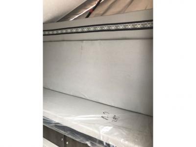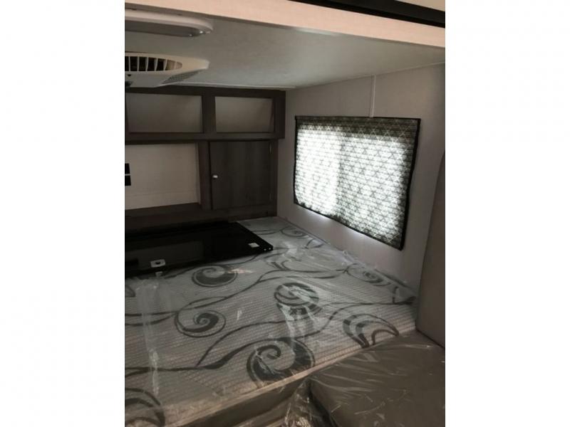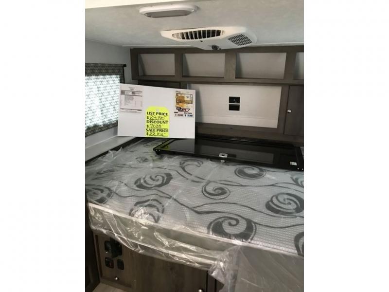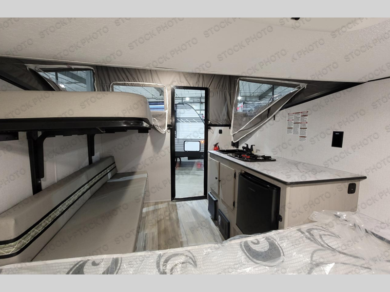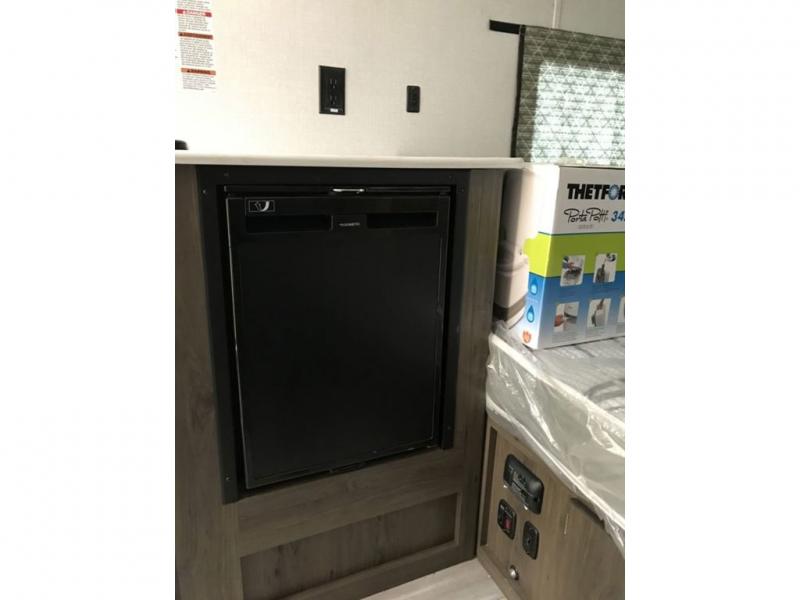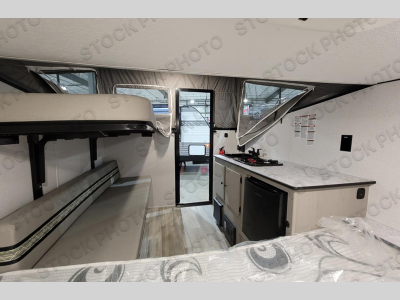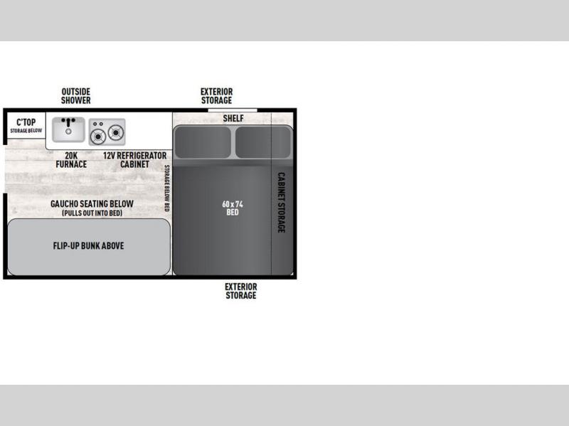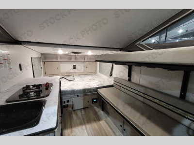 You and your spouse or buddies can take this Clipper Express with you camping, fishing or hunting! There is an RV queen bed up front and a gaucho with a flip-up bunk above offering sleeping space for four, a countertop with storage below, a two burner range for warm meals and a 12V 1.7 cu. ft. refrigerator for drinks. You will also love the Off-Road Package with a flipped axle and 15" off-road tires!