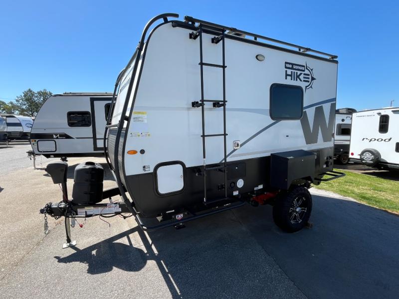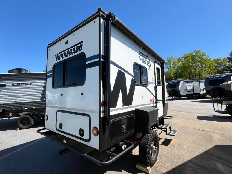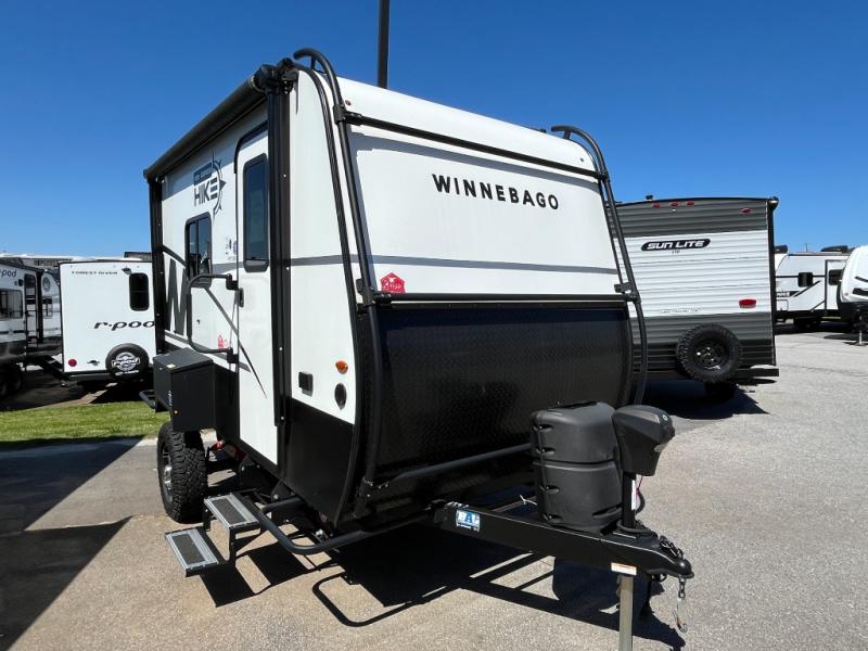 The Hike 100 travel trailers by Winnebago Industries Towables are the outdoor enthusiasts dream RV! It's light enough to be towed by smaller tow vehicles, but still includes plenty of space for your gear. Each model is constructed with a fully enclosed underbelly with radiant foil insulation, an NXG engineered frame, plus a fully walkable roof. You will love the 200-watt solar panel with side-mount solar prep for your off-grid needs, and the BAL independent suspension with Dexter TorFlex torsion stub axles will provide smooth towing. There are also thick core slam latch baggage doors outside, a side-mount ladder to easily reach your gear on top, and and an off-camp side batwing awning with drop-down panels for the exterior shower. Camping in a Hike 100 travel trailer will feel just like home with a designated wardrobe for your things, TransCore fully composite flooring, contemporary cabinetry, and a wet bath to stay clean throughout your trip!