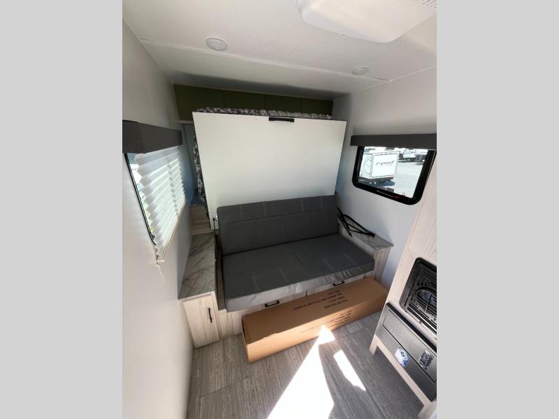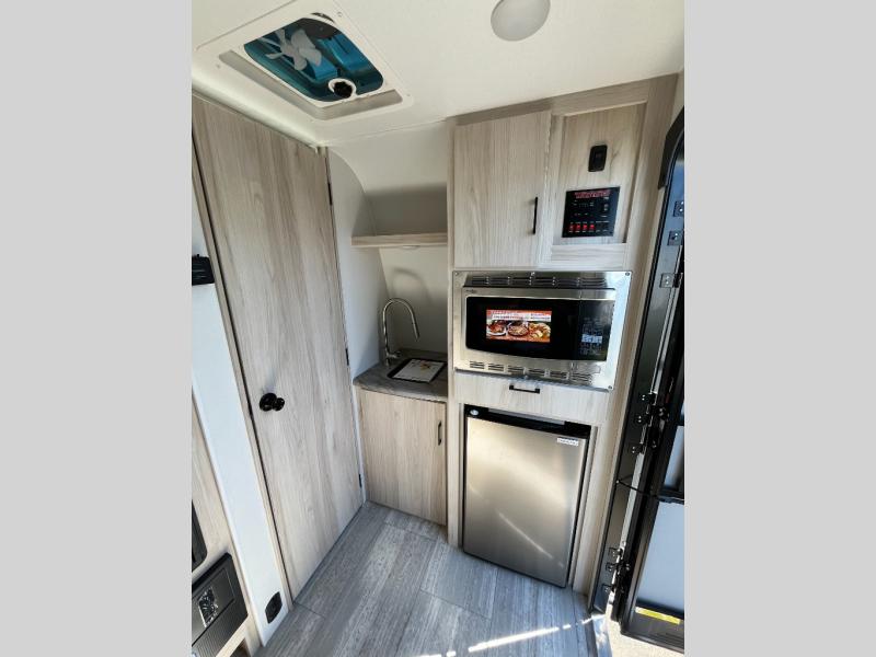 Calling all adventure seekers; this trailer allows you to explore the limits whether at a state park campsite or roaming for some peace and solitude. Seating can be found on the sofa during the day as you dine at the folding table, and at night the 54" x 74" Murphy bed sets up quickly. There are two nightstands to place your personal items, a wardrobe for your clothes, and the wet bath allows you to skip any public facilities. You can cook inside using the convection microwave or the portable induction cooktop, and use the undermount single bowl sink with a cover to wash the dishes, then store your leftovers in the 3.3 cu. ft. 12V refrigerator.