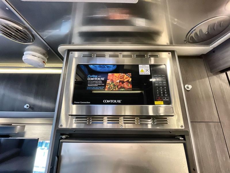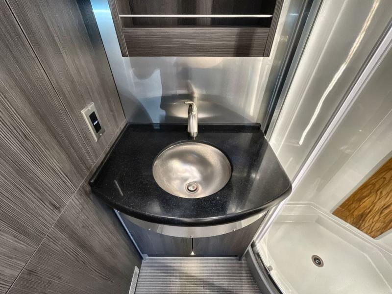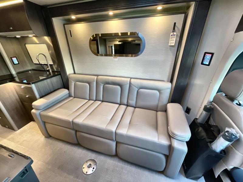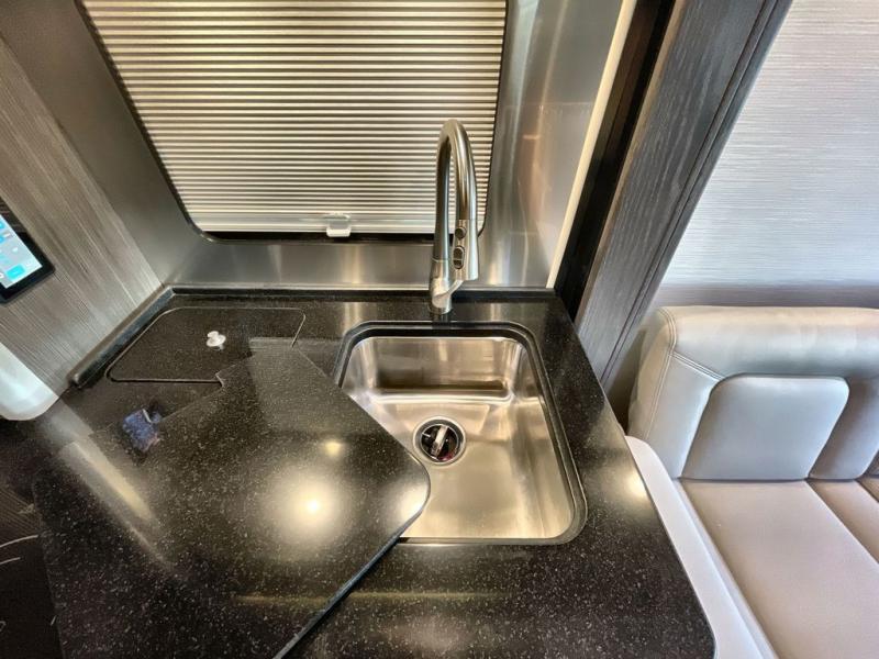 Get ready to explore, unwind and "glamp" where ever you decide! This coach brings you everything you will need, plus much much more! The power slide offers a Murphy suite that retracts and fits seamlessly with the luxury automotive body style. With a touch of a button on the multiplex control panel, you will have more floor space to relax on the reclining sofa that includes two seatbelts or pull down the Murphy bed at night. There is more seating on the captain's chairs that swivel around to face the interior, and there are two tables that adjust to different heights for your needs. The kitchen provides a two-burner gas stove and large stainless steel Kohler sink and faucet, and there is a convection microwave, a slide-out pantry and a refrigerator with a freezer a few steps away.
