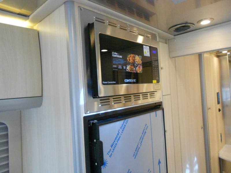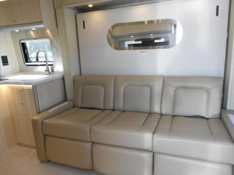 Get ready to explore, unwind and "glamp" where ever you decide! This coach brings you everything you will need, plus much much more! The power slide offers a Murphy suite that retracts and fits seamlessly with the luxury automotive body style. With a touch of a button on the multiplex control panel, you will have more floor space to relax on the reclining sofa that includes two seatbelts or pull down the Murphy bed at night. There is more seating on the captain's chairs that swivel around to face the interior, and there are two tables that adjust to different heights for your needs. The kitchen provides a two-burner gas stove and large stainless steel Kohler sink and faucet, and there is a convection microwave, a slide-out pantry and a refrigerator with a freezer a few steps away.