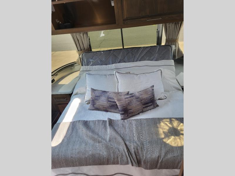 You're going to love this travel trailer that will feel more like home. The spacious full rear bath includes a large closet to hang all your clothes, a residential-style shower, and a heated towel bar you are sure to love. There is a workstation with an Ultraleather desk chair if you need to get some work done, and the media cabinet here houses the 60" projection TV. The chef of the family can prepare meals on the stainless steel three burner cooktop and convection microwave, and everyone can dine at the powered dinette. And you'll feel right at home in the front private bedroom with a power queen bed or optional twin beds!
