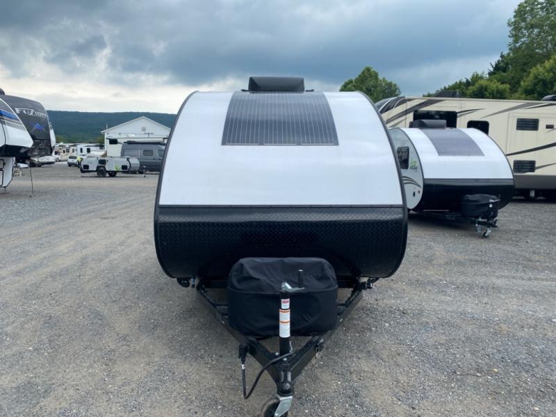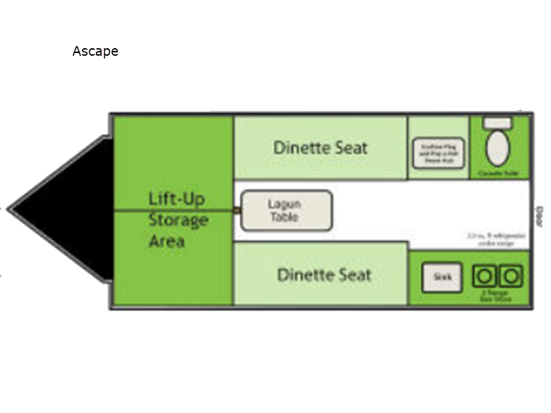 This cute little travel trailer is perfect for two who enjoy the outdoors, but don't need the frills, and just want a dry place to sleep and call home base. Enter at the back to find a 3 cu. ft. 3-way refrigerator/freezer, flush mount sink and a two burner LP cooktop. Across from the kitchen amenities, you'll find a convenient hidden swivel cassette toilet for easy nighttime restroom breaks. The opposing dinette seats with a table between converts to create a 77" x 72" bed at night, and there is lift up storage in front. You will appreciate the outside shower to wash off hiking gear or freshen up and there is also an LP connection and dual tanks with a cover.