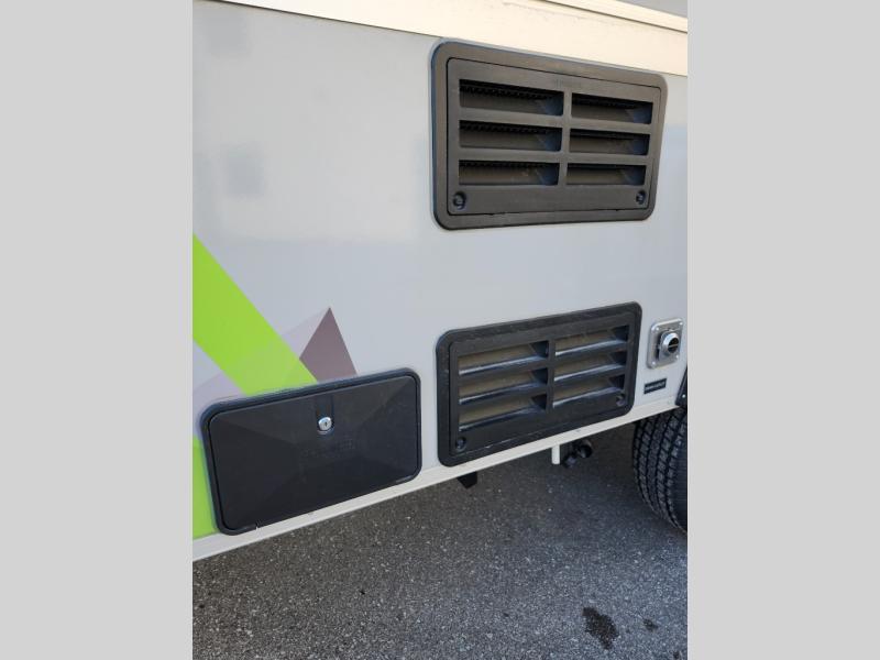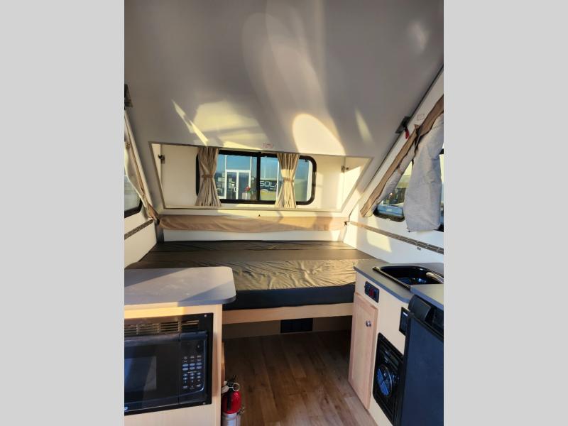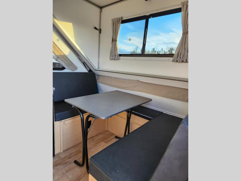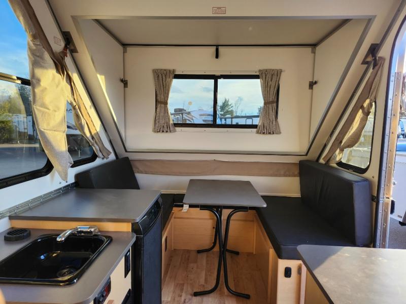 Camping has never been easier than in this A-frame camper. Once you arrive at your destination, grab your gear from the two exterior baggage doors, then head inside to make lunch on the two burner in/out stove. The sofa bed can convert to a 60" x 76" bed, and the dinette converts to a 46" x 76" bed for comfortable sleeping space at night. You will find under-dinette storage for your belongings, plus two shelves on either side of the sofa bed.
