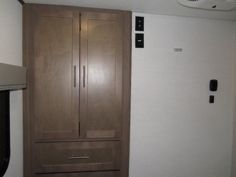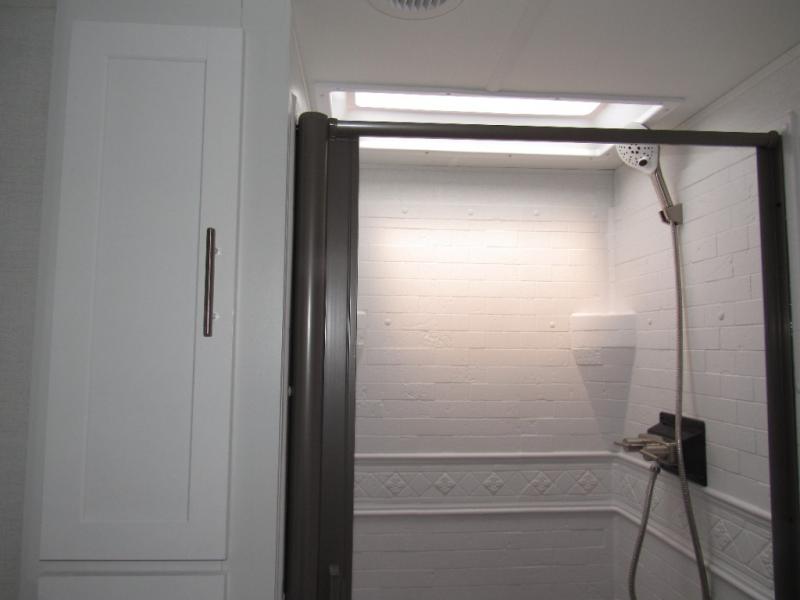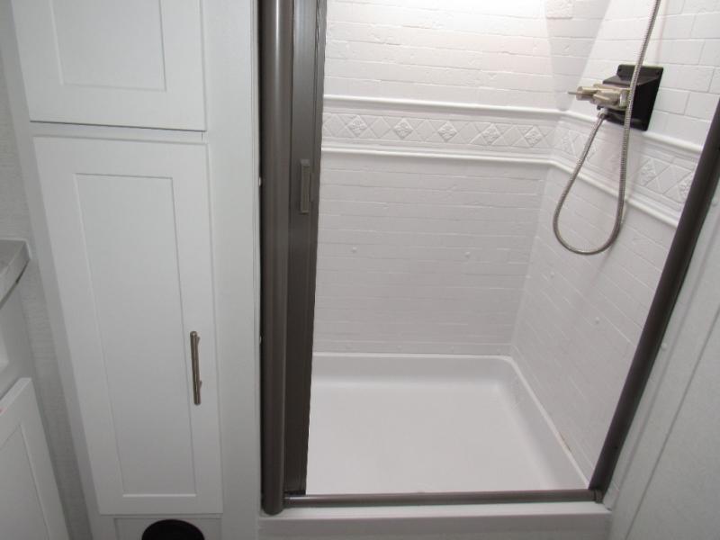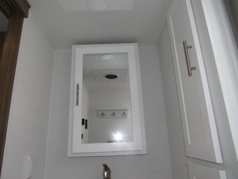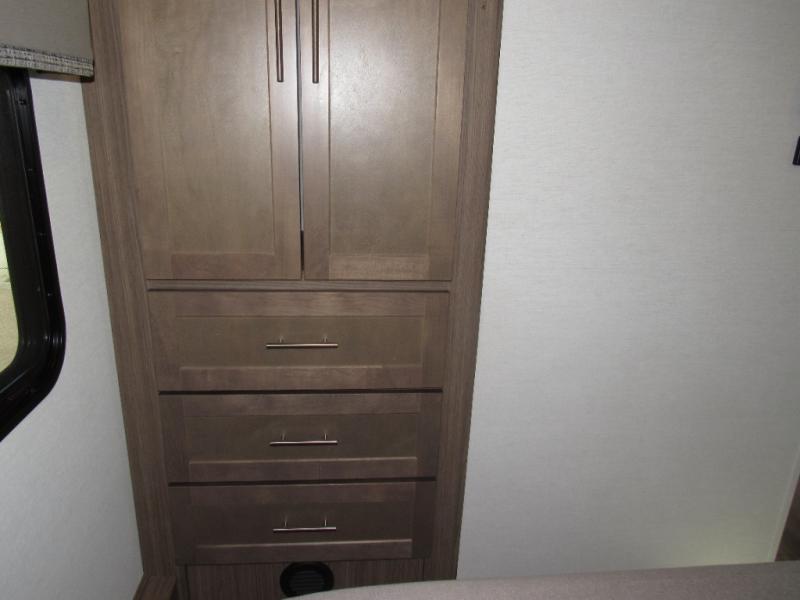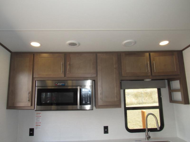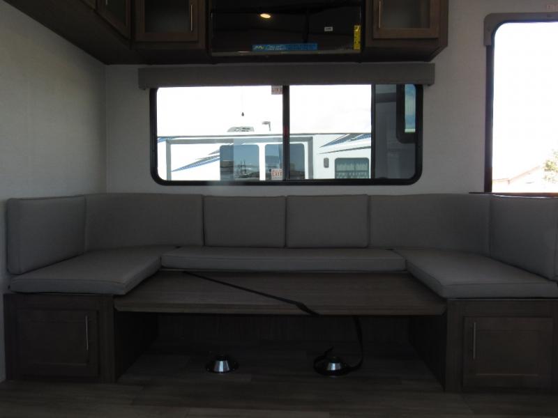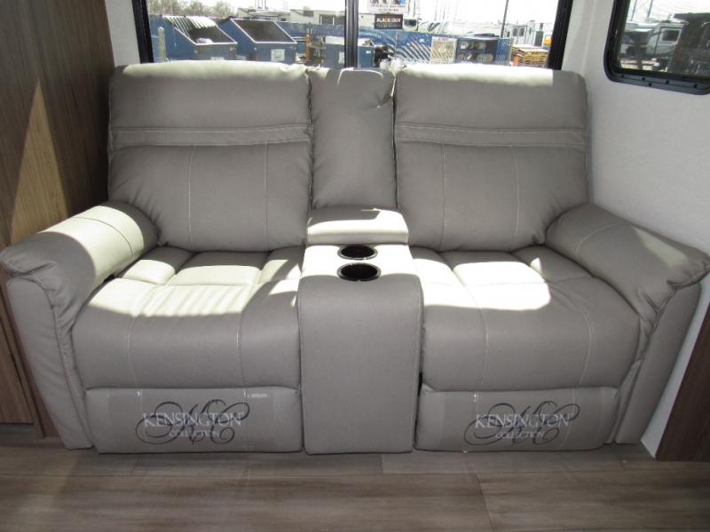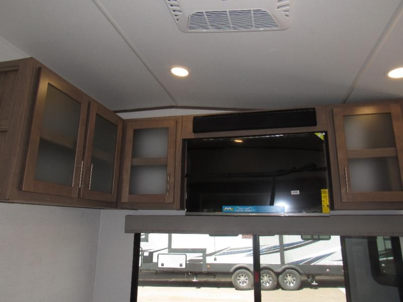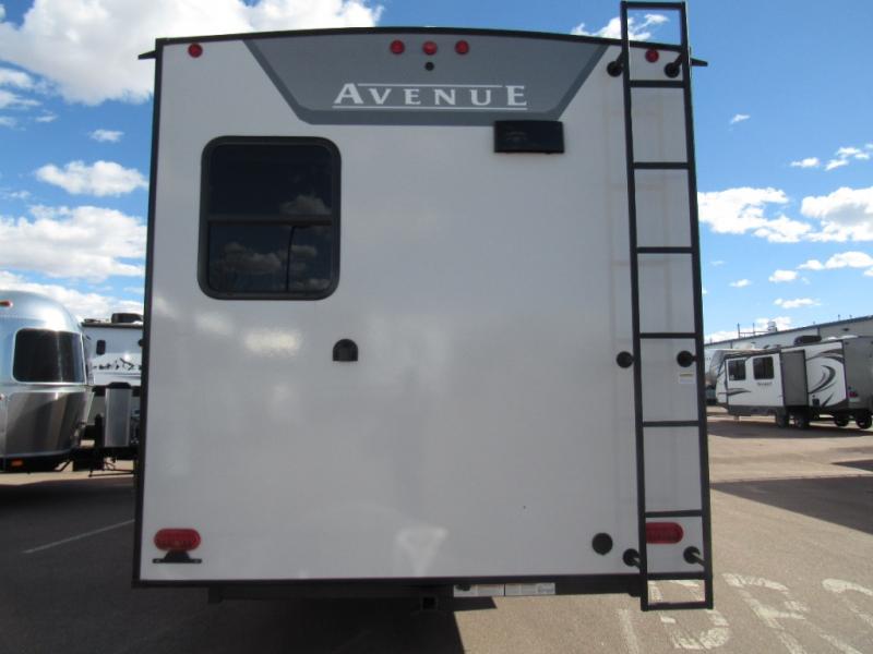 If you are looking for a rear kitchen layout then check this Avenue All-Access fifth wheel out! You will love the large U-shaped dinette to enjoy your meals at, or when just hanging out. The combined living room and rear kitchen area is spacious thanks to a large slide which houses dual reclining theater seats and the 10 cu. ft. 12V refrigerator and pantry. You can easily view the swing mount 40" Class HDTV from the theater seating. In front, you will find a spacious side aisle bath including a 30" x 36" shower, toilet, vanity with a sink and medicine cabinet, plus linen storage as well. You will feel right at home in the front private bedroom that includes a walk-around queen bed, dual nightstands and overhead storage for special belongings.
