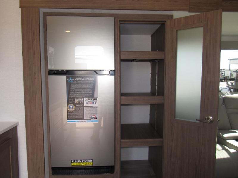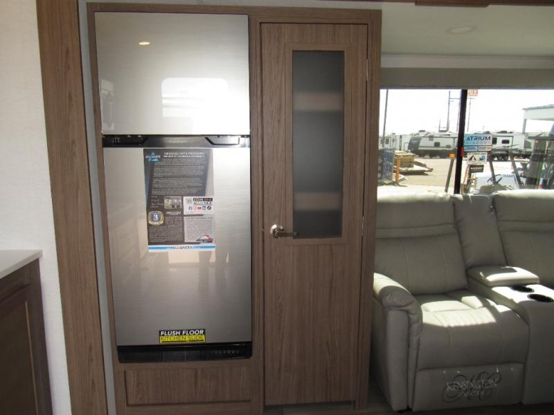 A benchmark chassis creates a space saver upper deck with each one of these Avenue All-Access fifth wheels by Alliance RV! The 101 in. wide-body construction gives you more room to walk around and the flush slide out floors throughout prevent any tripping. There are Azdel composite sidewalls inside and out, and a seamless fully walkable PVC roof for extreme durability and zero maintenance. You are sure to love the "no carpet zone" making each Avenue easy to clean and allergen free, not to mention pet friendly with vinyl flooring throughout. You can maximize your space throughout with innovative storage solutions like the hidden storage behind the TV, inside the end tables, ottoman, and dinette chairs. There are a few available options you might like to add to further customize your fifth wheel, like the optional second 13.5K A/C or the optional Solar Package for off-grid camping capabilities!