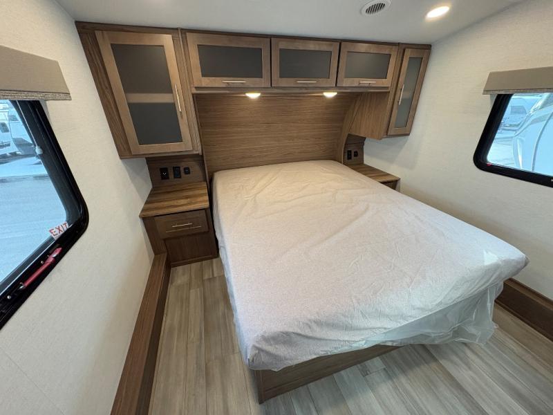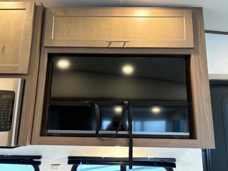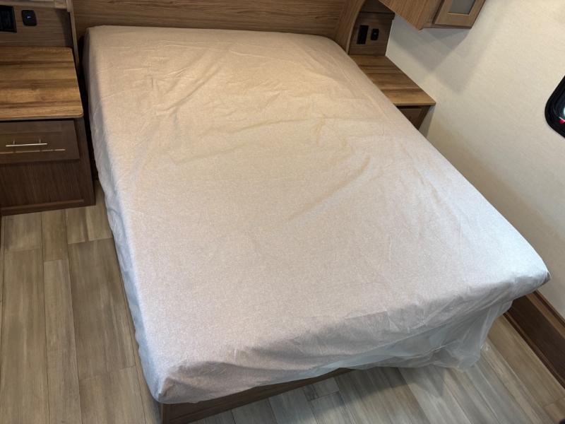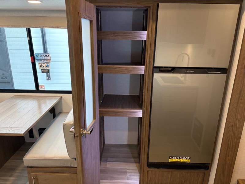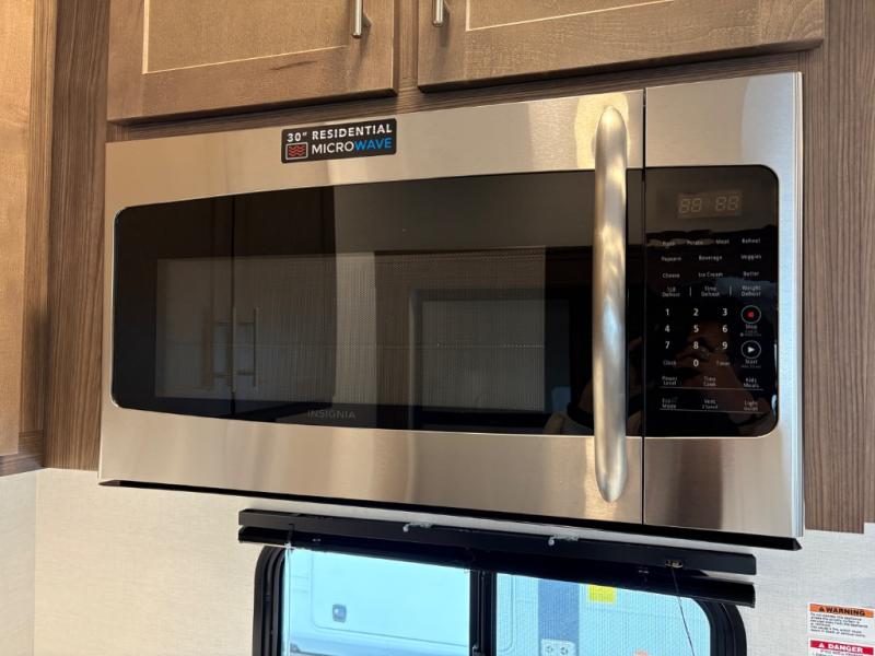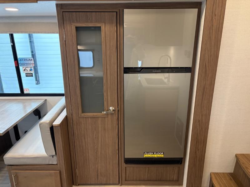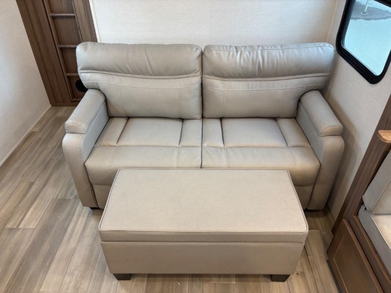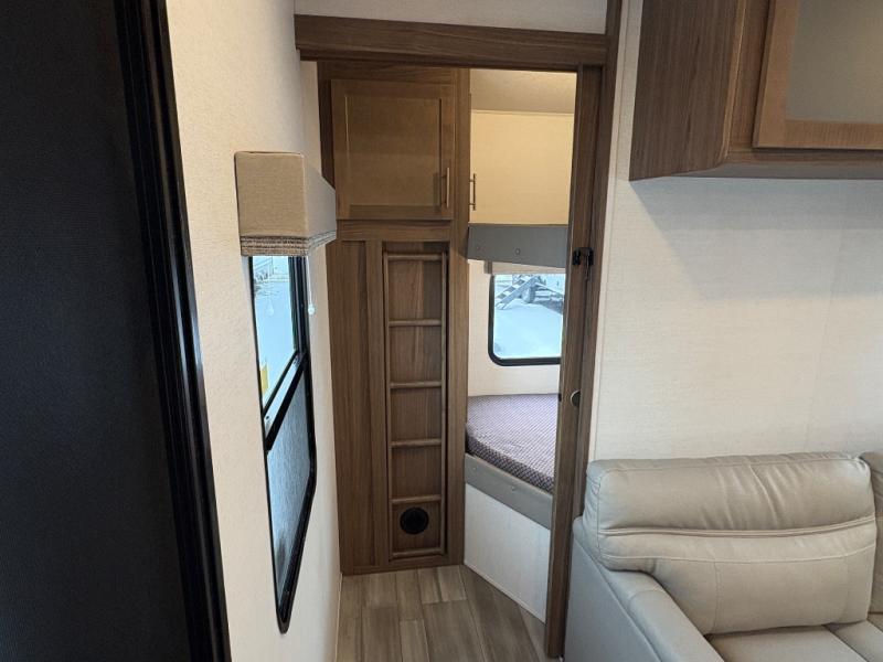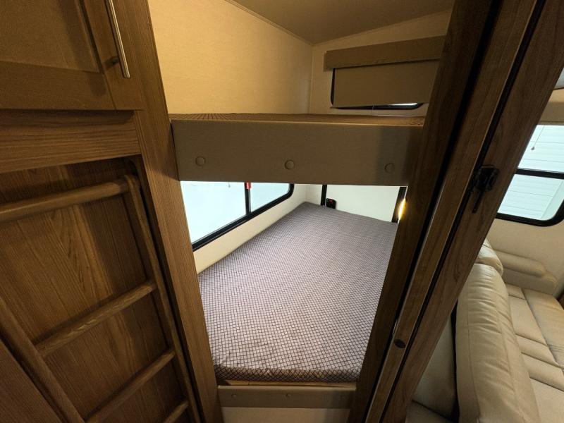 Your family will enjoy traveling in this bunk model including two 42" x 74" bunks featuring storage beneath that can be accessed from outside using the bike storage door, or by lifting up the lower hinged bunk from inside. The combined living room and kitchen area is spacious thanks to the large slide which houses the floating dinette table, the 10 cu. ft. 12V refrigerator, and pantry. There is more seating adjacent to this slide. Here you will find a sofa, and all seating can easily view the swing mount 40" Class HDTV. In front, you will find a spacious side aisle bath including a 30" x 36" shower, toilet, vanity with a sink and medicine cabinet, plus linen storage as well. And don't overlook the front private bedroom with a walk-around queen bed, dual nightstands, plus a bedroom closet to keep your clothes wrinkle-free!