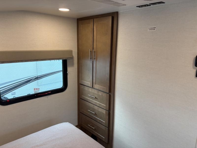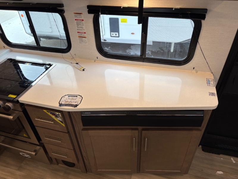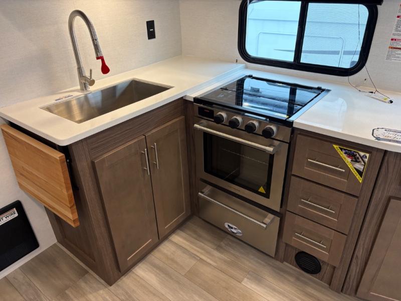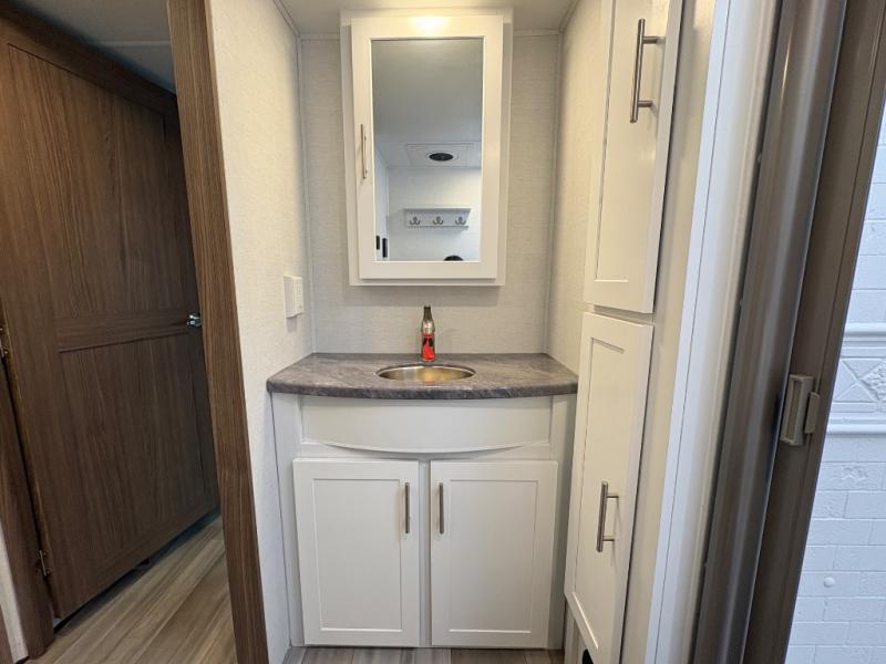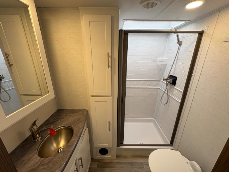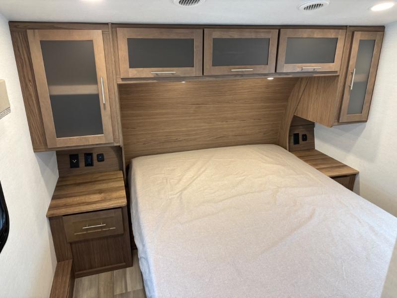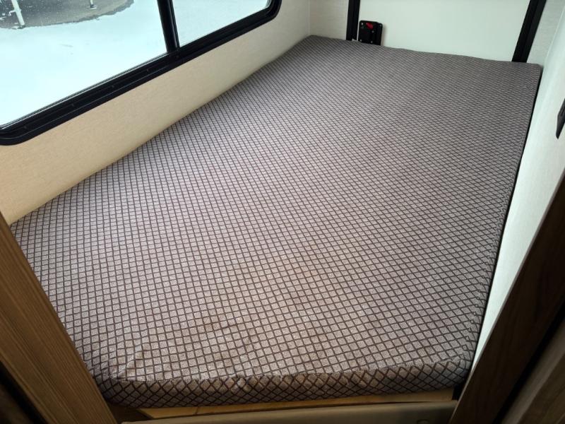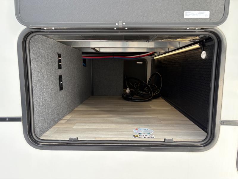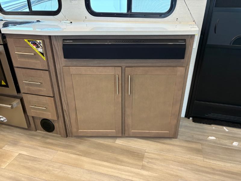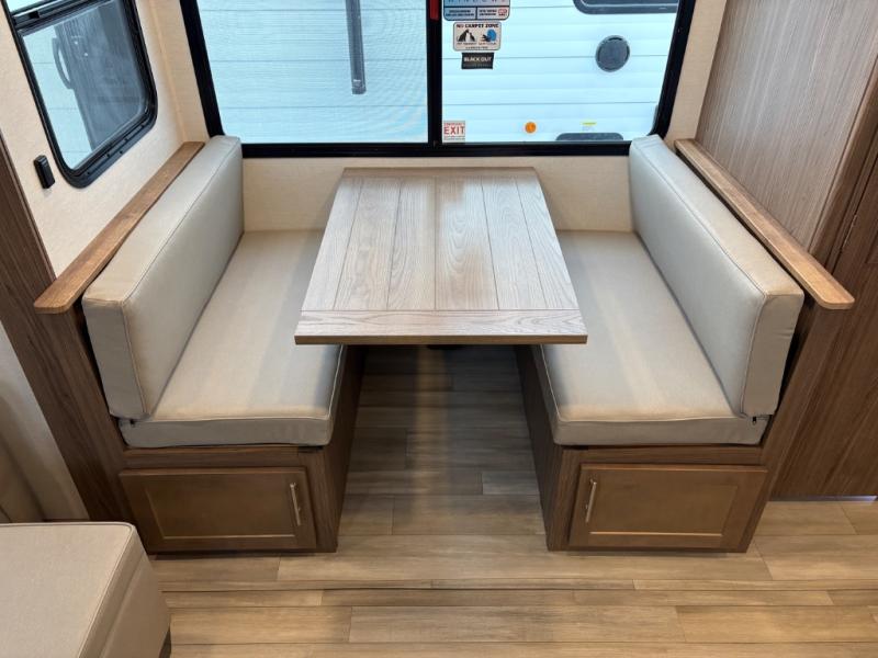 Your family will enjoy traveling in this bunk model including two 42" x 74" bunks featuring storage beneath that can be accessed from outside using the bike storage door, or by lifting up the lower hinged bunk from inside. The combined living room and kitchen area is spacious thanks to the large slide which houses the floating dinette table, the 10 cu. ft. 12V refrigerator, and pantry. There is more seating adjacent to this slide. Here you will find a sofa, and all seating can easily view the swing mount 40" Class HDTV. In front, you will find a spacious side aisle bath including a 30" x 36" shower, toilet, vanity with a sink and medicine cabinet, plus linen storage as well. And don't overlook the front private bedroom with a walk-around queen bed, dual nightstands, plus a bedroom closet to keep your clothes wrinkle-free!