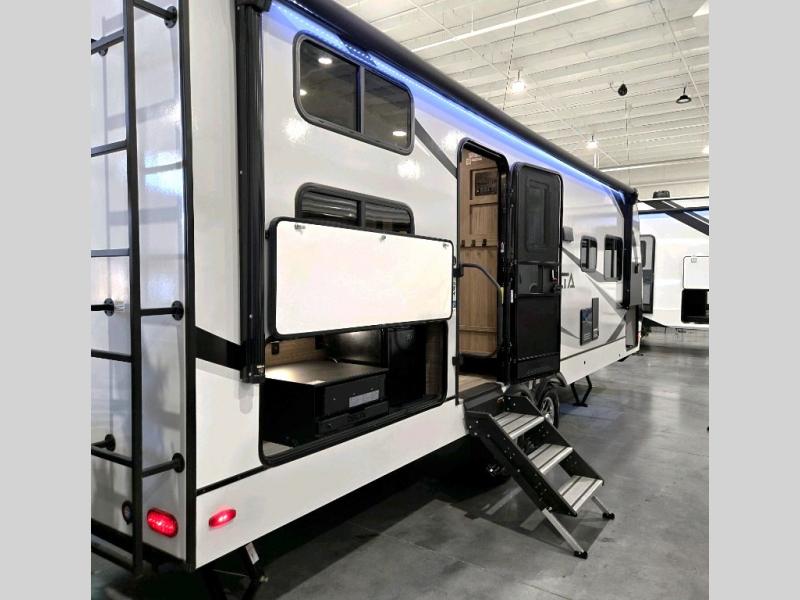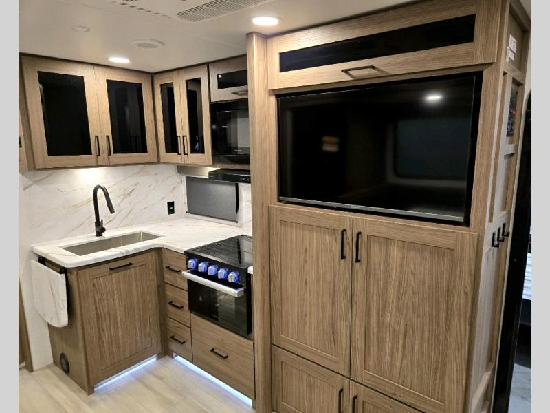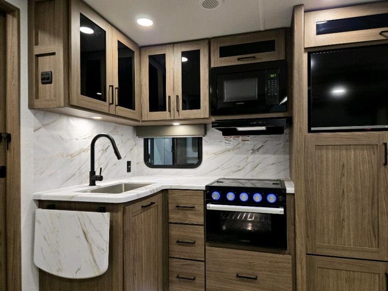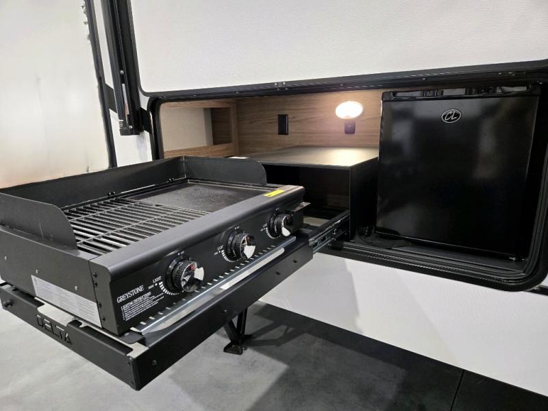 Sleeping for eight is easy in this new Delta travel trailer with a set of 46" x 75" rear corner bunks, a queen bed in the front private bedroom, and also using the U-shaped dinette once converted. The front bedroom features plenty of storage with large overhead cabinets as well as within bedside wardrobes and nightstands for your personal items. You can easily prepare all of your favorite meals and snacks with the kitchen amenities provided. A three burner range allows you to easy cook indoors, or you can enjoy cooking outside using the outdoor griddle/grill if you like. There is a 10 cu. ft. refrigerator to keep all of your perishables and drinks nice and cold, plus a large sink for dishes and cleaning up, as well as a pull-out trash can and flip-up counter extension. You will also appreciate the rear corner bath featuring a 30" x 36" shower, vanity with sink, and soft close porcelain toilet with foot flush.