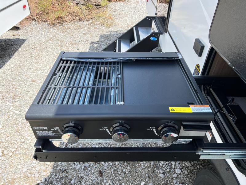 You will love all of your adventures with this Delta travel trailer in tow! This unit is perfect for a couple or even a family of four or six with a queen bed in the front private bedroom, and also using the sofa and U-shaped dinette once converted for more sleeping space. The U-shaped dinette is great for gathering for meals, a board game or game of cards, and the sofa is directly opposite a 40" HDTV which makes viewing enjoyable. You can easily prepare all of your favorite meals and snacks with the kitchen amenities provided inside. A three burner range allows you to easily cook indoors, or you can cook outside using the outdoor griddle/grill if you like. There is a 10 cu. ft. 12V refrigerator to keep all of your perishables and drinks nice and cold, plus a large sink for dishes and cleaning up, and a convenientpull-out trash can and flip-up counter extension as well. You will also appreciate the full rear bath featuring a 30" x 36" shower, toilet, vanity with sink, and linen cabinet for your towels and toiletries.