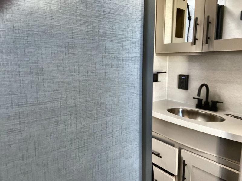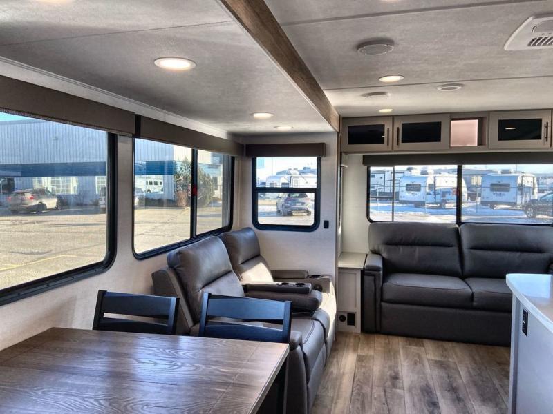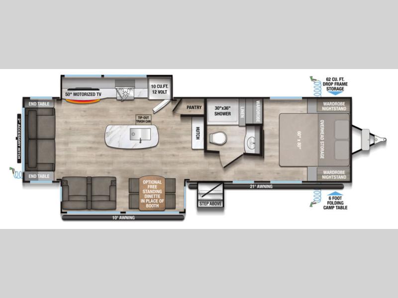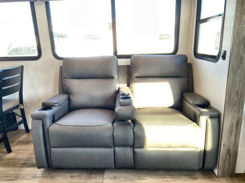You will feel right at home camping in this travel trailer! The rear living area has a rear sofa and a set of theater seating conveniently across from the entertainment center with a 50" class HDTV above a pull-out fireplace storage for a cozy evening indoors. Prepare your best home cooked meals with the three burner cooktop, kitchen island which even has a tip-out trash can, and 10 cu. ft. 12V refrigerator. Enjoy your meals at the free standing dinette then either freshen up in the full bathroom with the 30" x 36" shower or head outside to relax under one of the two awnings. The front private bedroom has a queen bed for you to lay your head on at night and has wardrobe nightstands for your items!
