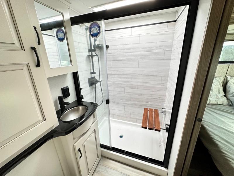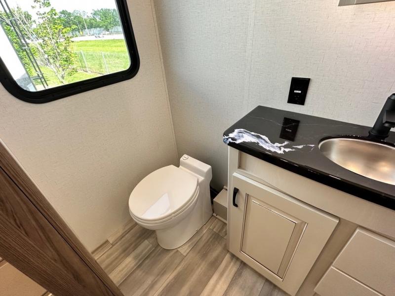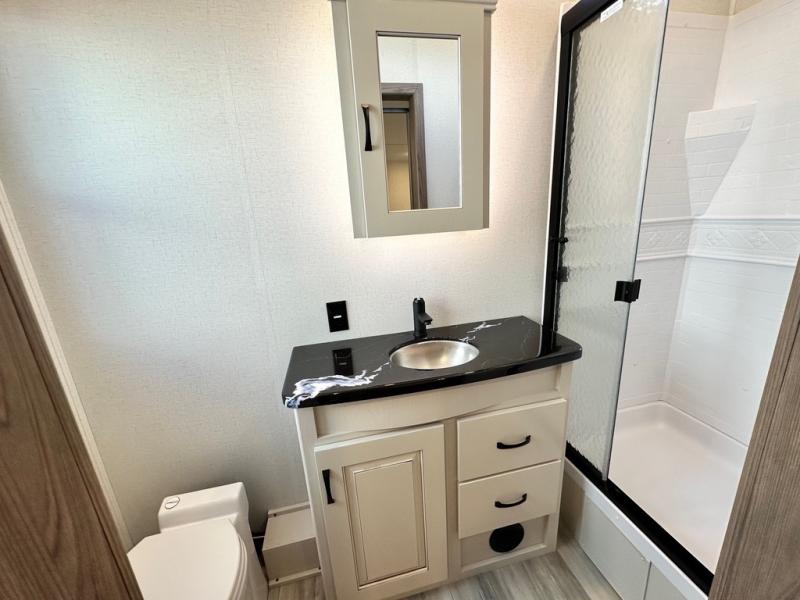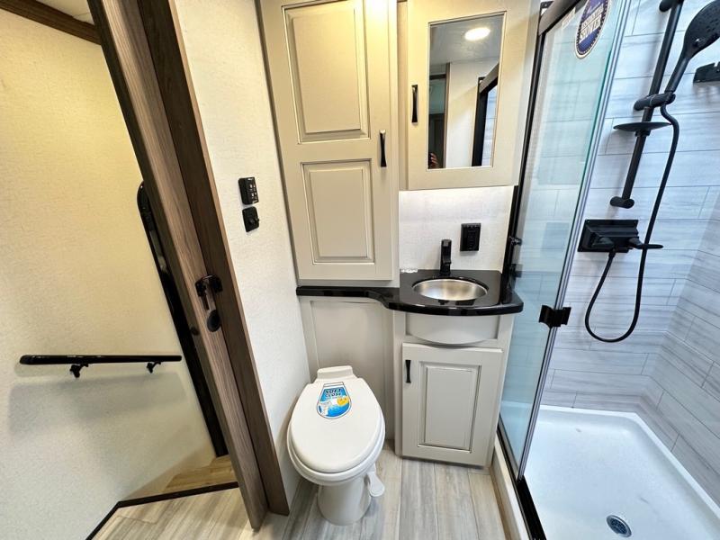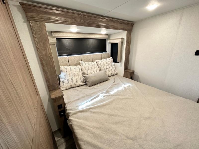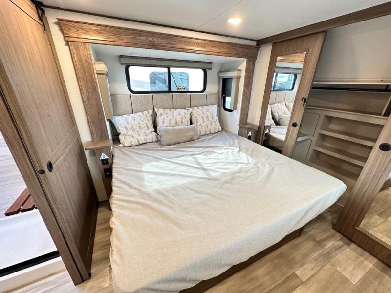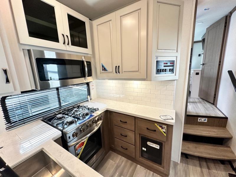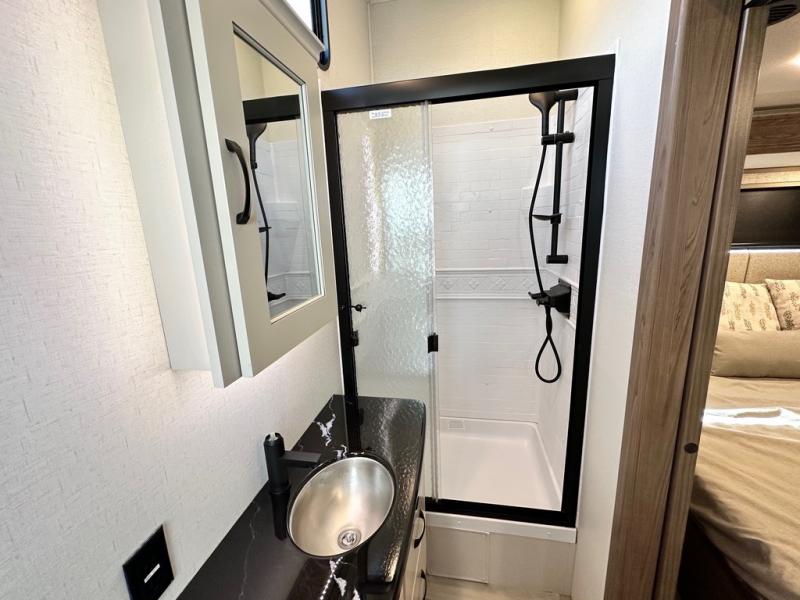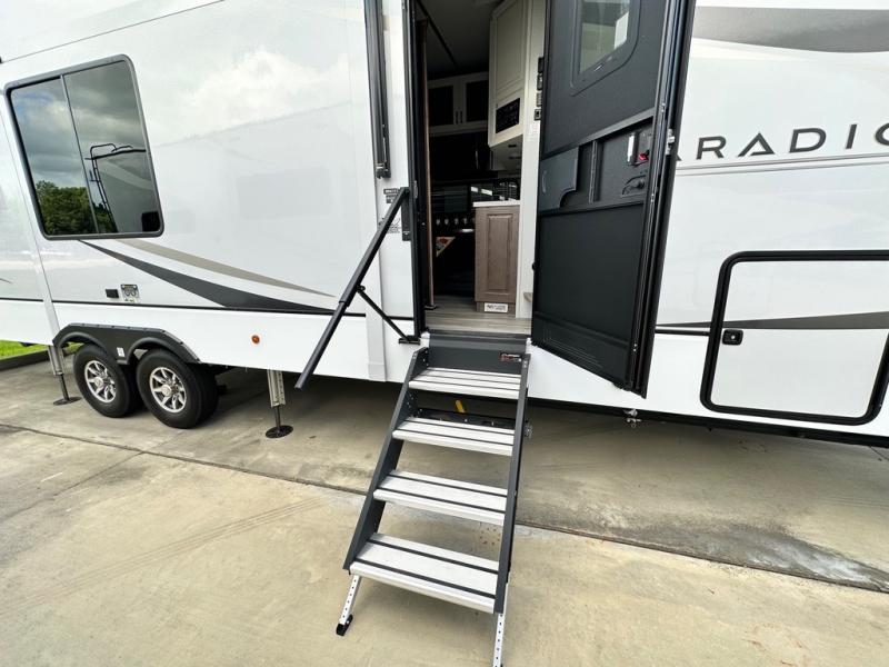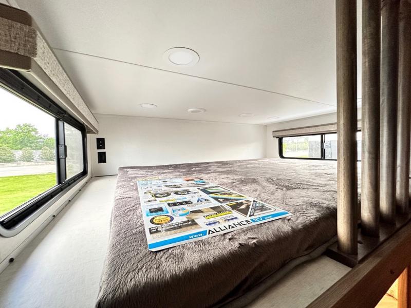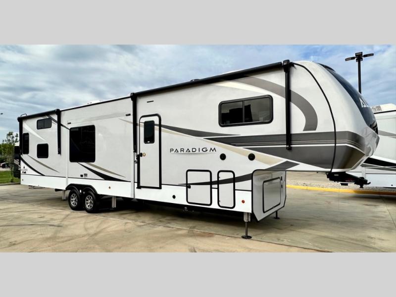 The Paradigm fifth wheels by Alliance RV are functional, high-quality, and luxurious for an unforgettable camping experience. There are three A/C units and a 40K BTU furnace to keep you comfortable year around, and you'll appreciate additional convenient amenities, like the all-in-one enclosed/heated utility center and the color coded and numbered wiring. A Rota-Flex pin box comes standard for hassle-free towing, along with Super-G 4,400 lb. rated tires and Dexter 7,000 lb. axles. You'll love the kitchen with its LG solid surface countertops and Insignia range, plus there is LED motion lighting in the pantry and a Maxx fan with a rain sensor to keep everything fresh when making dinner. Each model also includes an HD Smart TV in the living room and bedroom, plus a Winegard Air 360 antenna to keep you connected to the outside world. And of course there are a variety of options you can choose from to further customize your fifth wheel; dual pane windows, Super Solar Plus, slide out awning toppers, and generator prep or a generator to name a few!
