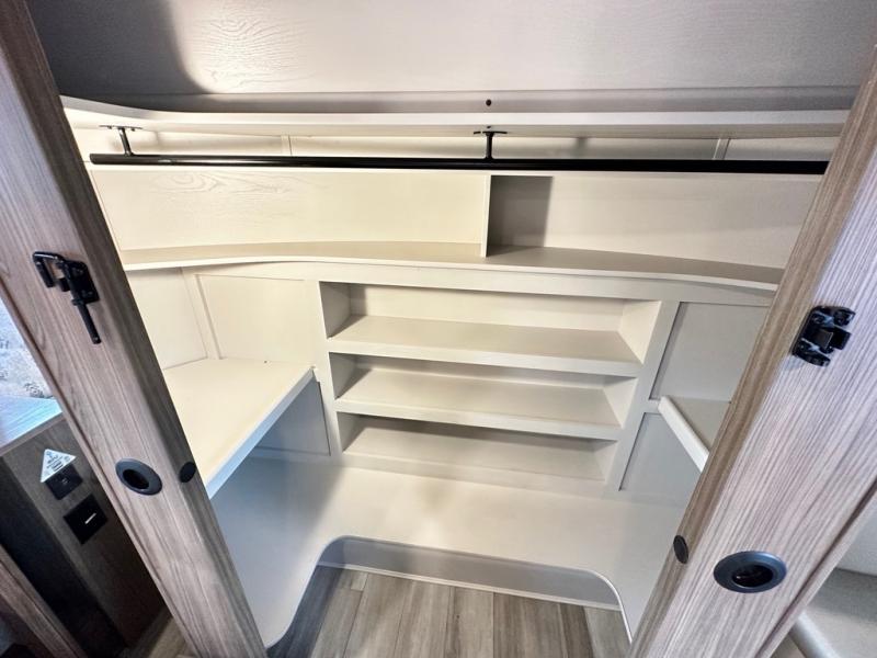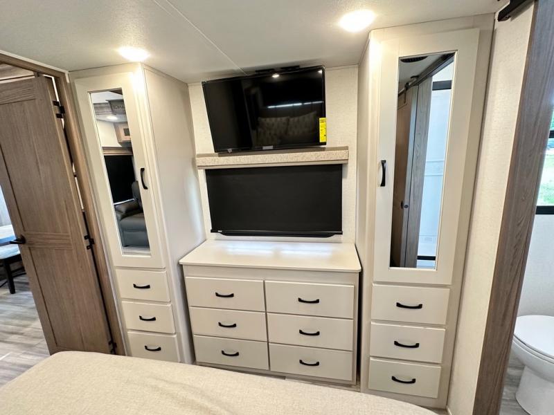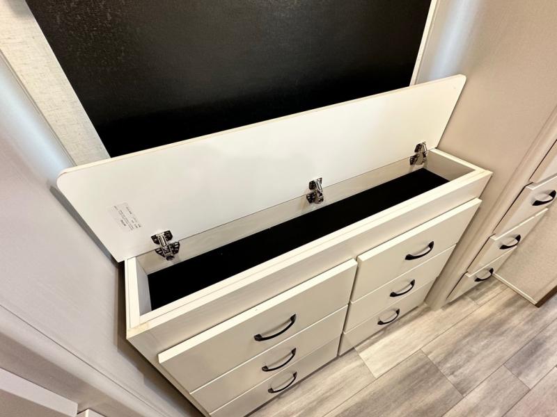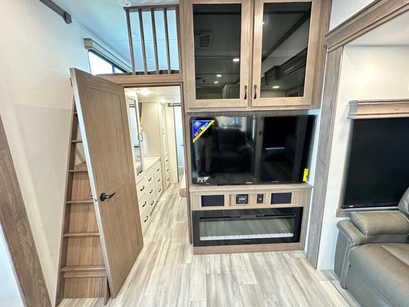 A spacious unit with sleeping for eight with plenty of choices to suit everyone! There is a front private bedroom with a king size bed that offers a large full front closet that has also been prepped for a washer and dryer if you choose that option. The front bath features a 40" x 30" shower and dual entry. Head down to the kitchen and living space at the bottom of the stairs to find a curbside slide that houses the 19 cu. ft. residential refrigerator, a pantry, and a dinette with four chairs. As you continue on toward the rear of this coach, you will find a spacious living area along the roadside with a 50" Smart TV and a fireplace, a sofa sleeper slide, and a dual reclining loveseat. This makes a great gathering place for television watching, game playing, and even added sleeping space if needed at night. The rear private bedroom with its own private bath features a queen bed, two closets, and a Smart TV as well. The multipurpose loft area above can be accessed just before this rear bedroom entry by a ladder, and it is perfect for extra storage, or it can be used for added sleeping that the kiddos are sure to love.